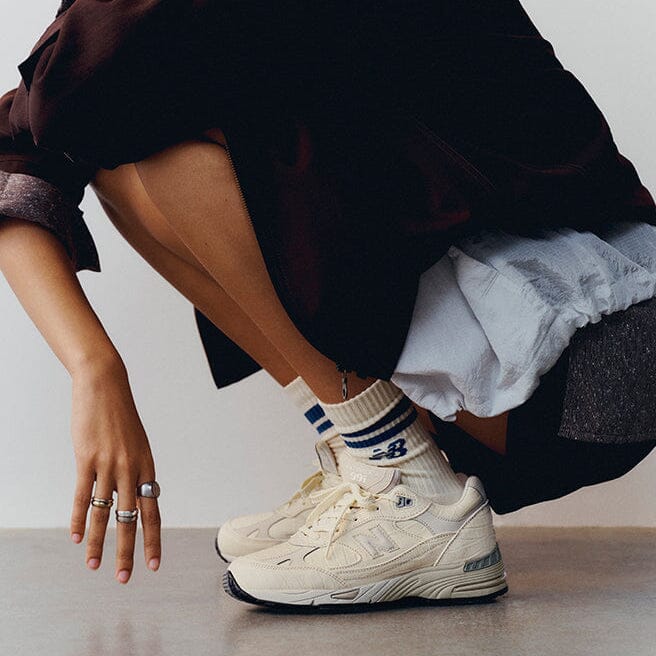 La 991 è la Sneaker iconica di New Balance dal comfort eccezionale, qui proposta in pelle con effetto stampa cocco di colore bianco latte. Lacci in nuance. Ammortizzazione ABZORB® nella parte centrale del piede per un assorbimento eccezionale degli shock da impatto. Suola in gomma soffiata.