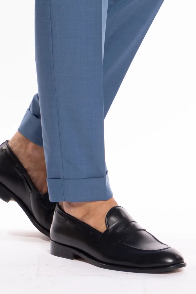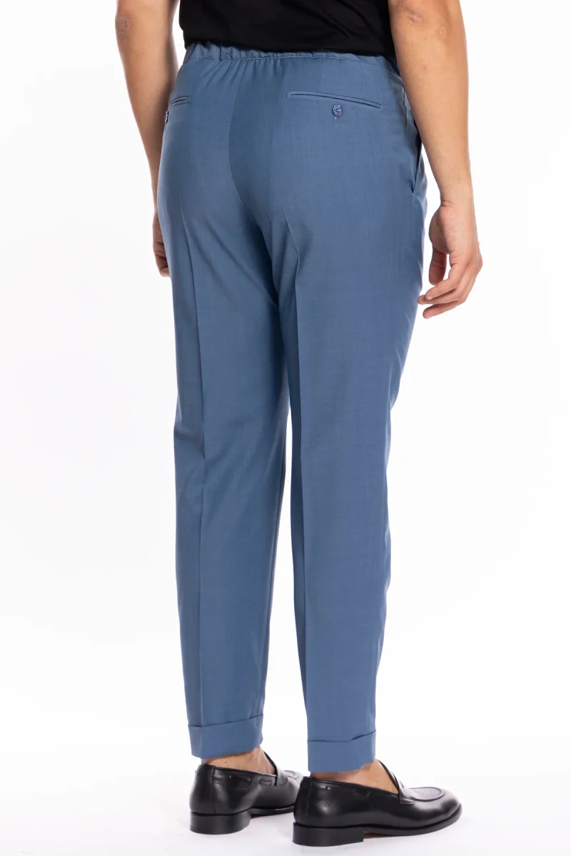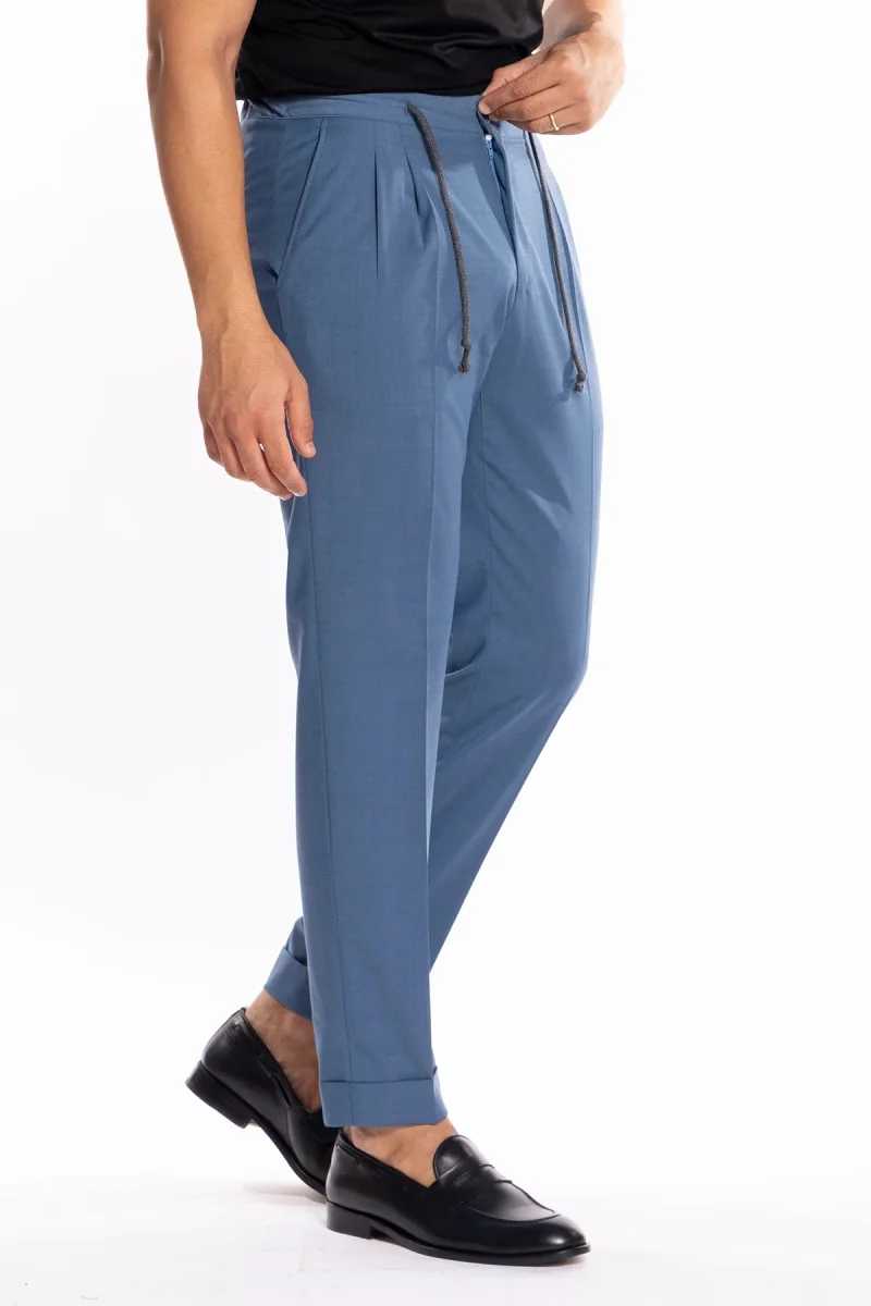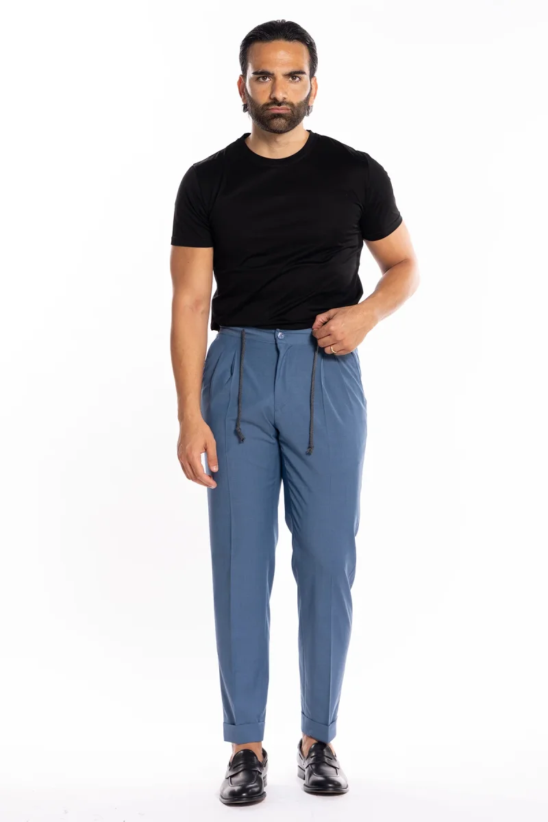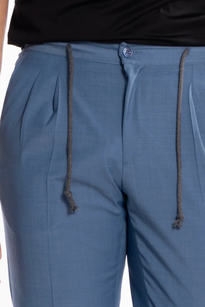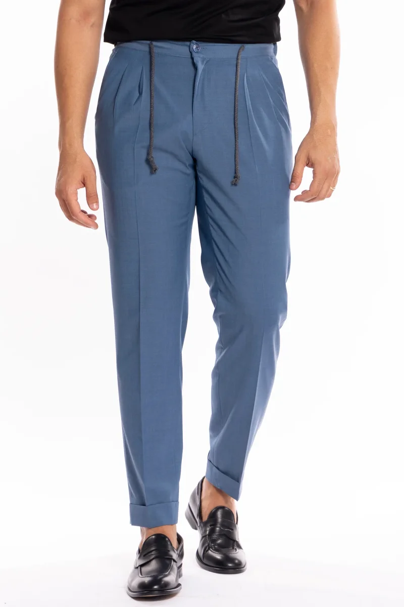 Pantalaccio da uomo Azzurro doppia pinces in misto fresco lana tasca america risvolto 5cm con laccio regolabile