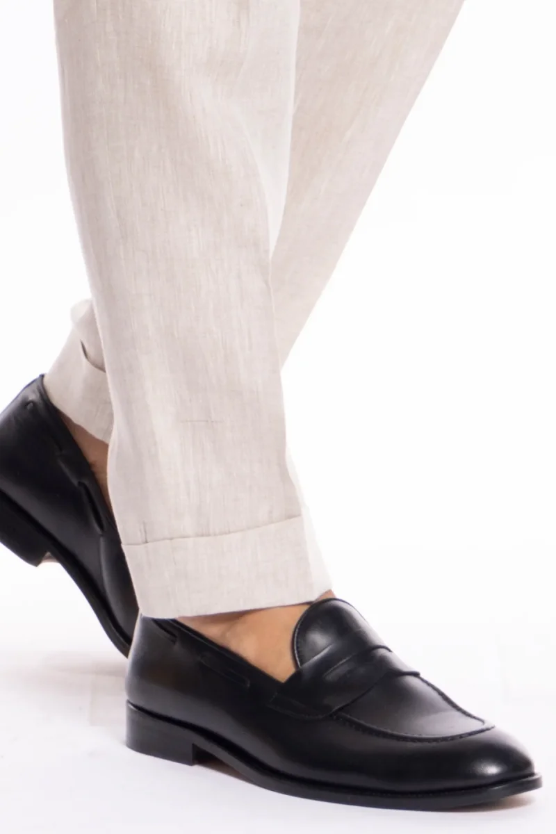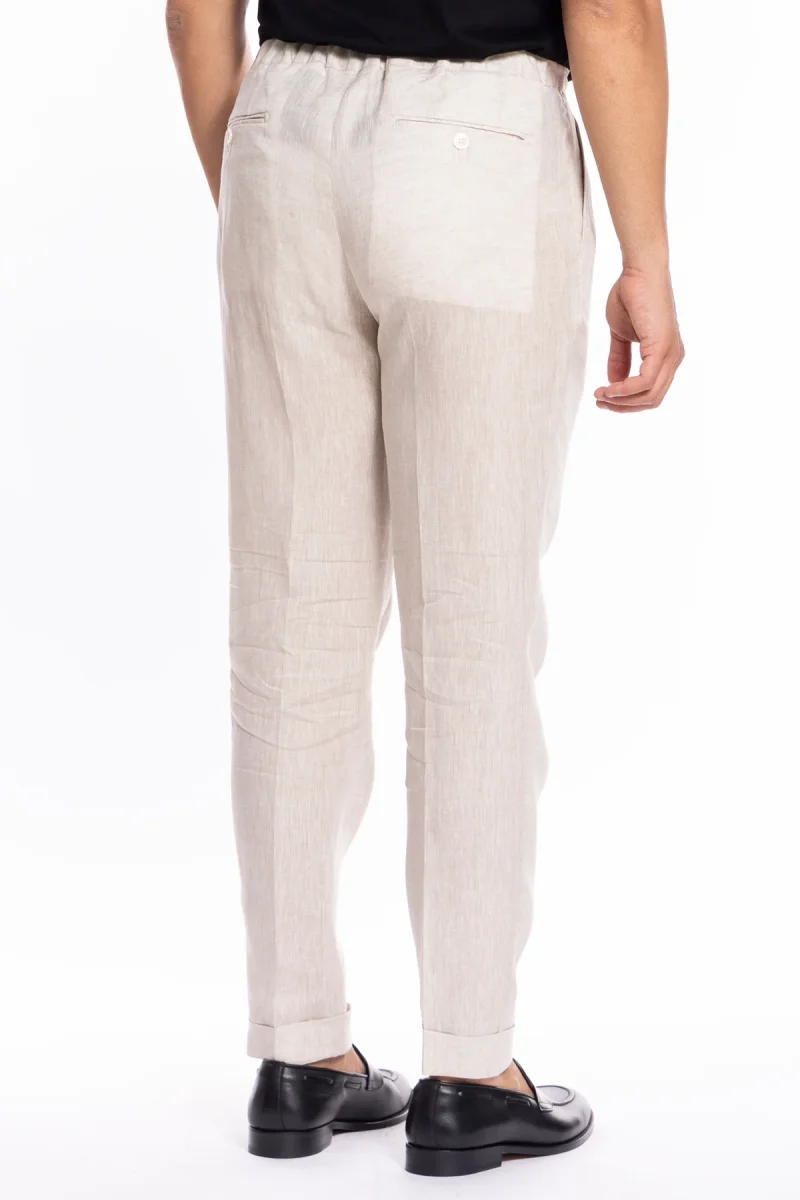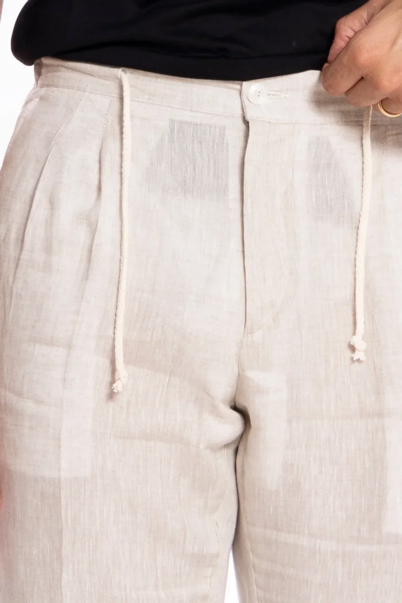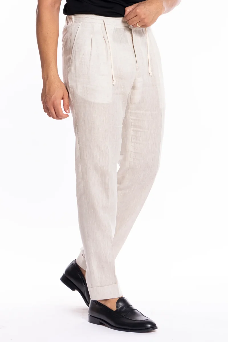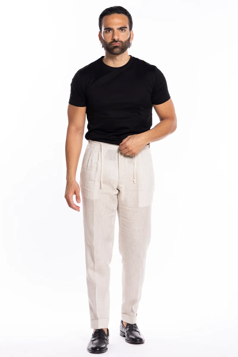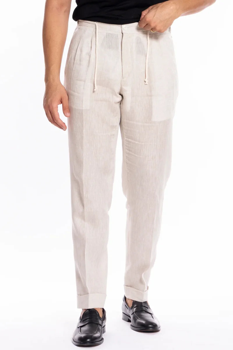 PANTALACCIO DA UOMO BEIGE IN LINO 100% DOPPIA PINCES IN MISTO FRESCO LANA TASCA AMERICA RISVOLTO 5CM CON LACCIO REGOLABILE