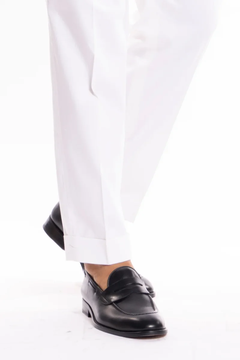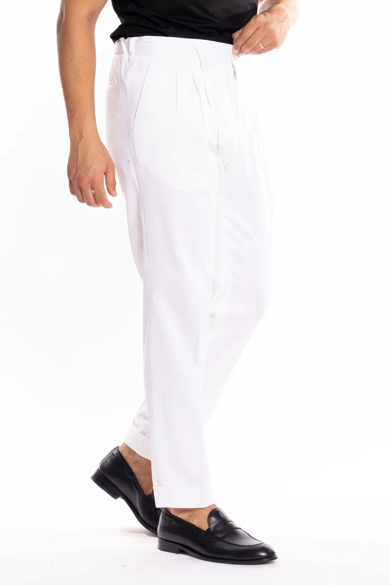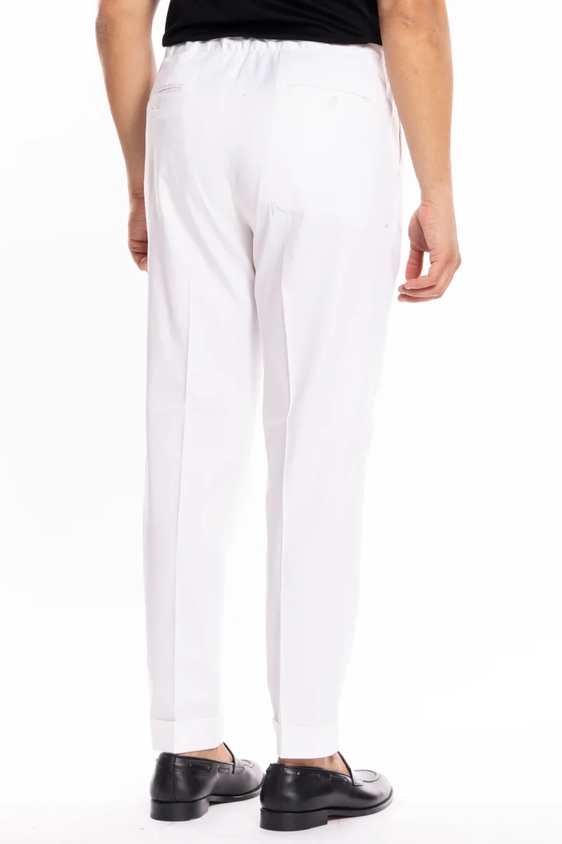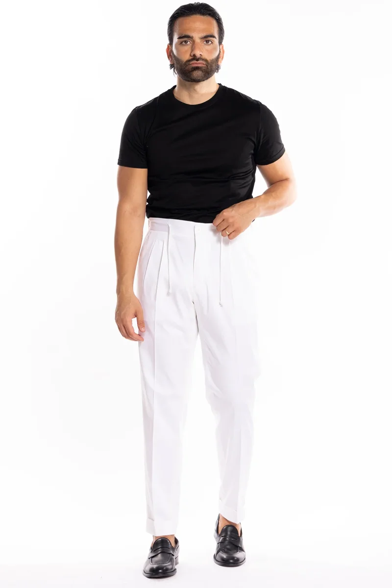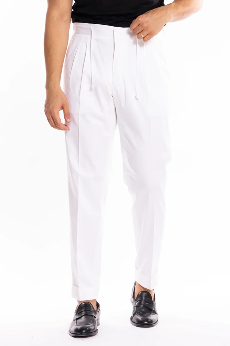 Pantalaccio da uomo Bianco in cotone leggermente elastico doppia pinces tasca america risvolto 5cm con laccio regolabile