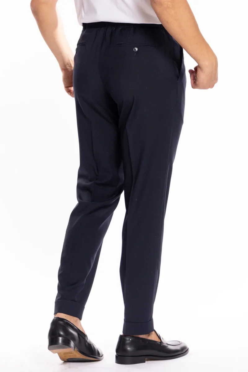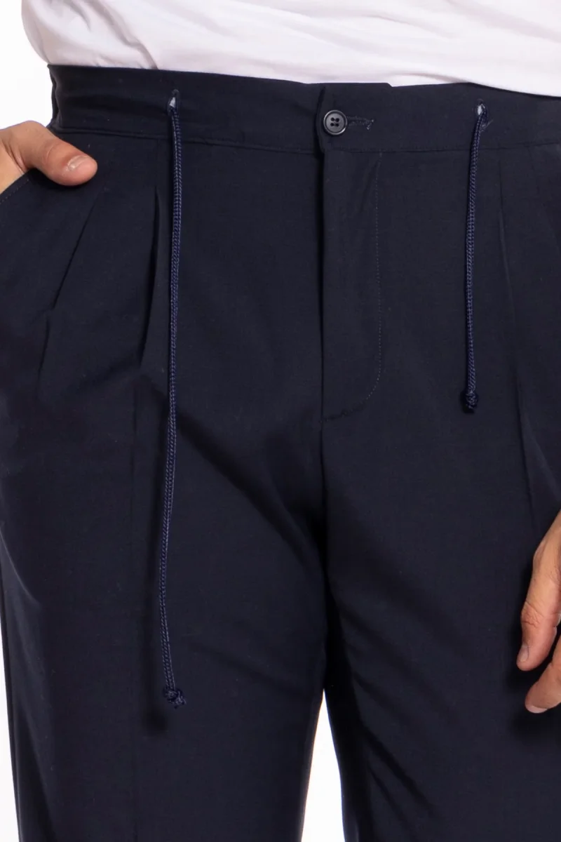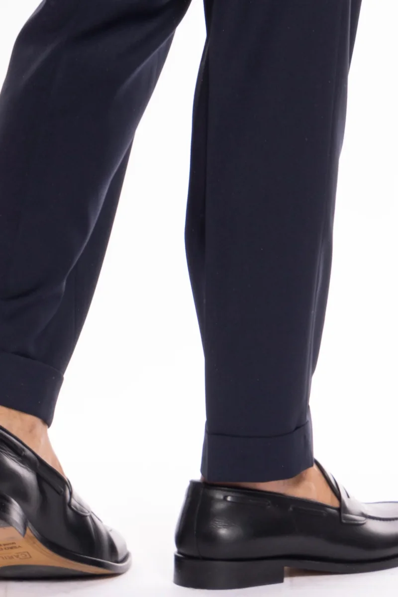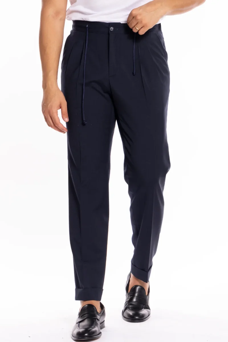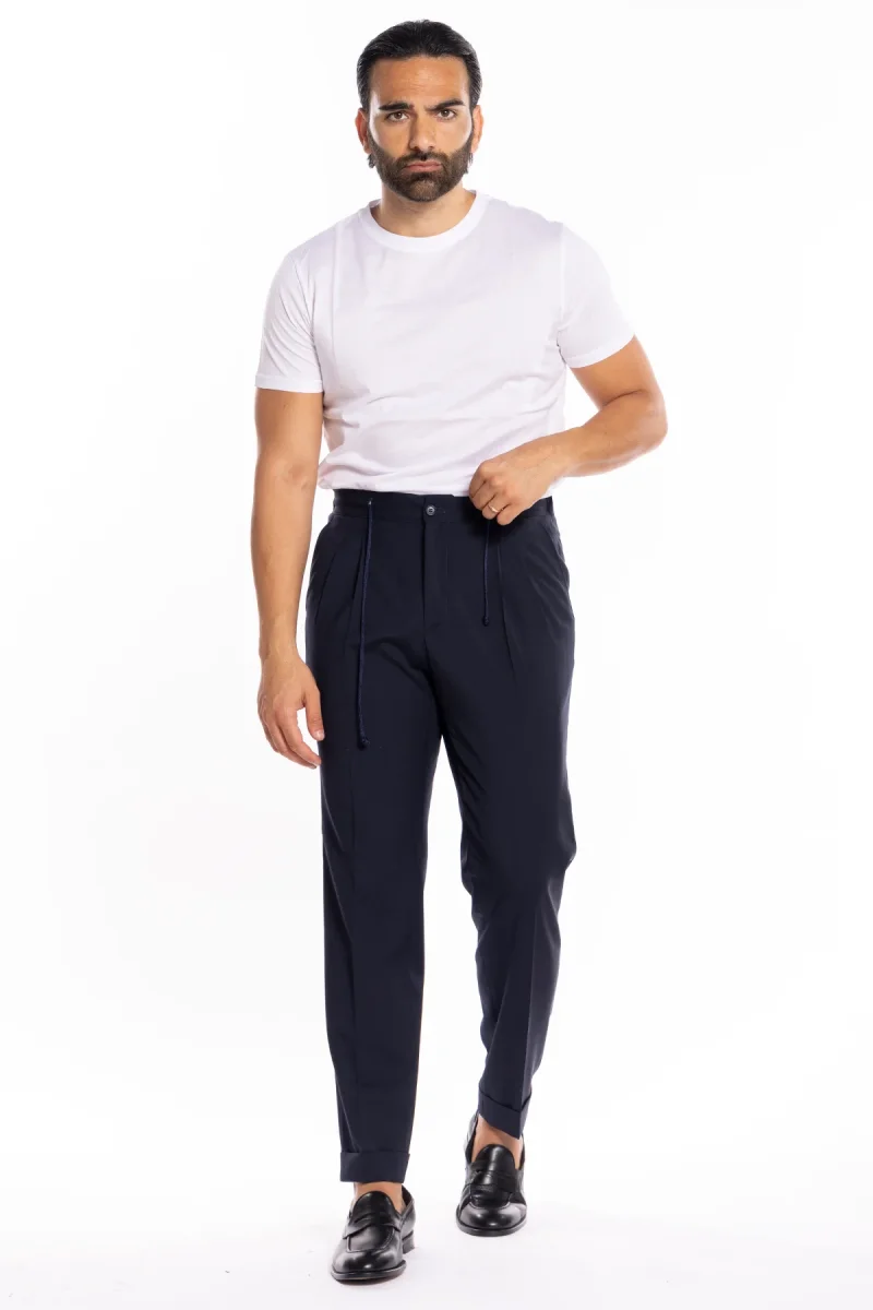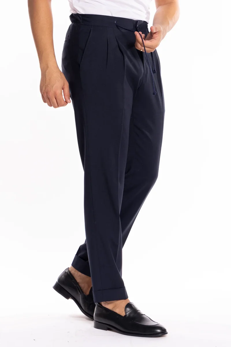 PANTALACCIO DA UOMO BLU SCURO DOPPIA PINCES IN MISTO FRESCO LANA TASCA AMERICA RISVOLTO 5CM CON LACCIO REGOLABILE