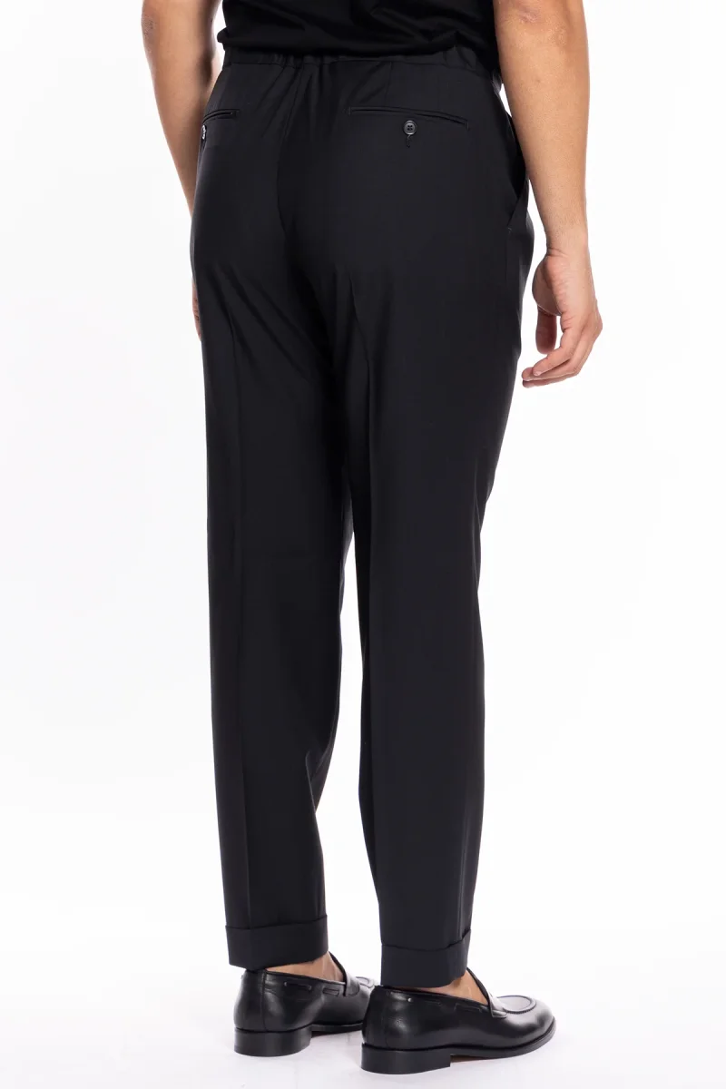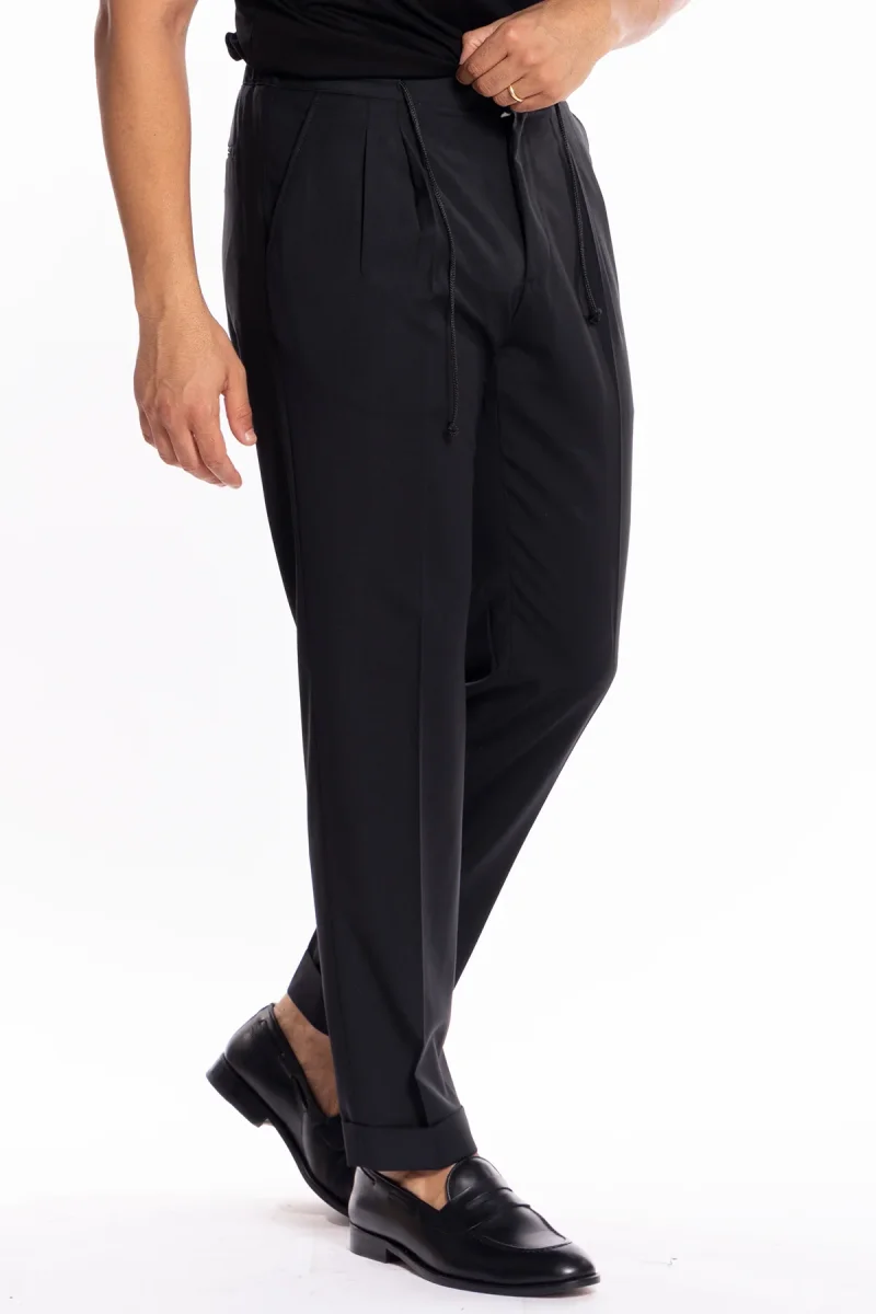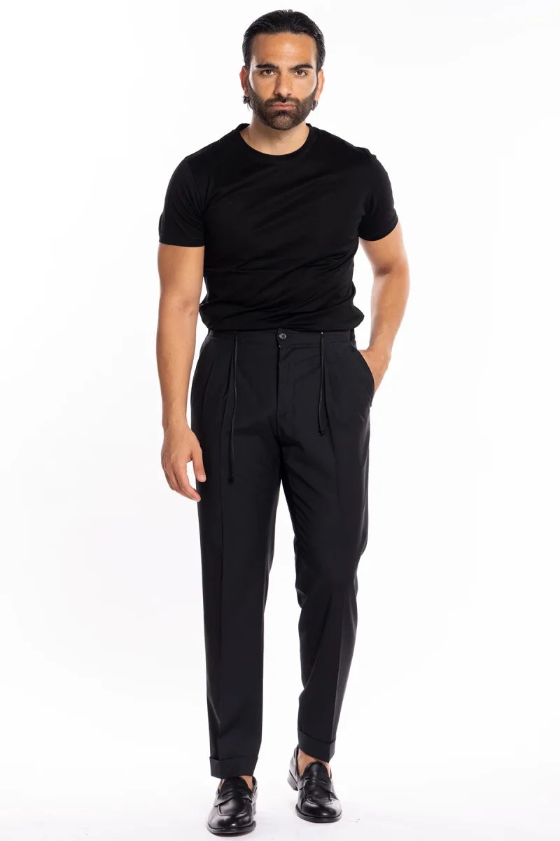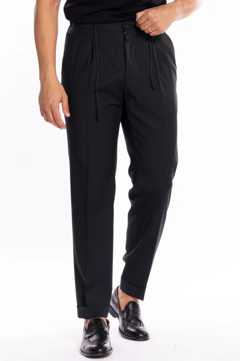 PANTALACCIO DA UOMO NERO DOPPIA PINCES IN MISTO FRESCO LANA TASCA AMERICA RISVOLTO 5CM CON LACCIO REGOLABILE