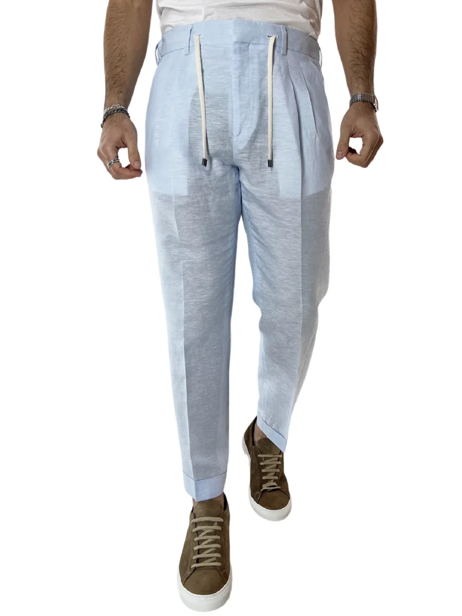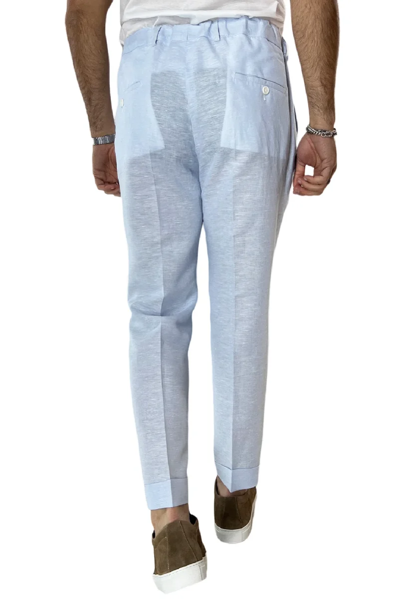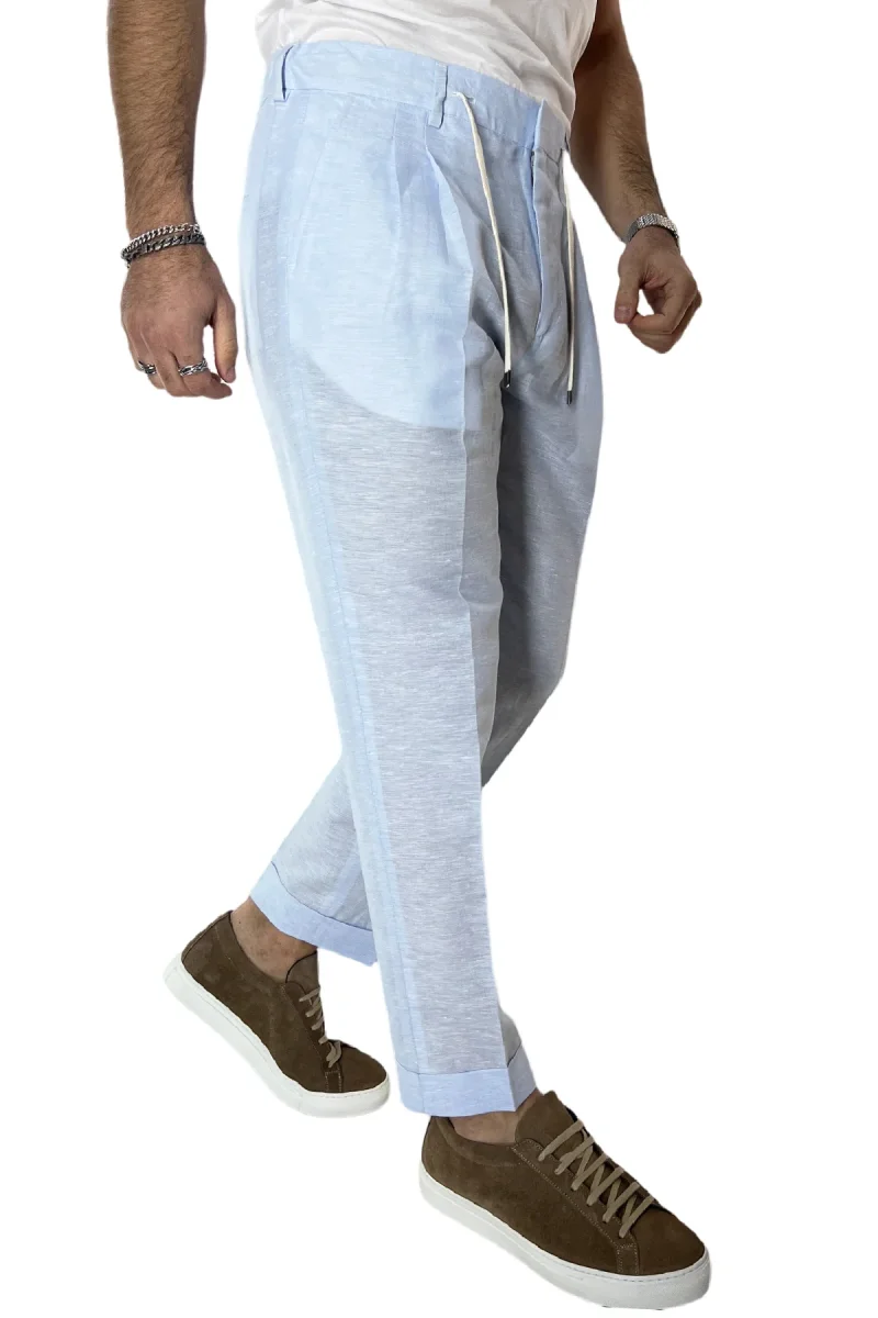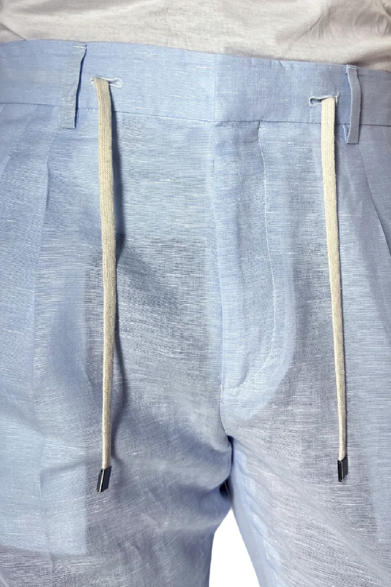 Pantalaccio uomo celeste in lino e cotone tasca america con doppia pence e laccio in vita risvolto 4cm