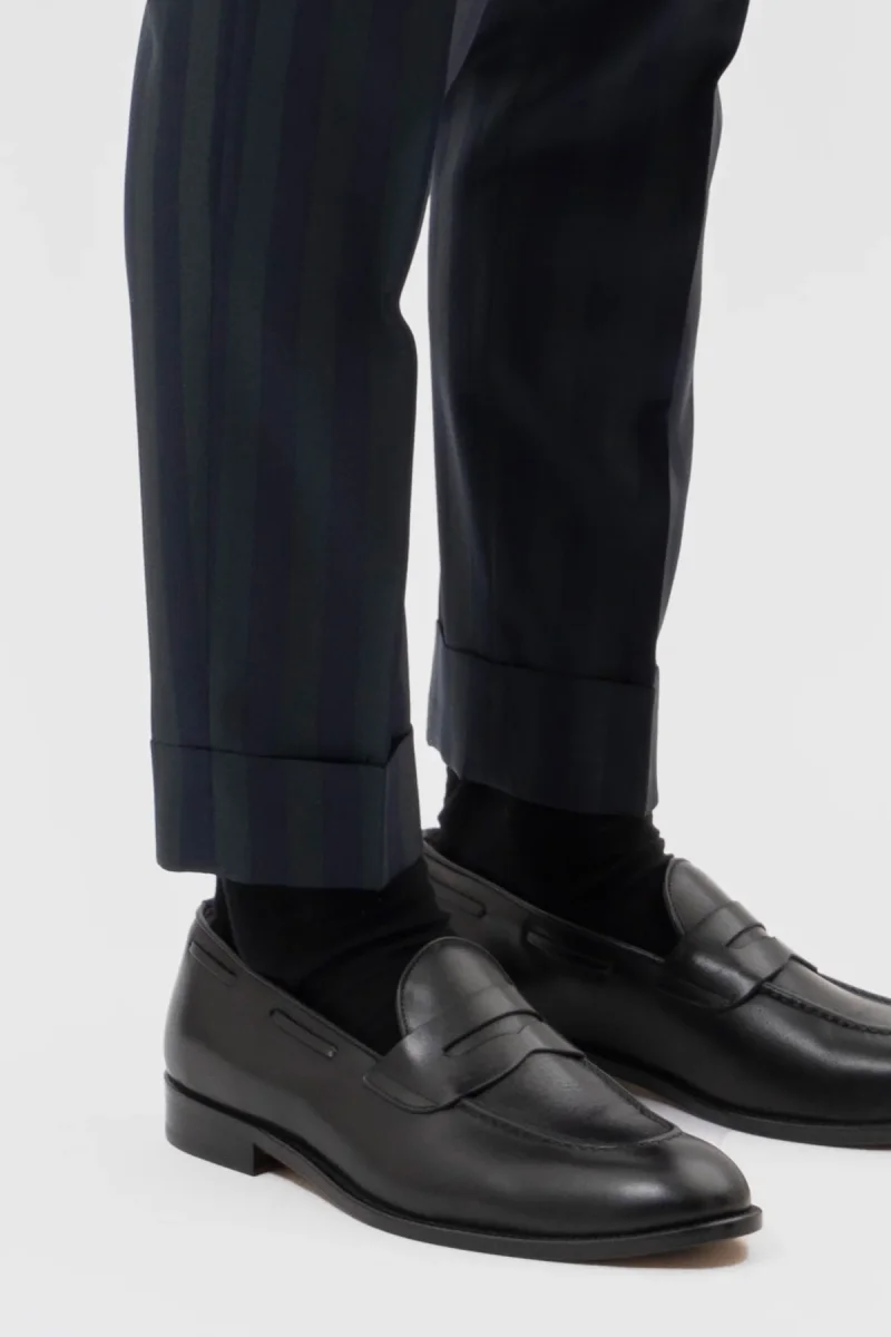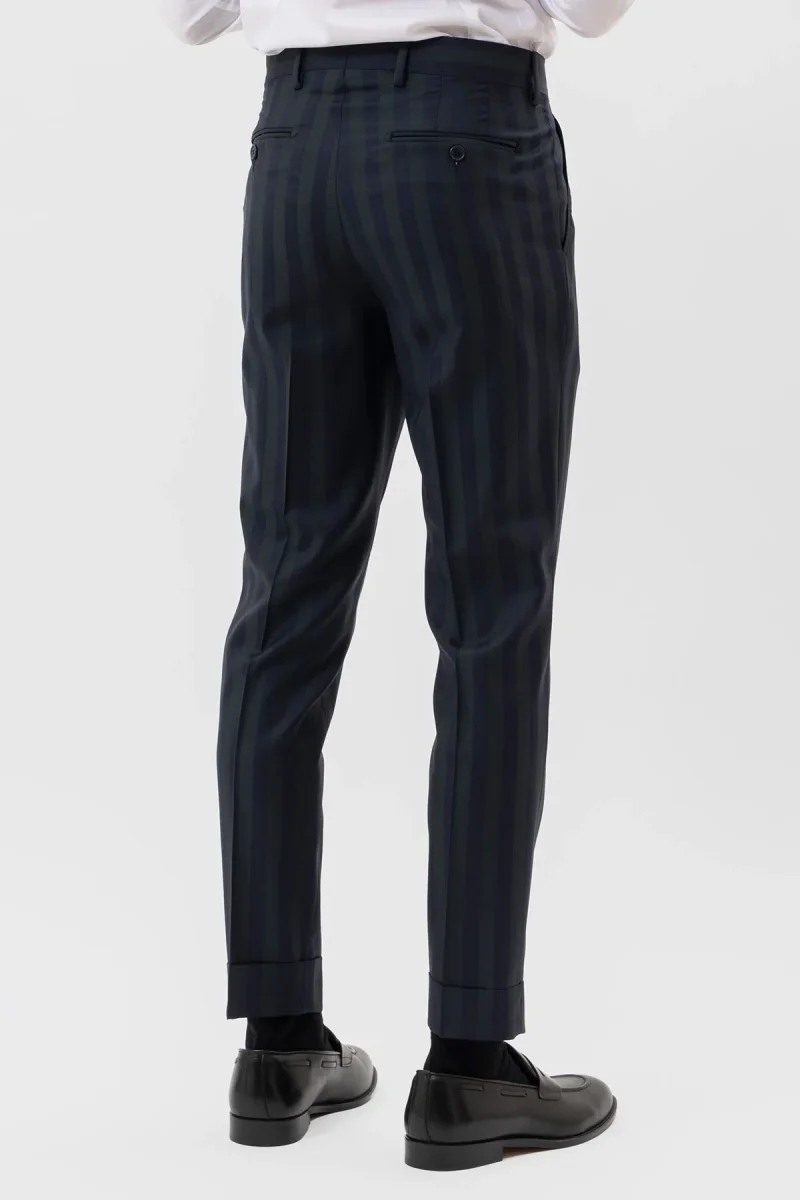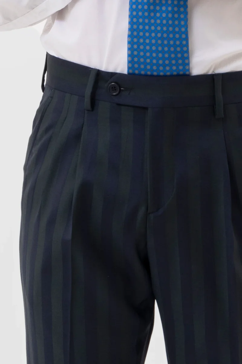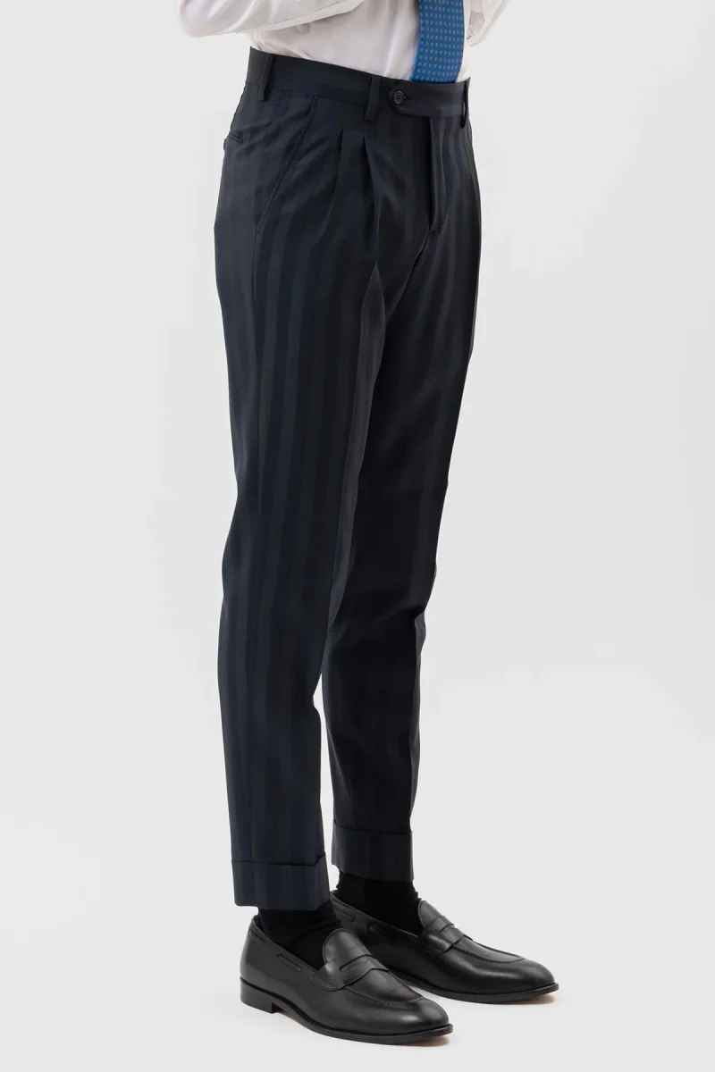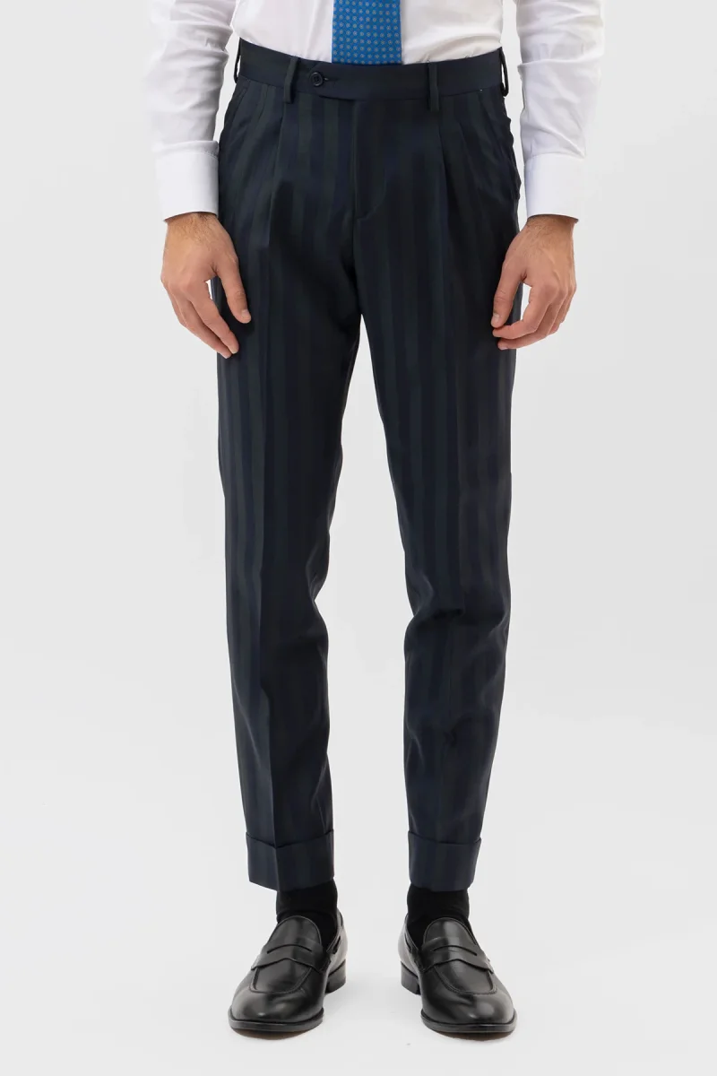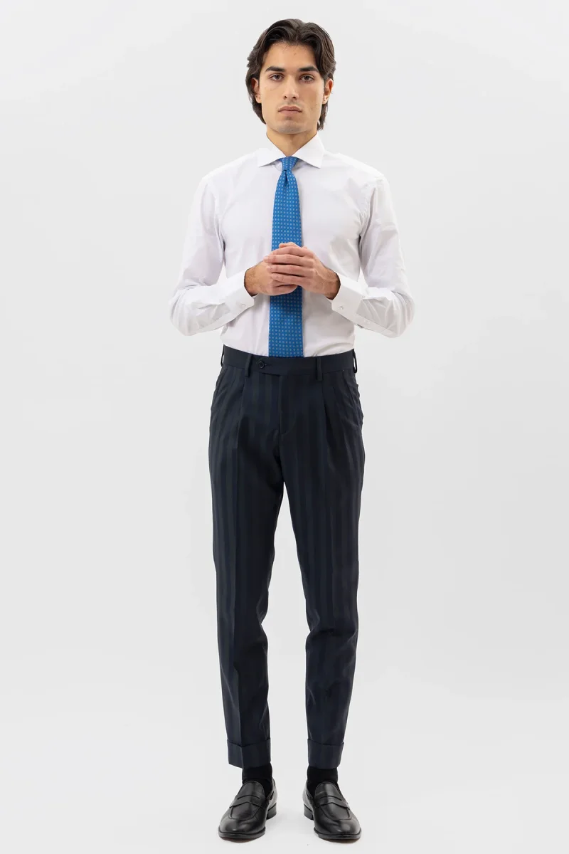 Pantalone uomo blu notte in fresco lana super 130’s Bristol tessuti Napoli vita alta doppia pinces e risvolto 5cm