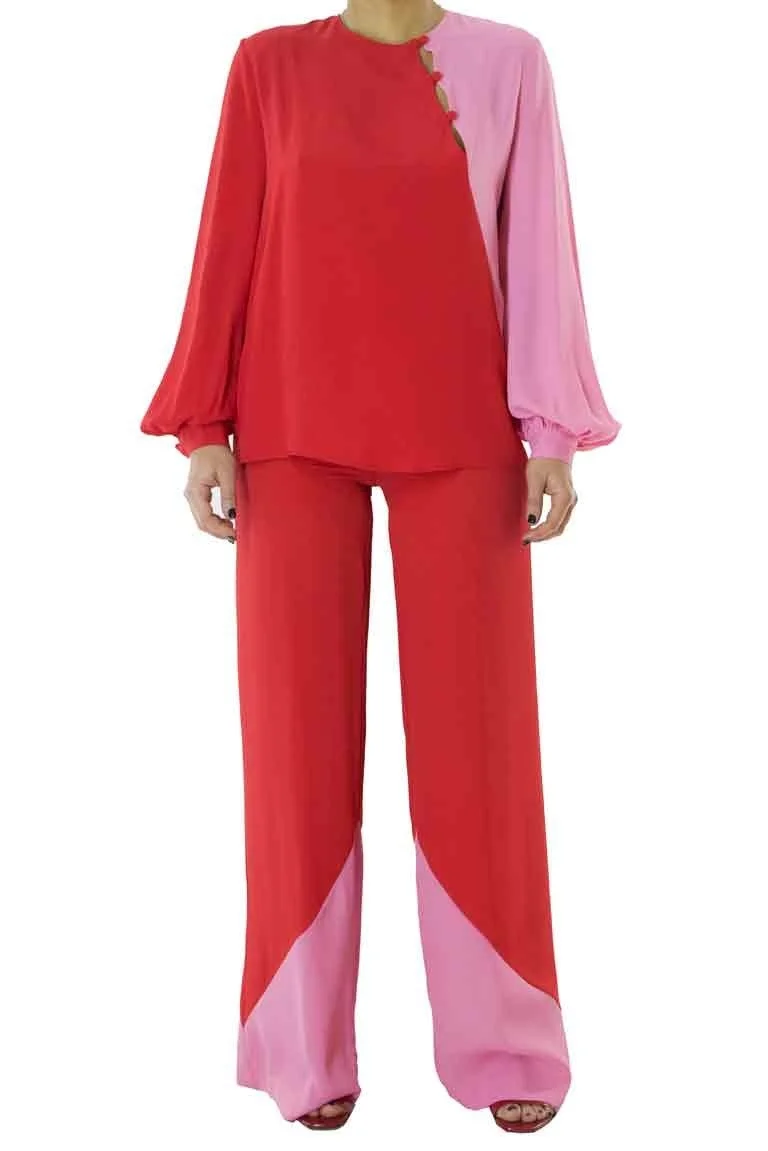 Pantalone a palazzo donna estivo elegante, vita alta bicolore rosso rosa in seta tasca america vita alta made in italy.