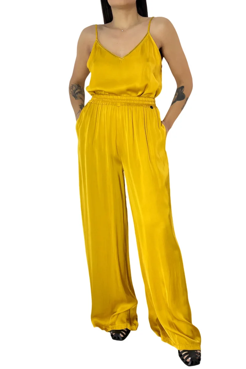 Pantalone donna in viscosa vita alta bustino elasticizzato gamba ampia e tasca a filo