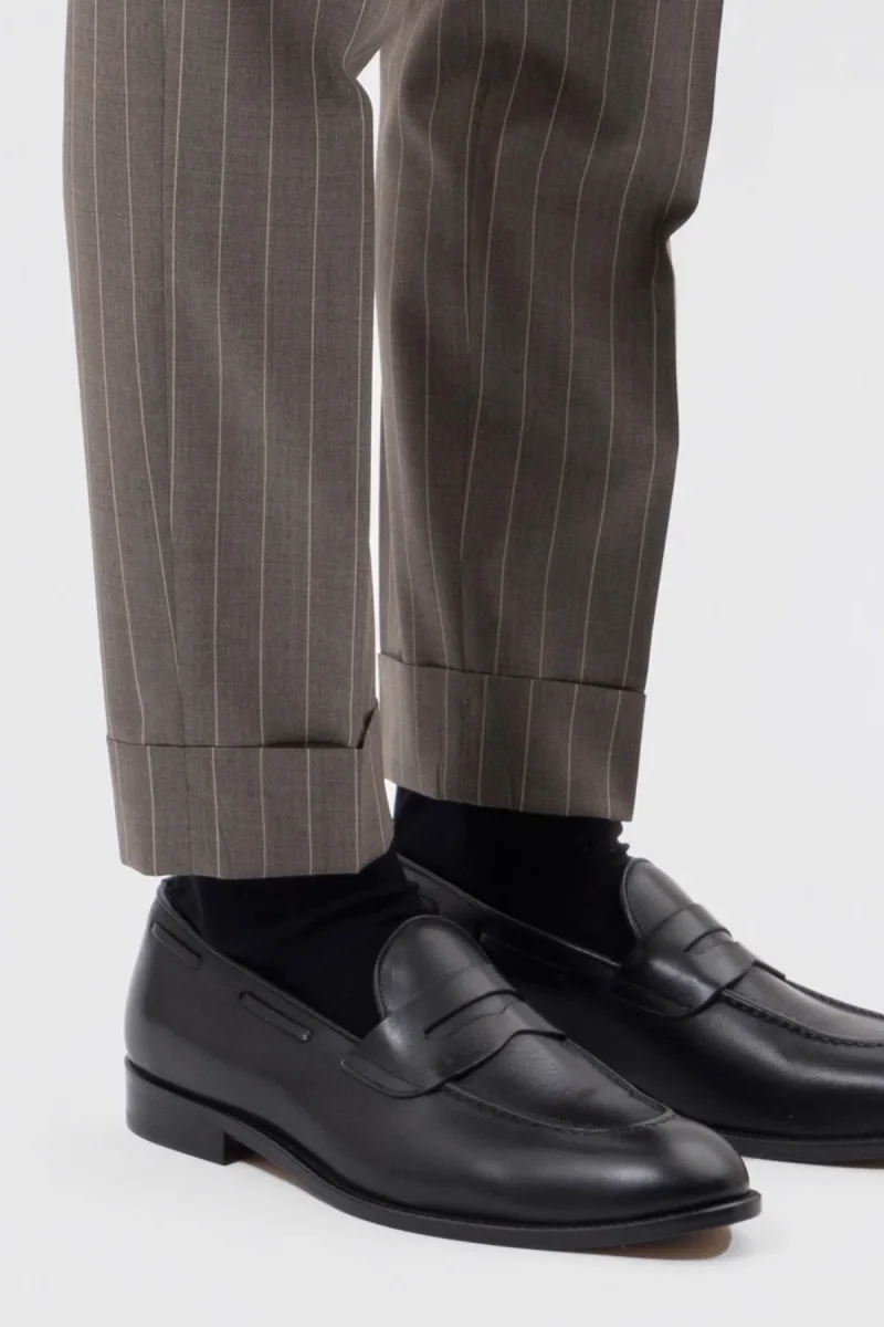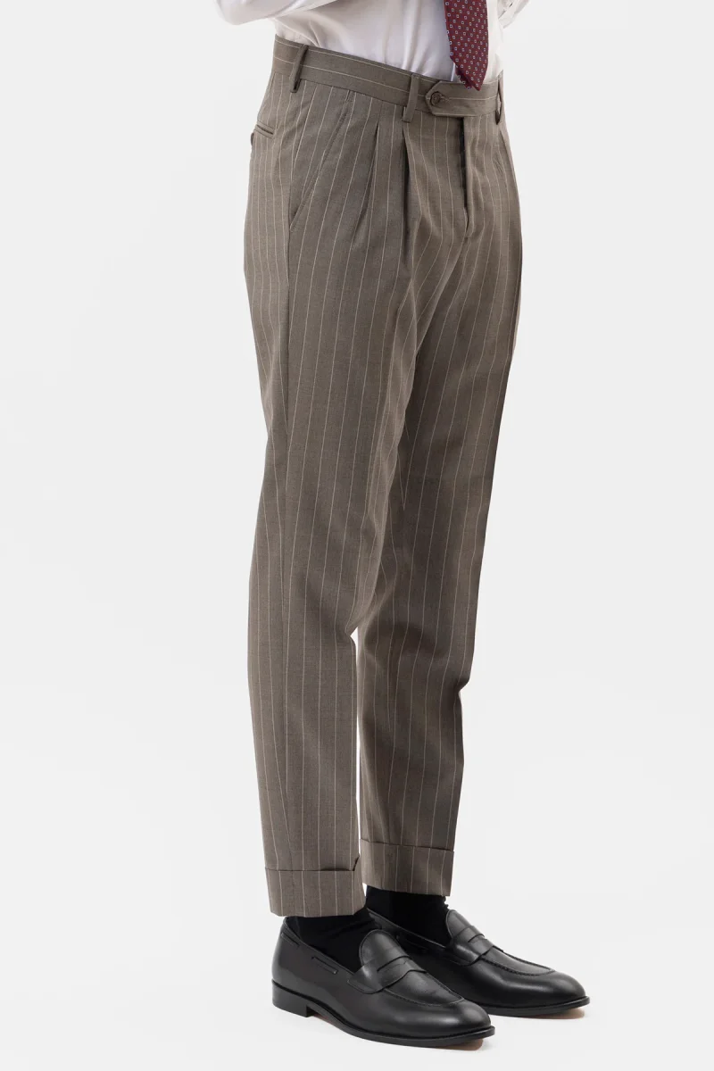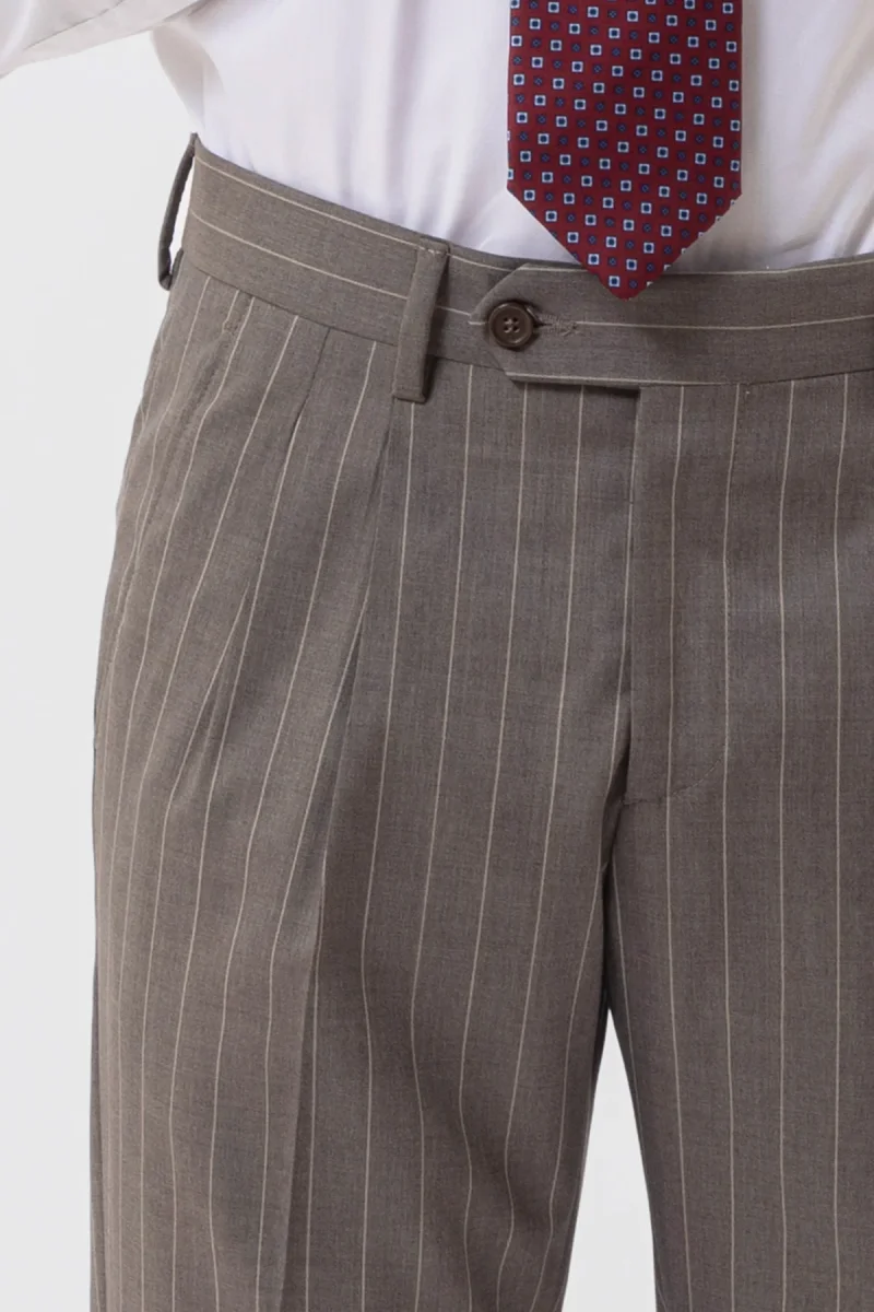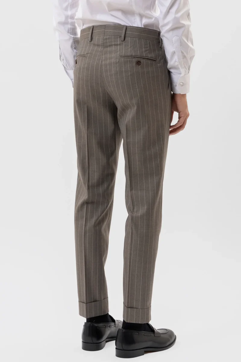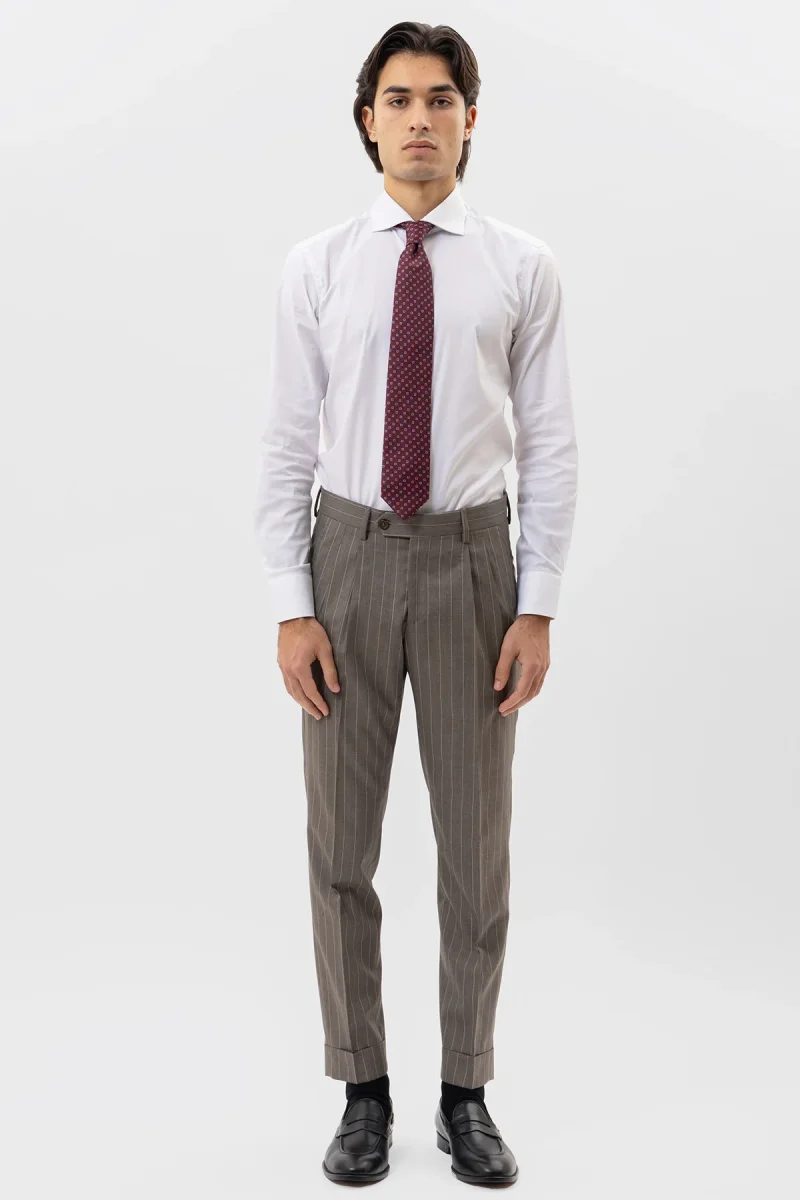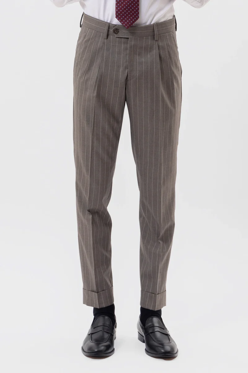 PANTALONE FANGO GESSATO BEIGE VITA ALTA IN FRESCO LANA SUPER 130’s VITALE BARBERIS CANONICO CON DOPPIA PINCES E RISVOLTO 5CM
