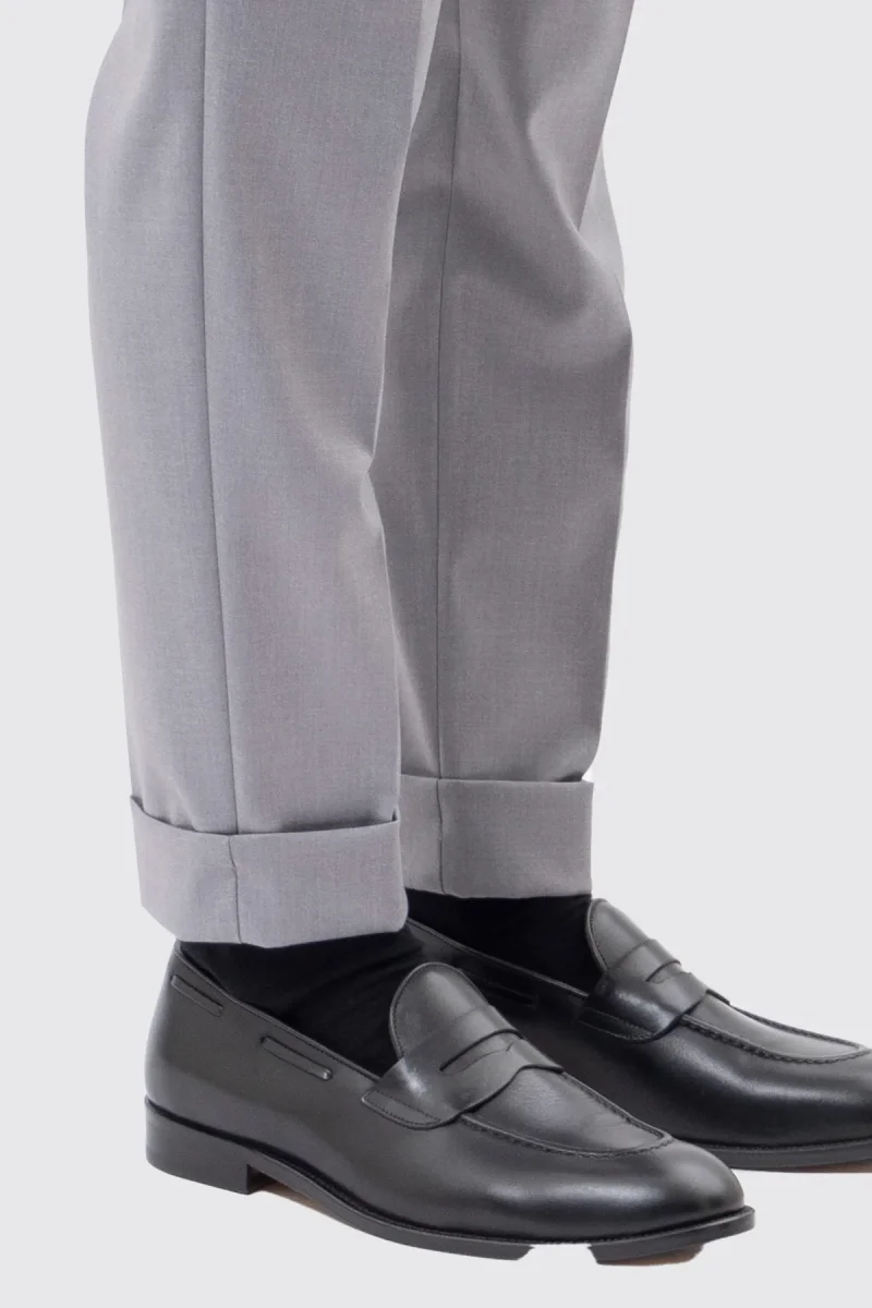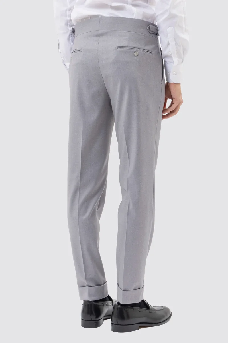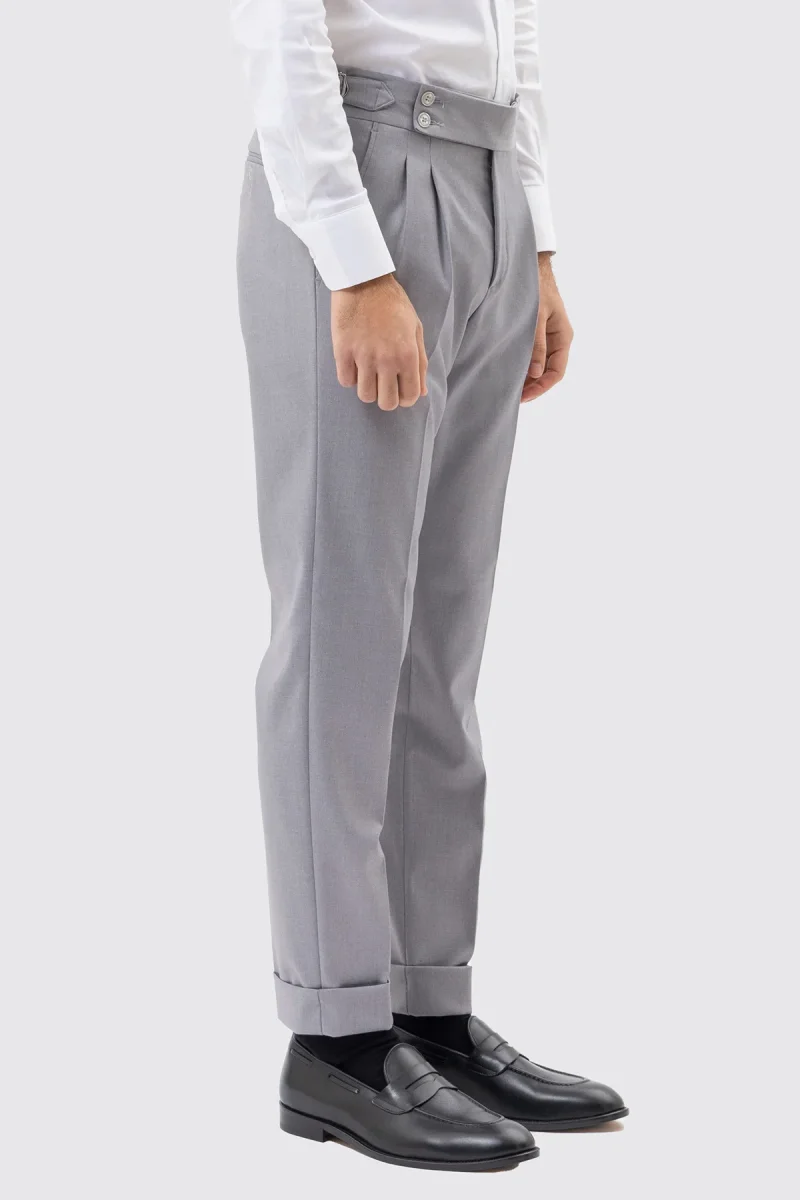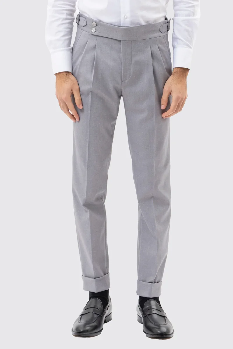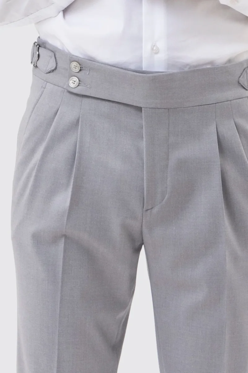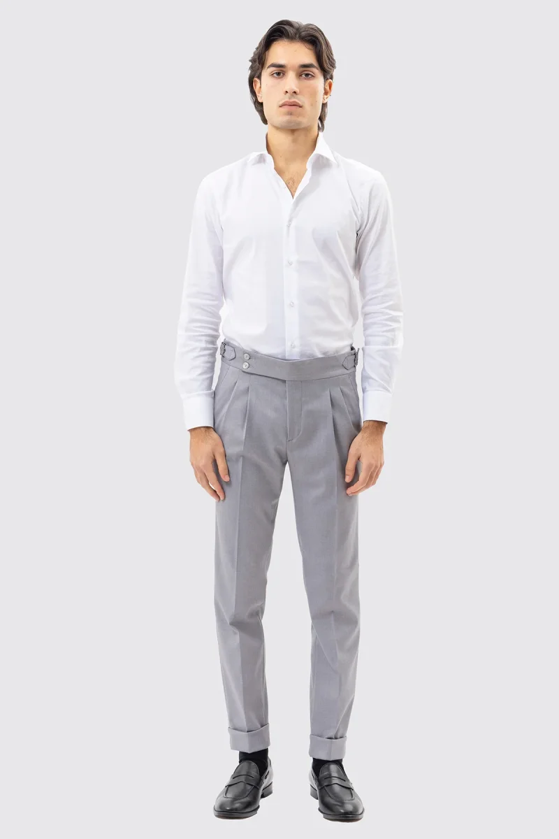 PANTALONE GRIGIO CHIARO VITA ALTA CON FIBBIE UOMO EFFETTO LANA DOPPIA PINCES FIBBIE LATERALI E RISVOLTO 5CM