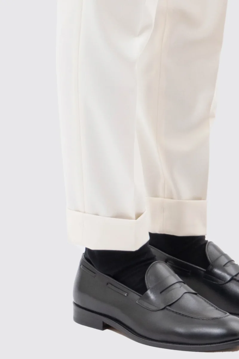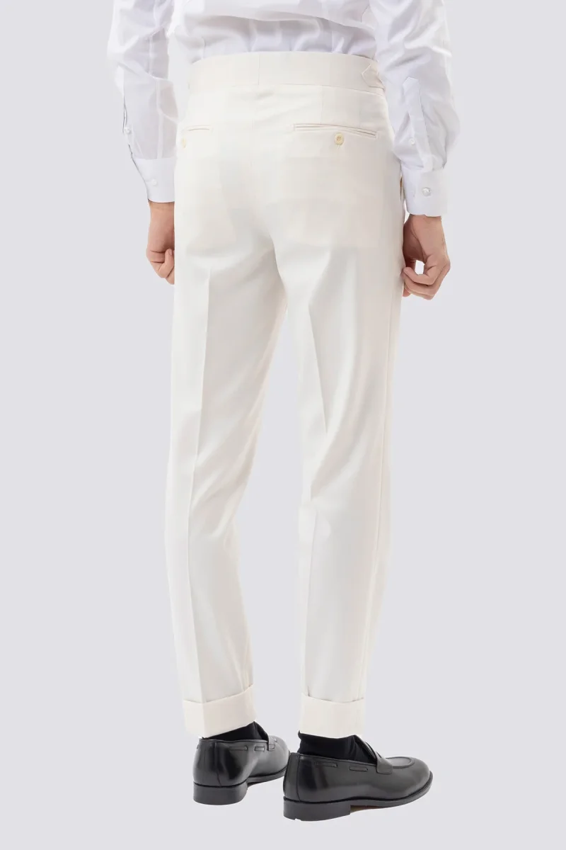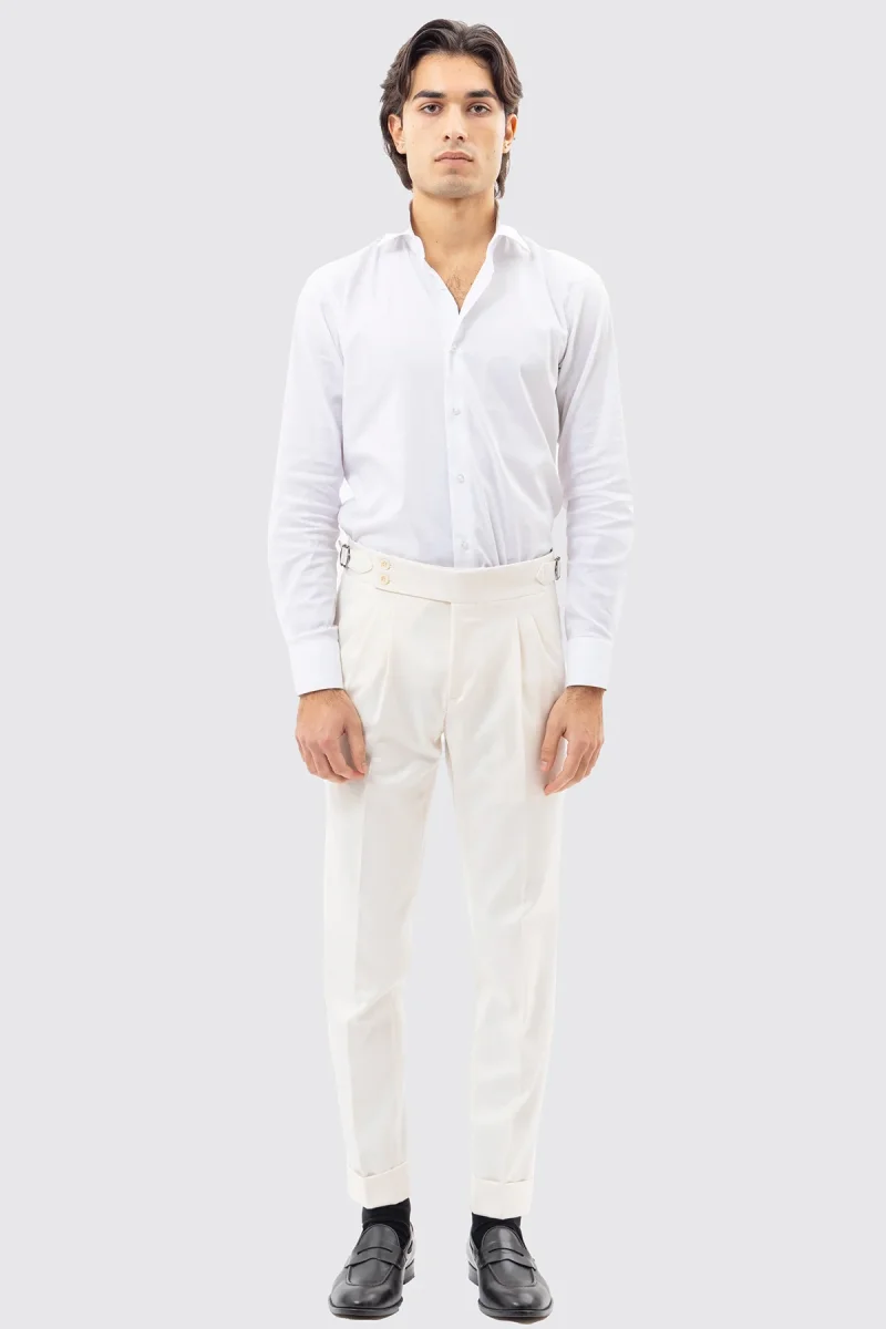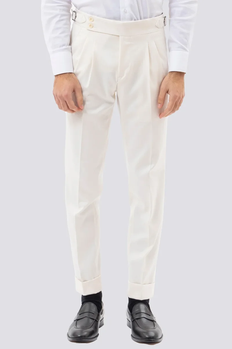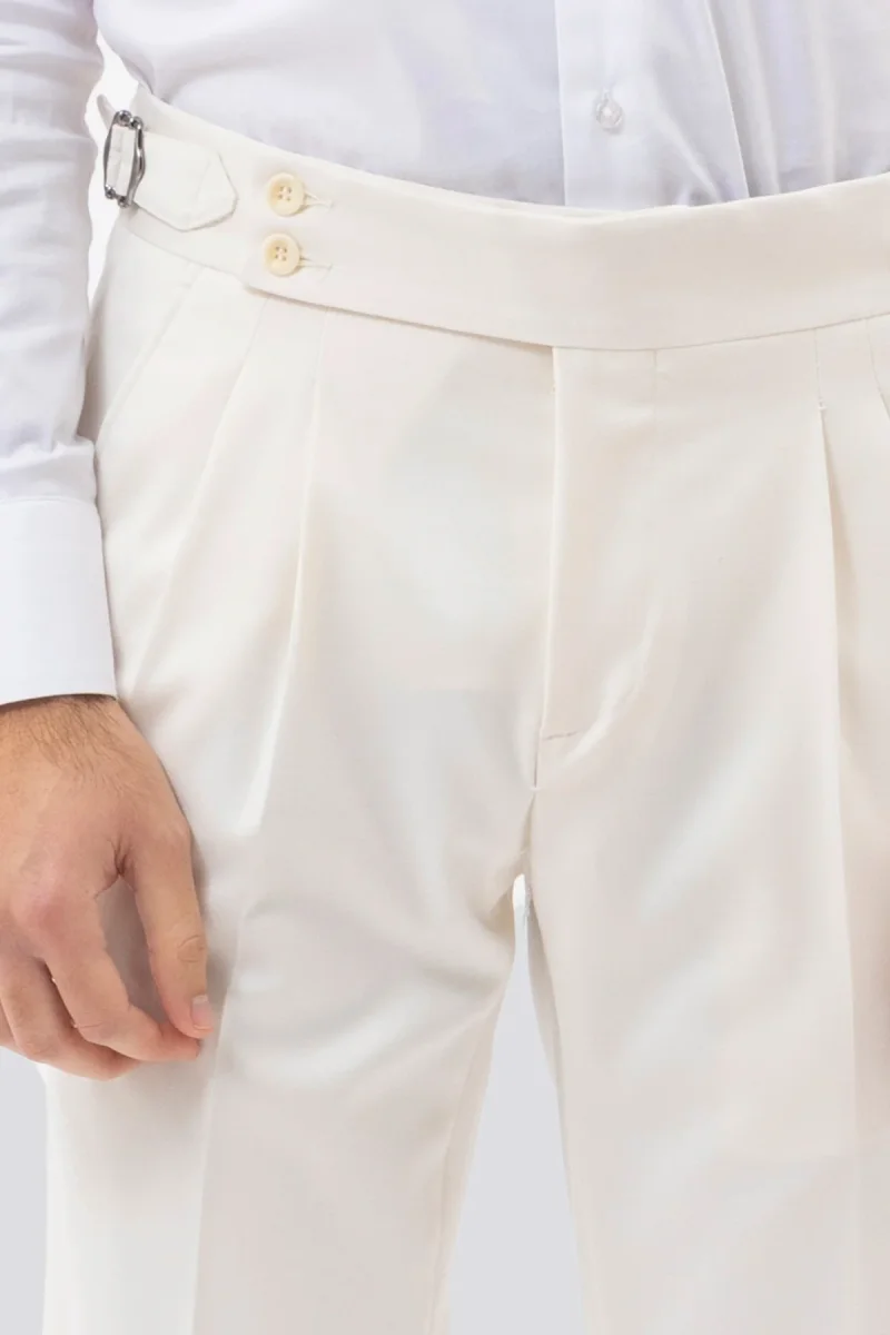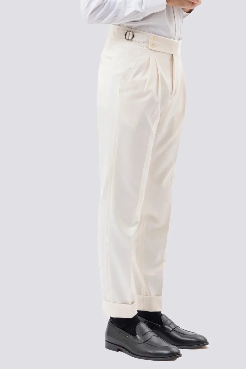 Pantalone panna vita alta con fibbie latewrali regolabili effetto fresco lana con doppia pinces e risvolto di 5cm