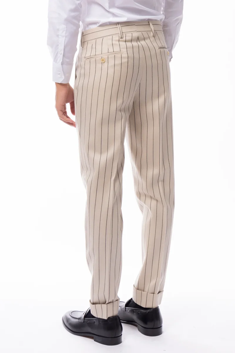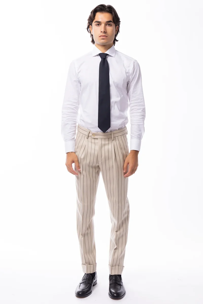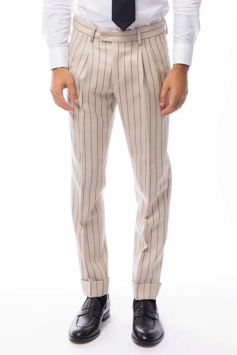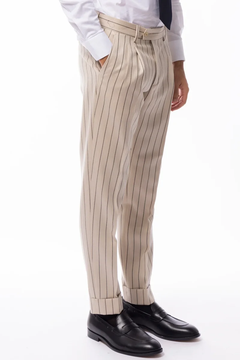 PANTALONE UOMO BEIGE GESSATO NERO VITA ALTA IN LANA HOLLAND & SHERRY DOPPIA PINCES RISVOLTO 5CM