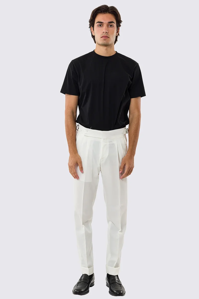 Scopri il nostro pantalone uomo bianco vita alta effetto fresco lana, un capo che unisce pulizia estetica, comfort estivo e artigianalità Made in Italy. Questo modello è perfetto per chi desidera un pantalone elegante ma leggero, con una tonalità bianca versatile che valorizza ogni outfit, dal più formale allo smart-casual.