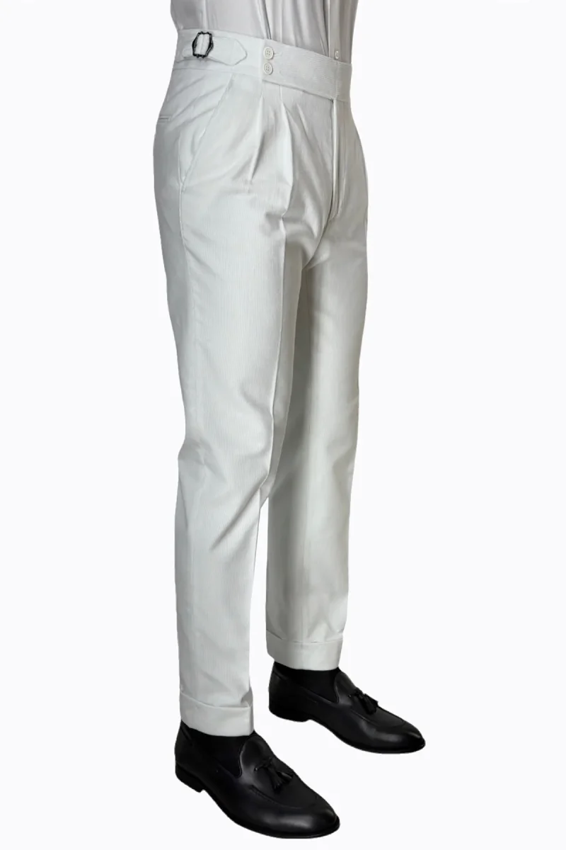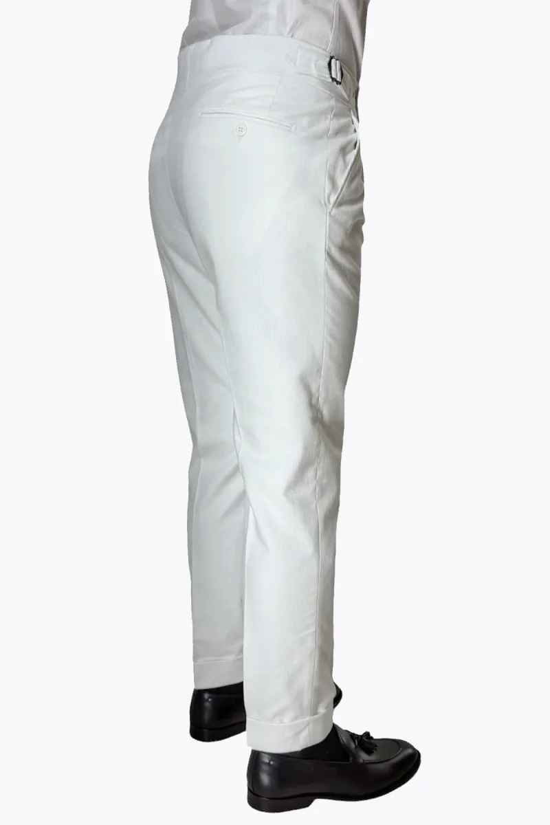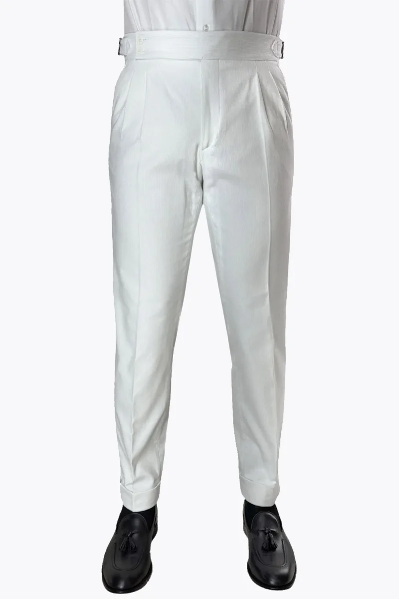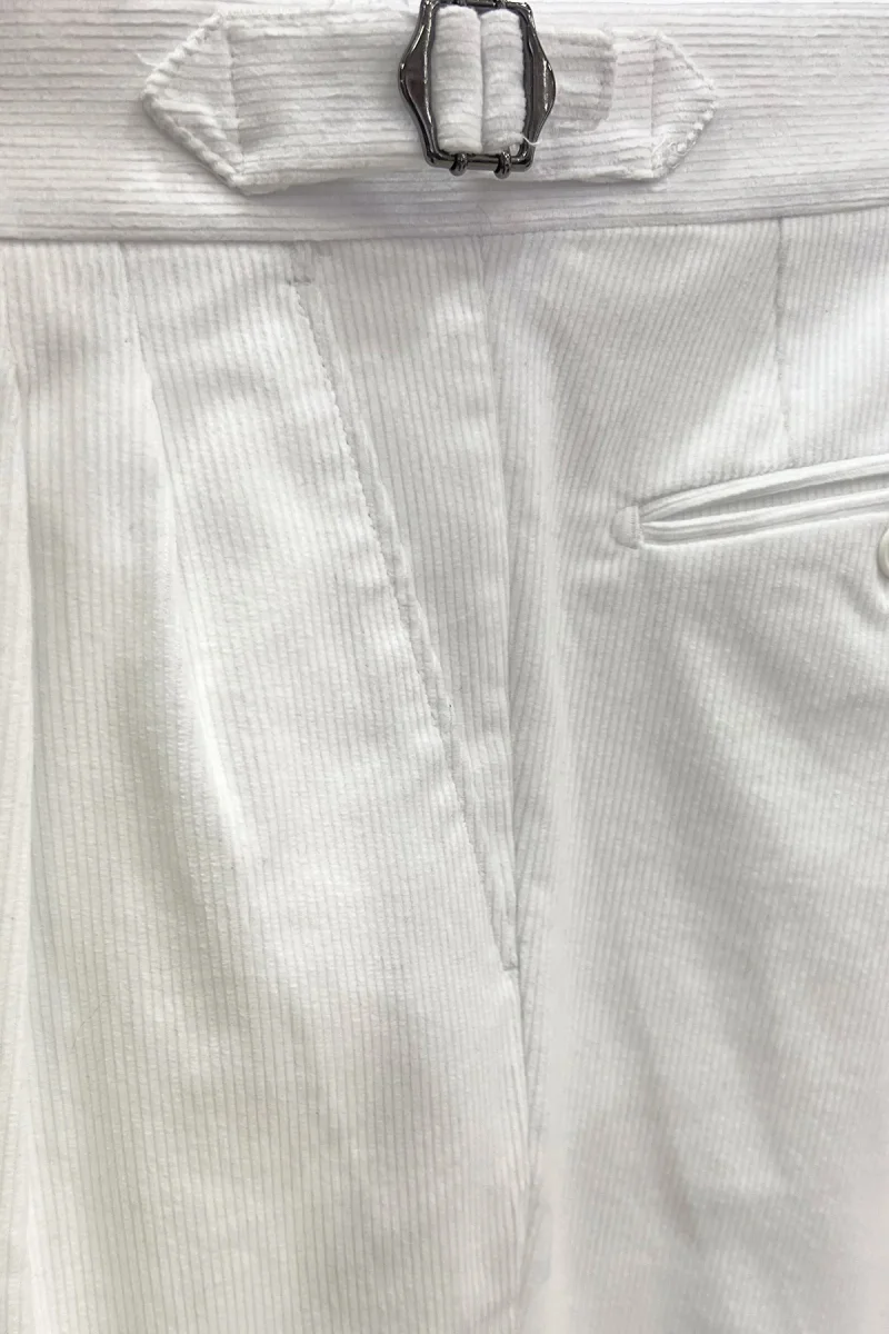 Pantalone uomo bianco vita alta doppia pinces in velluto a costine strette