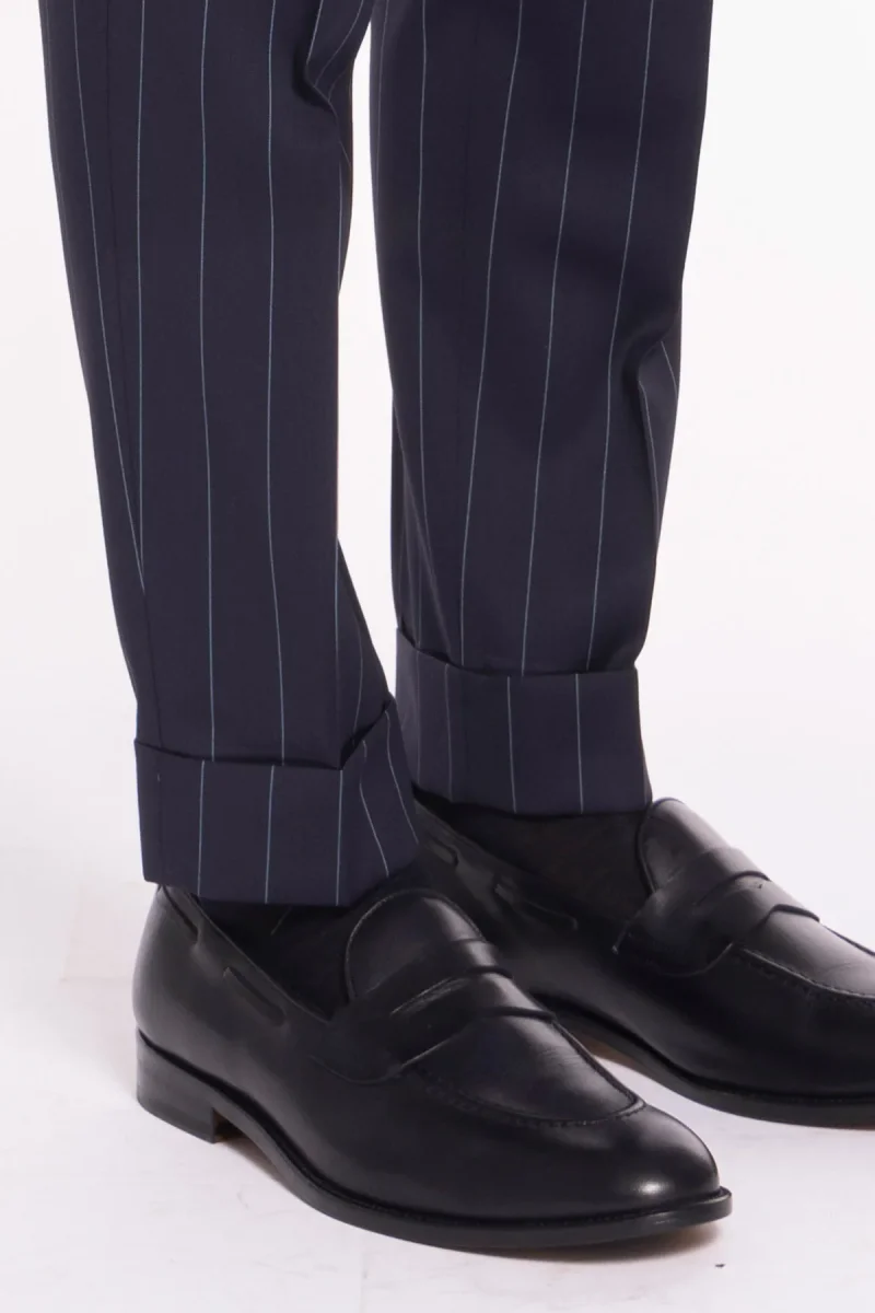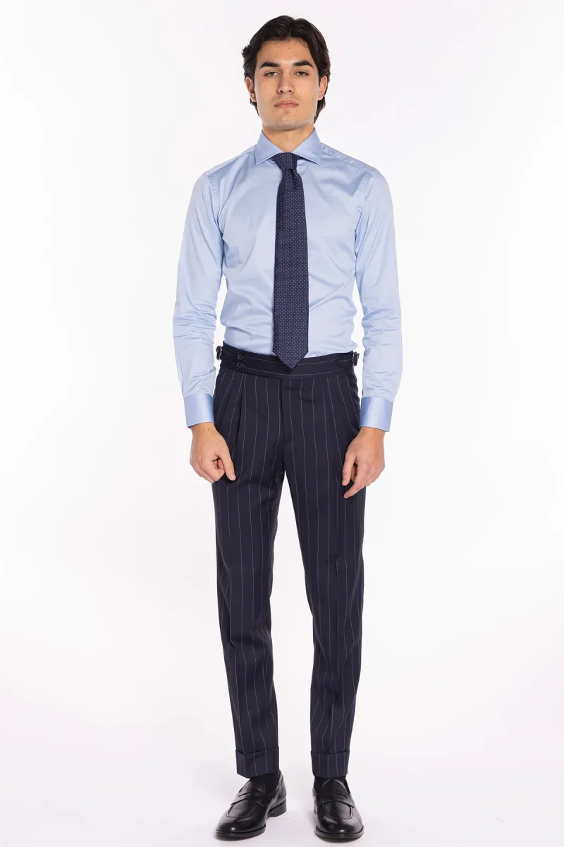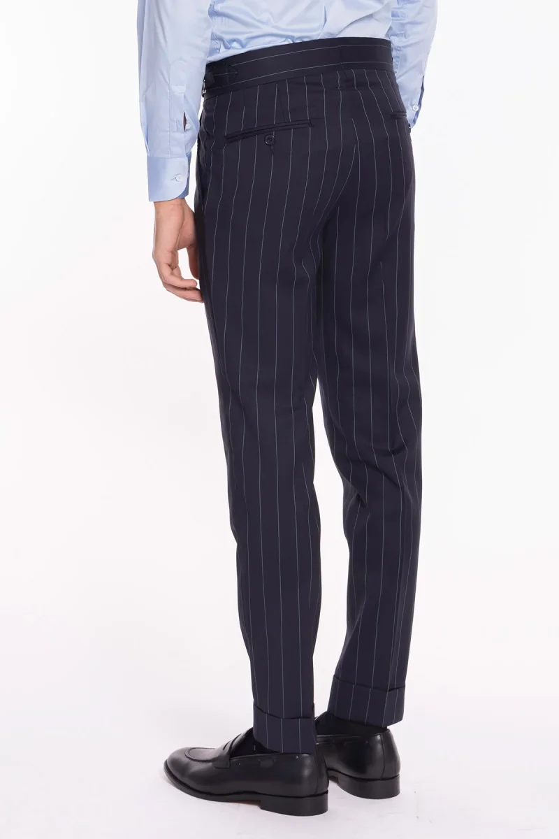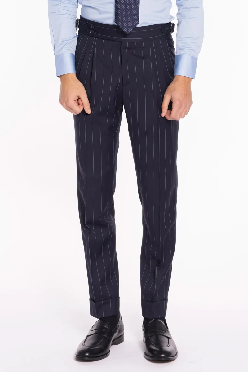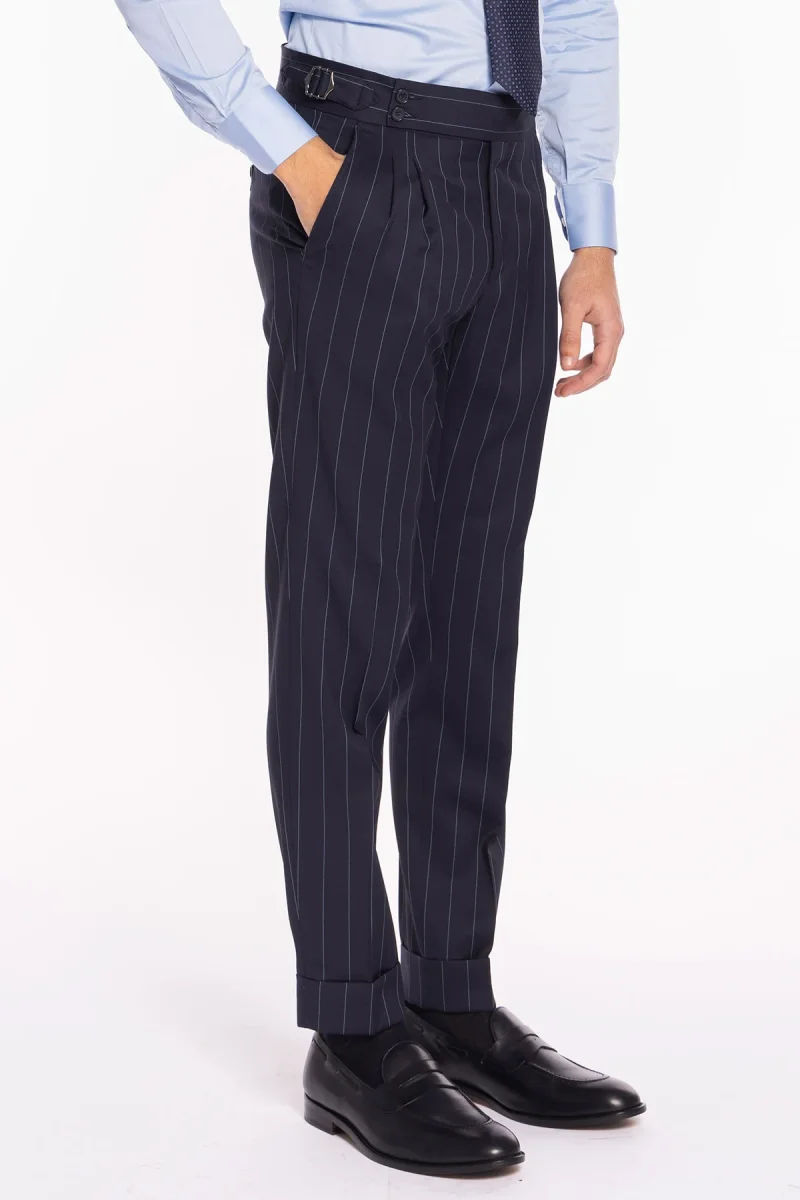 Pantalone uomo blu gessato celeste in fresco lana super 130’s Bristol tessuti Napoli vita alta con fibbie laterali