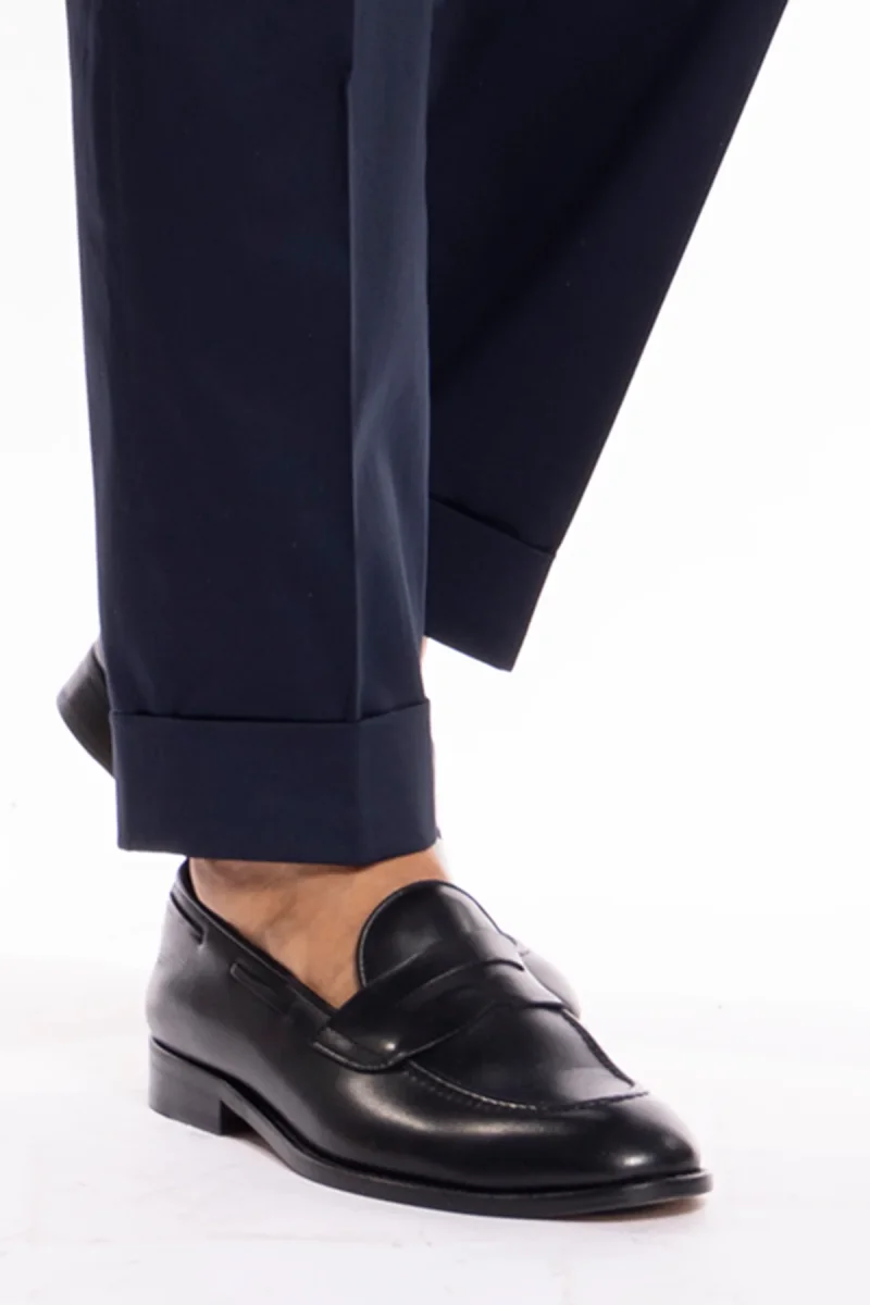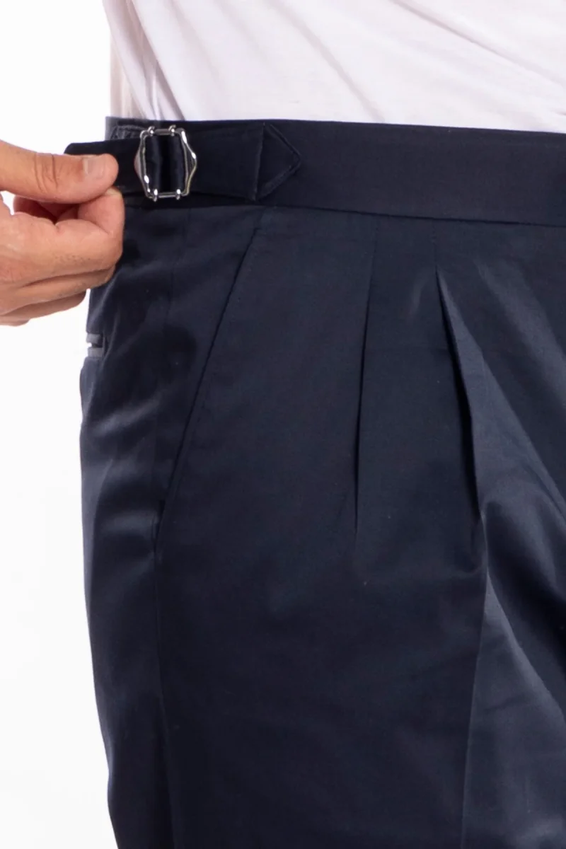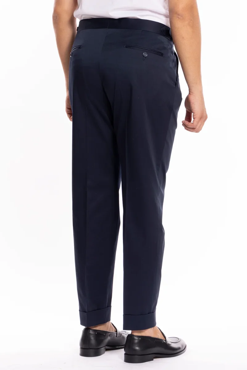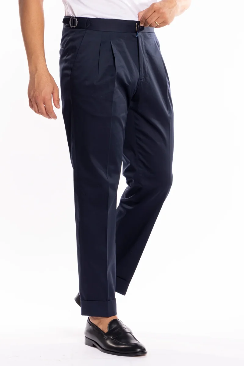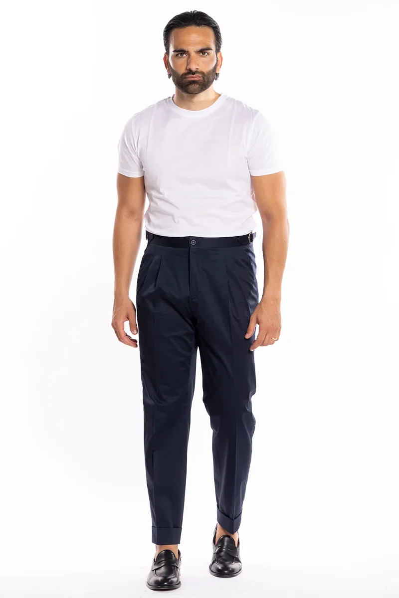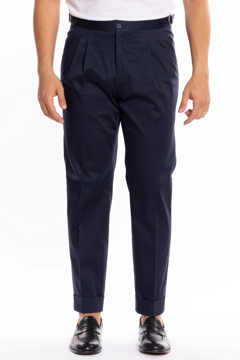 PANTALONE UOMO BLU IN COTONE VITA ALTA DOPPIA PINCES CON FIBBIE LATERALI RISVOLTO 5CM