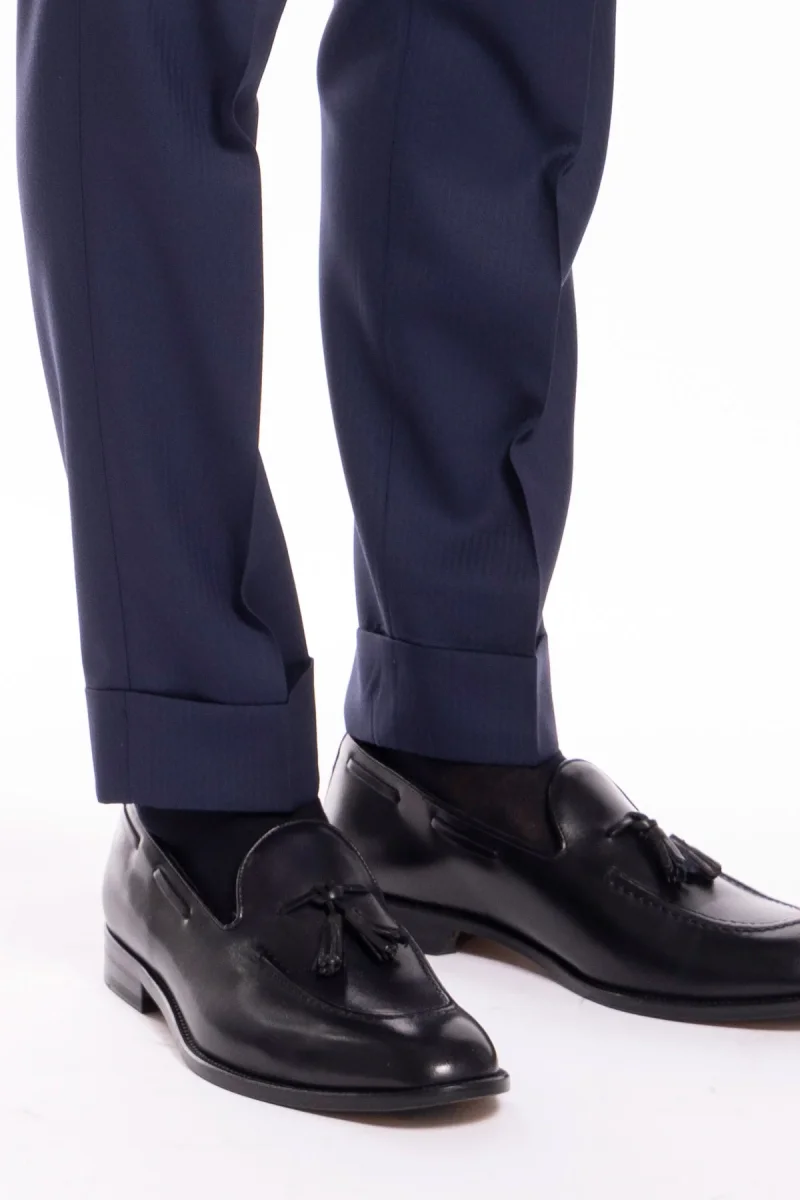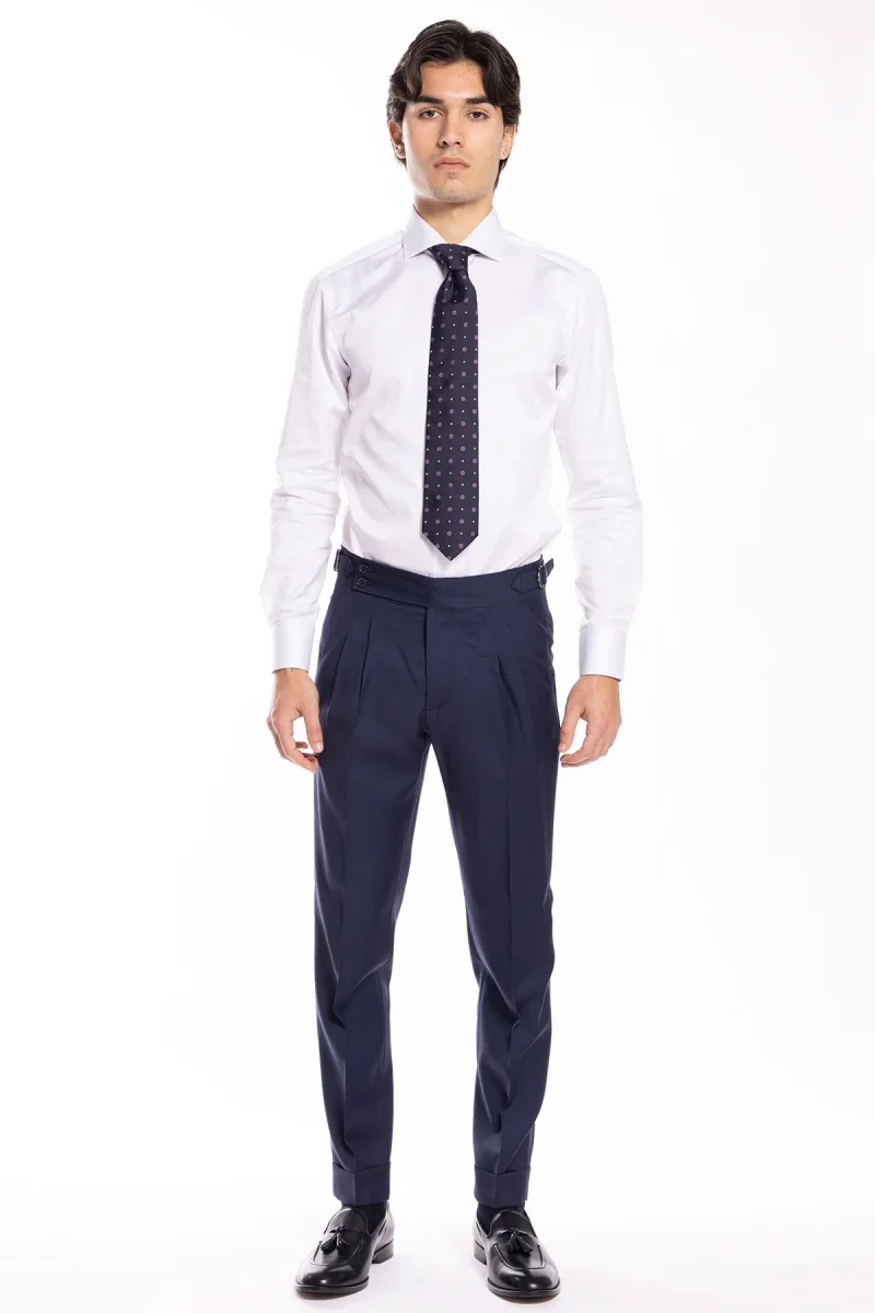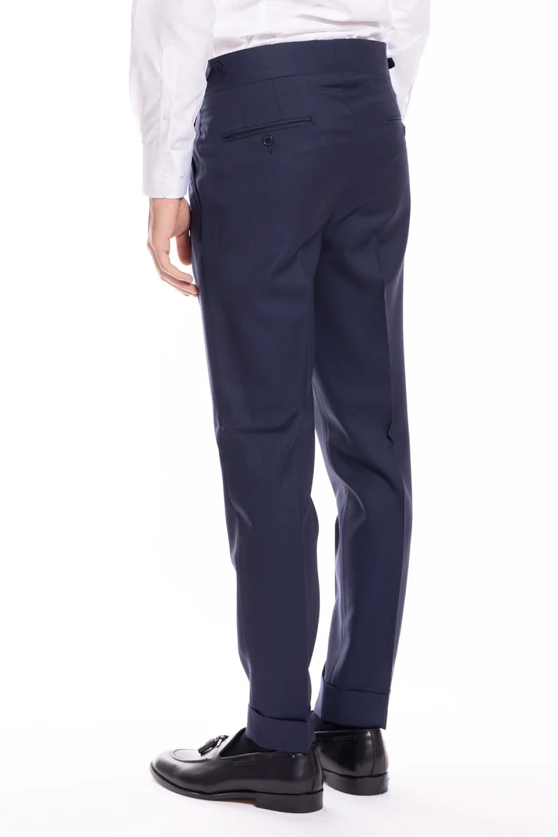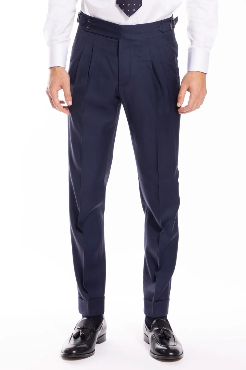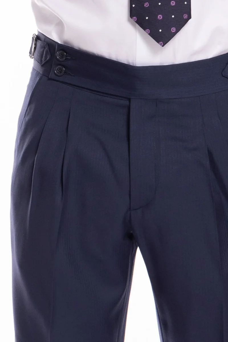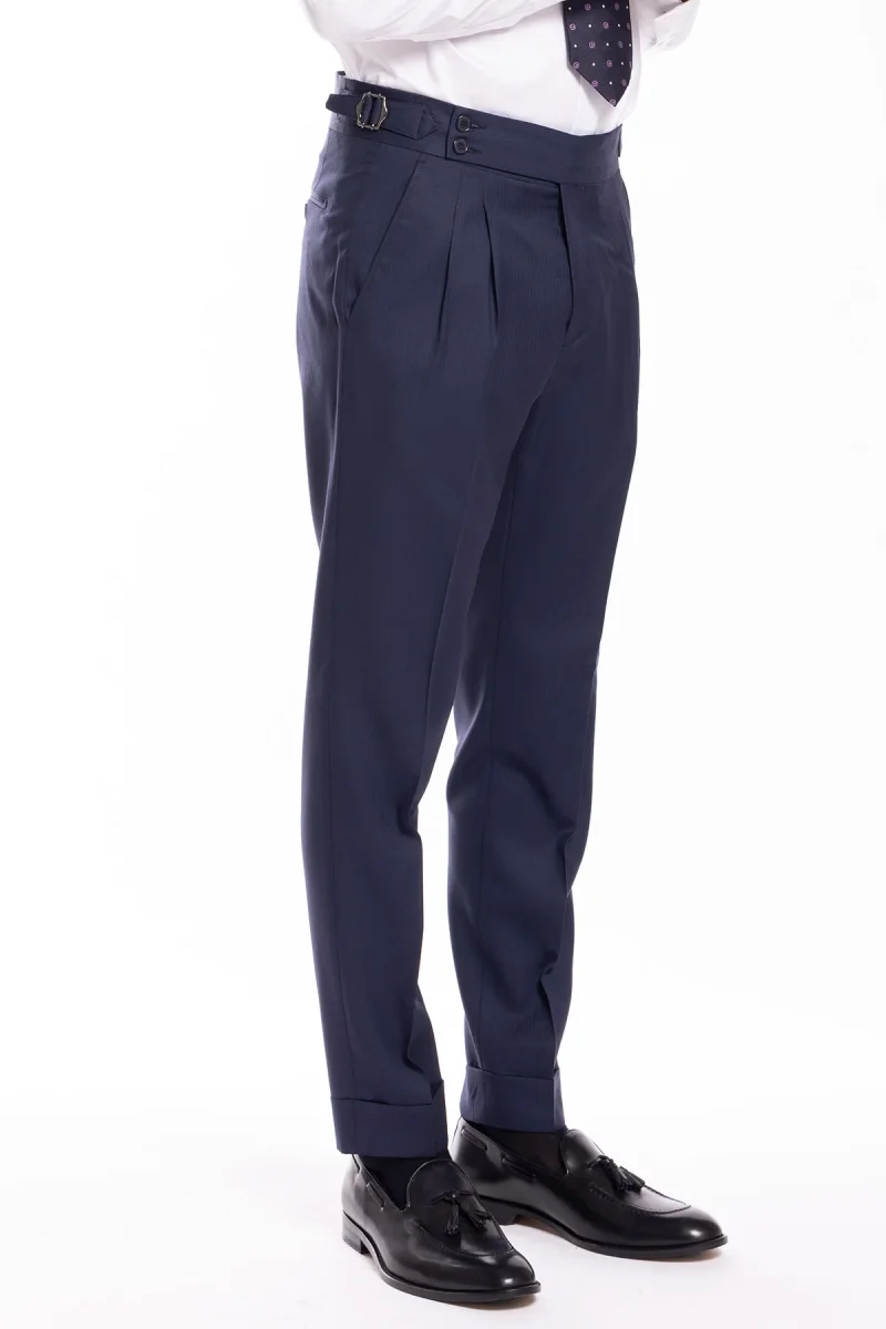 Pantalone uomo blu notte spigato in fresco lana super 130’s Bristol tessuti Napoli vita alta con fibbie laterali