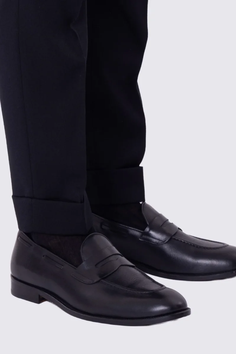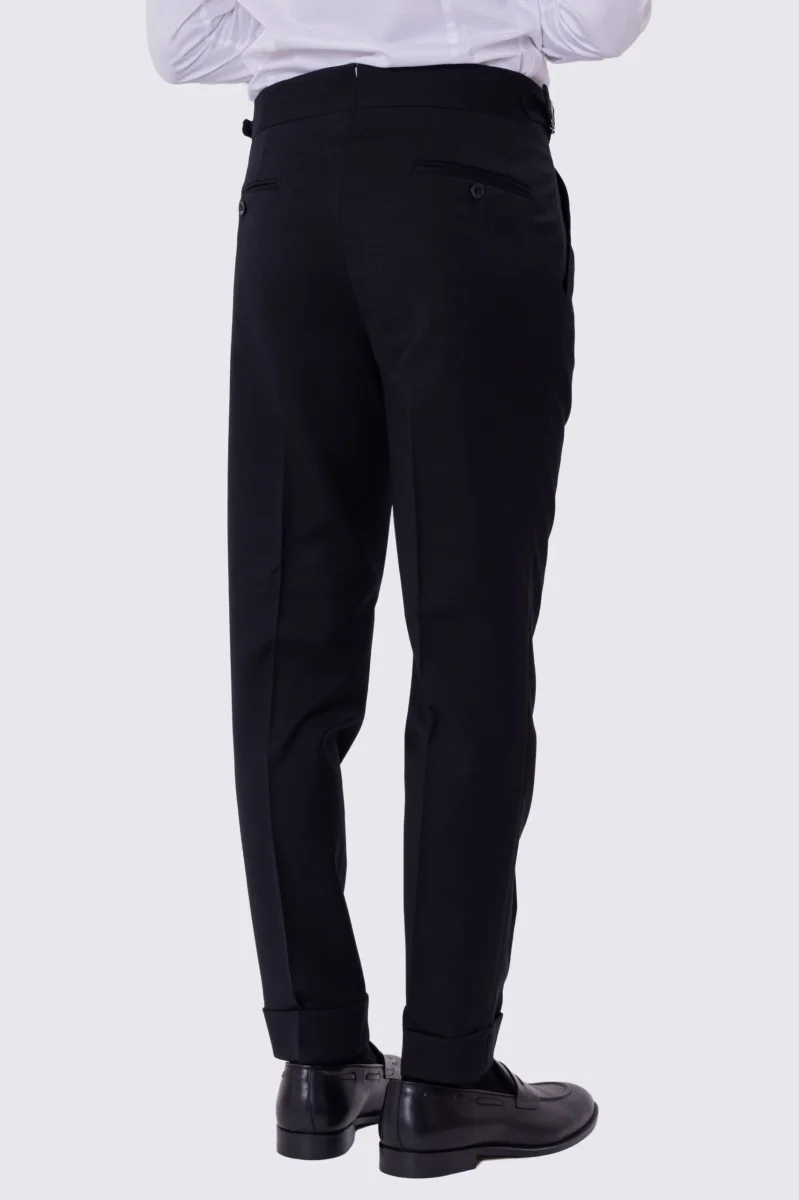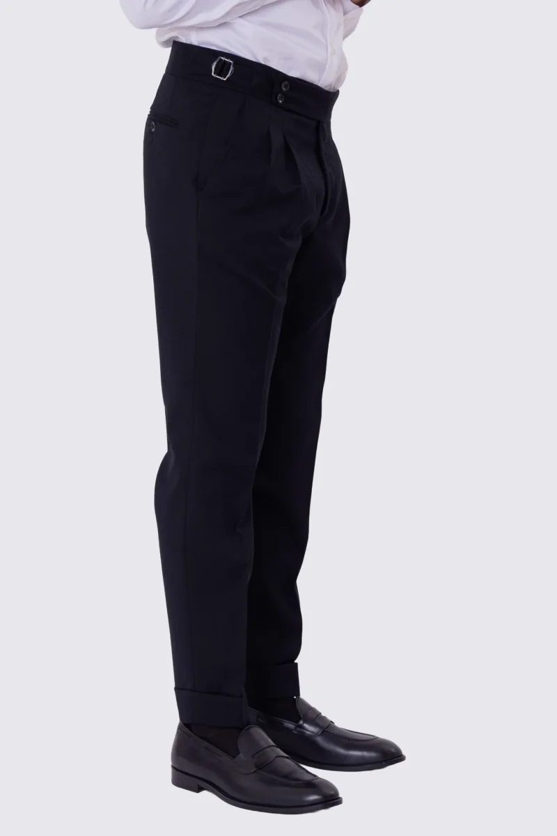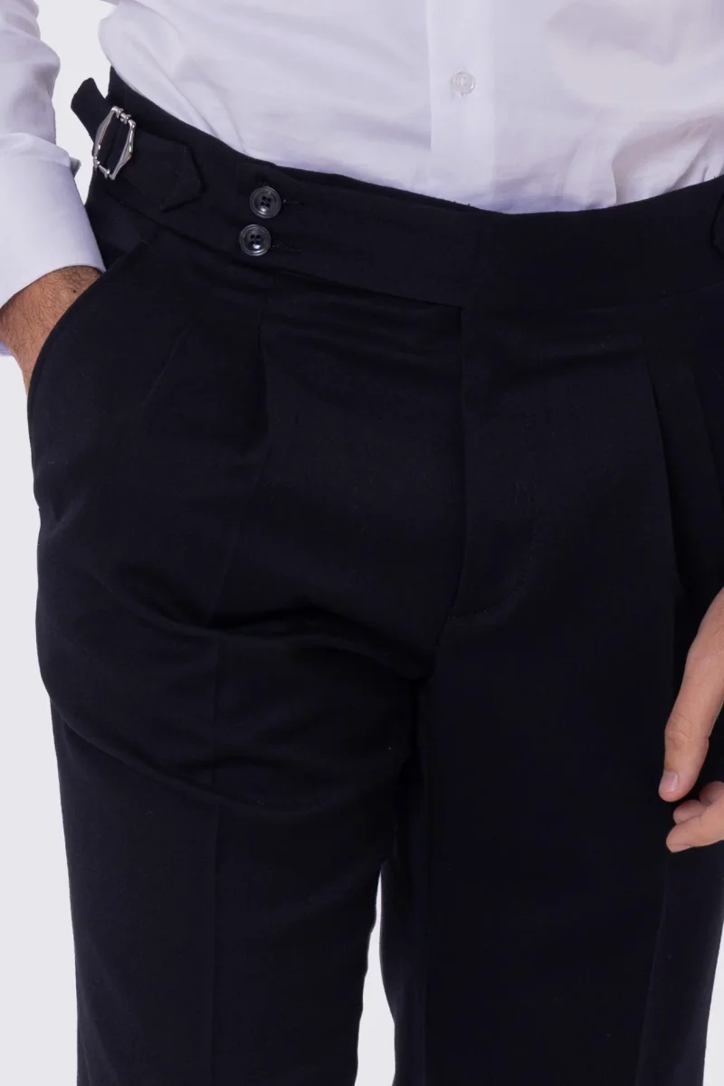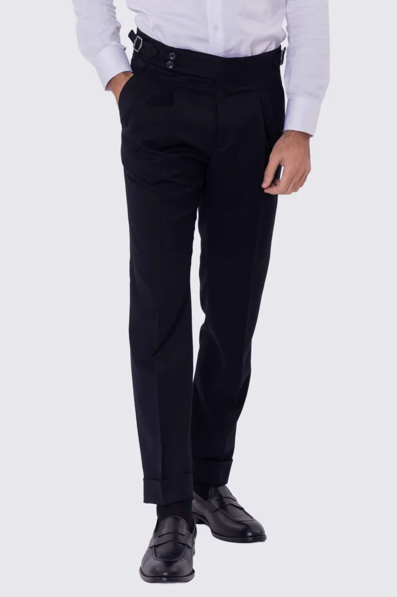 Pantalone uomo blu vita alta con fibbie laterali e doppia pinces tasca america in lana flanella mista 290gr invernale risvolto 5cm made in italy