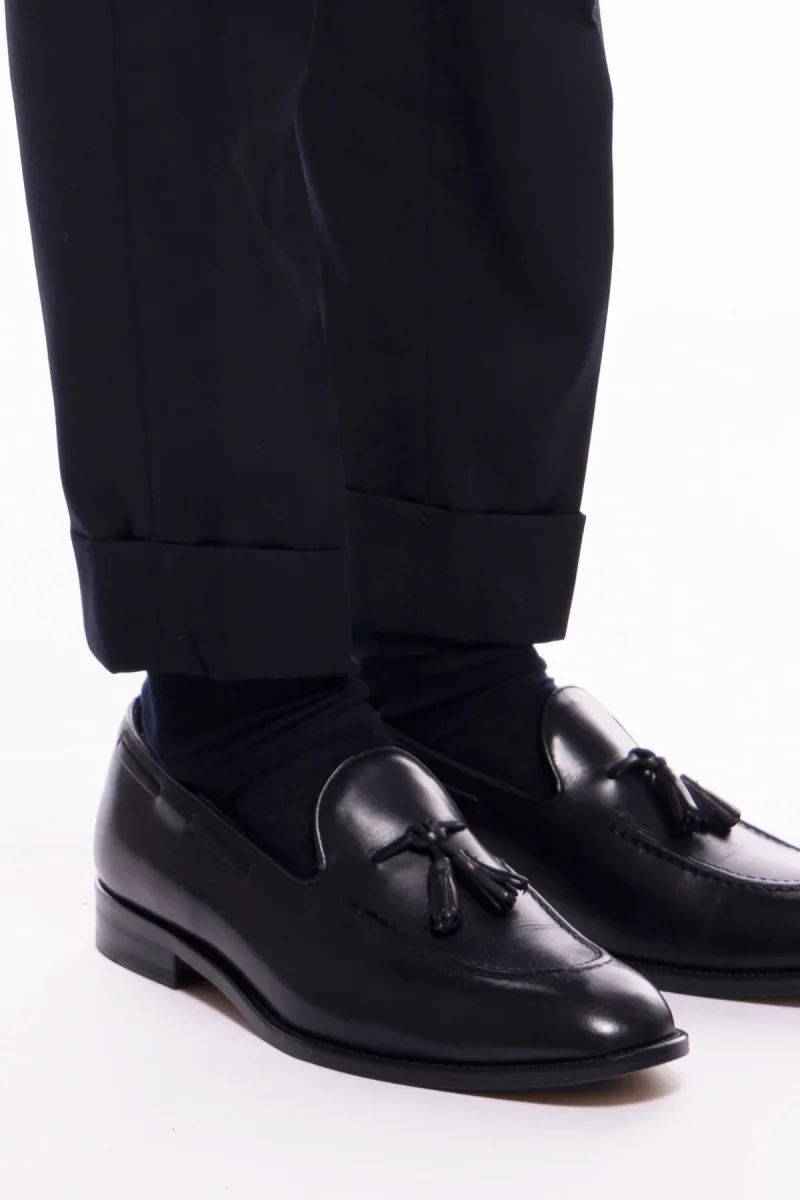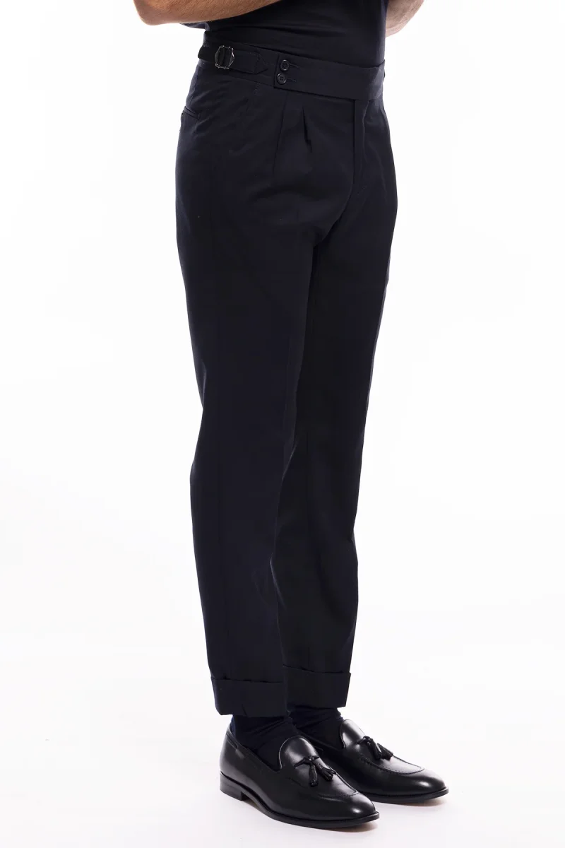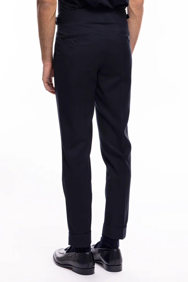 Pantalone uomo blu vita alta doppia pinces effetto fresco lana