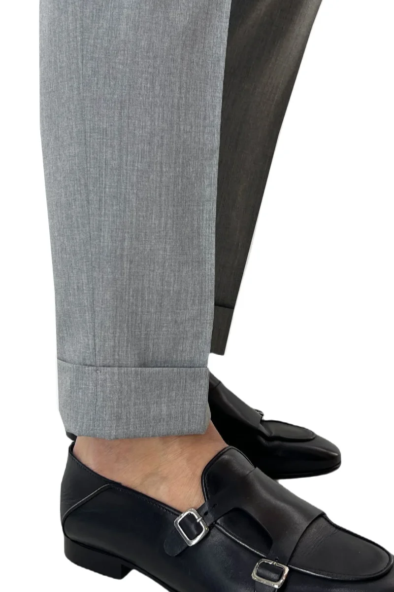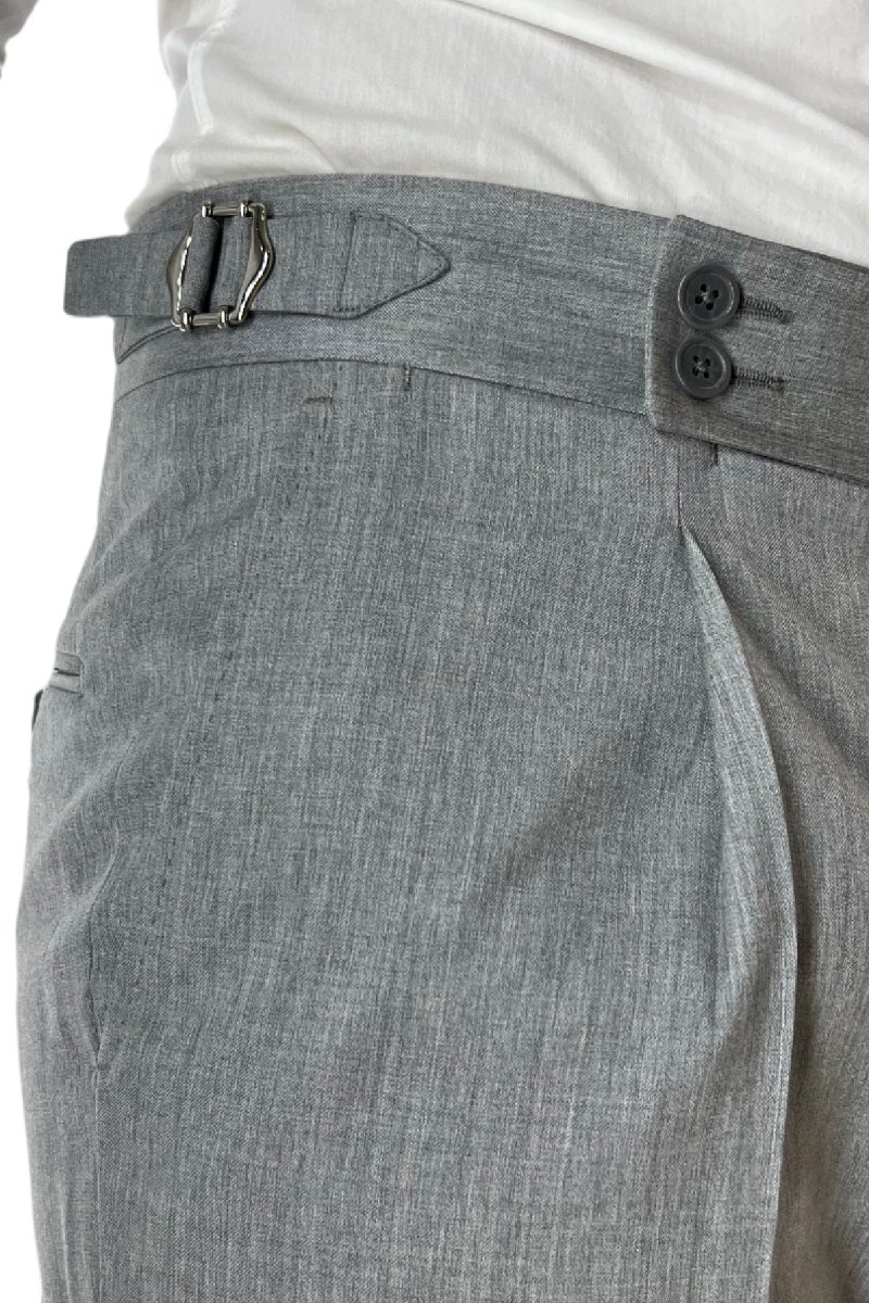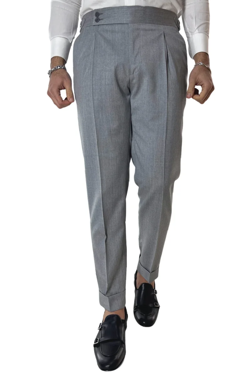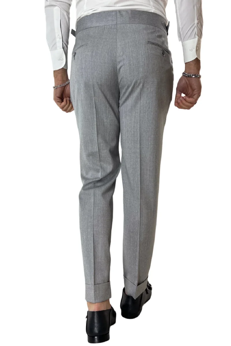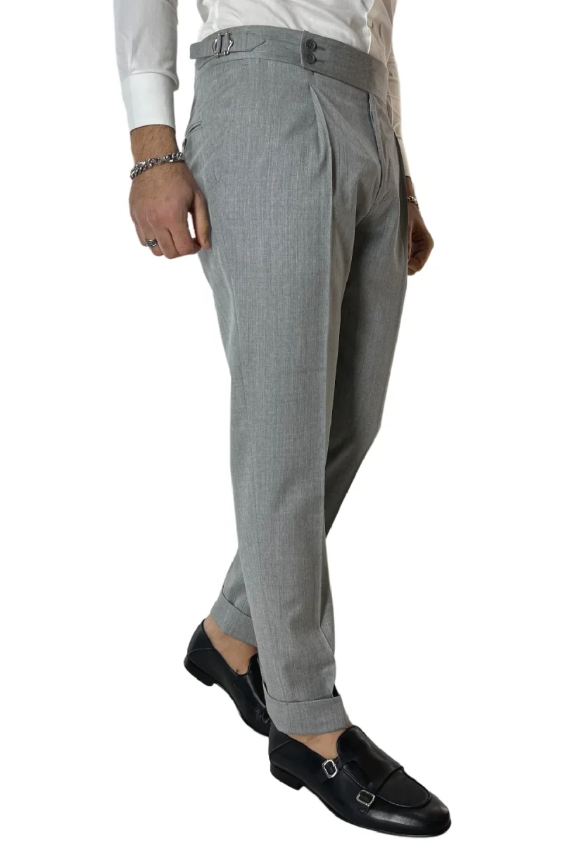 Il Pantalone uomo grigio chiaro fresco lana Vitale Barberis vita alta con pinces fibbie laterali e risvolto 4cm di CARILLO MODA e ormai per i nostri clienti sinonimo di garanzia e qualita. Questo modello, viene scelto da una tipologia di persone che amano vestire bene e nello stesso tempo scelgono la comodita. Infatti grazie alle caratteristiche del tessuto e delle pences permette a chi lo indossa di scegliere la sua misura perfetta e non preoccuparsi delle limitazioni dei movimenti nonostante la sua vestibilita’ slim.