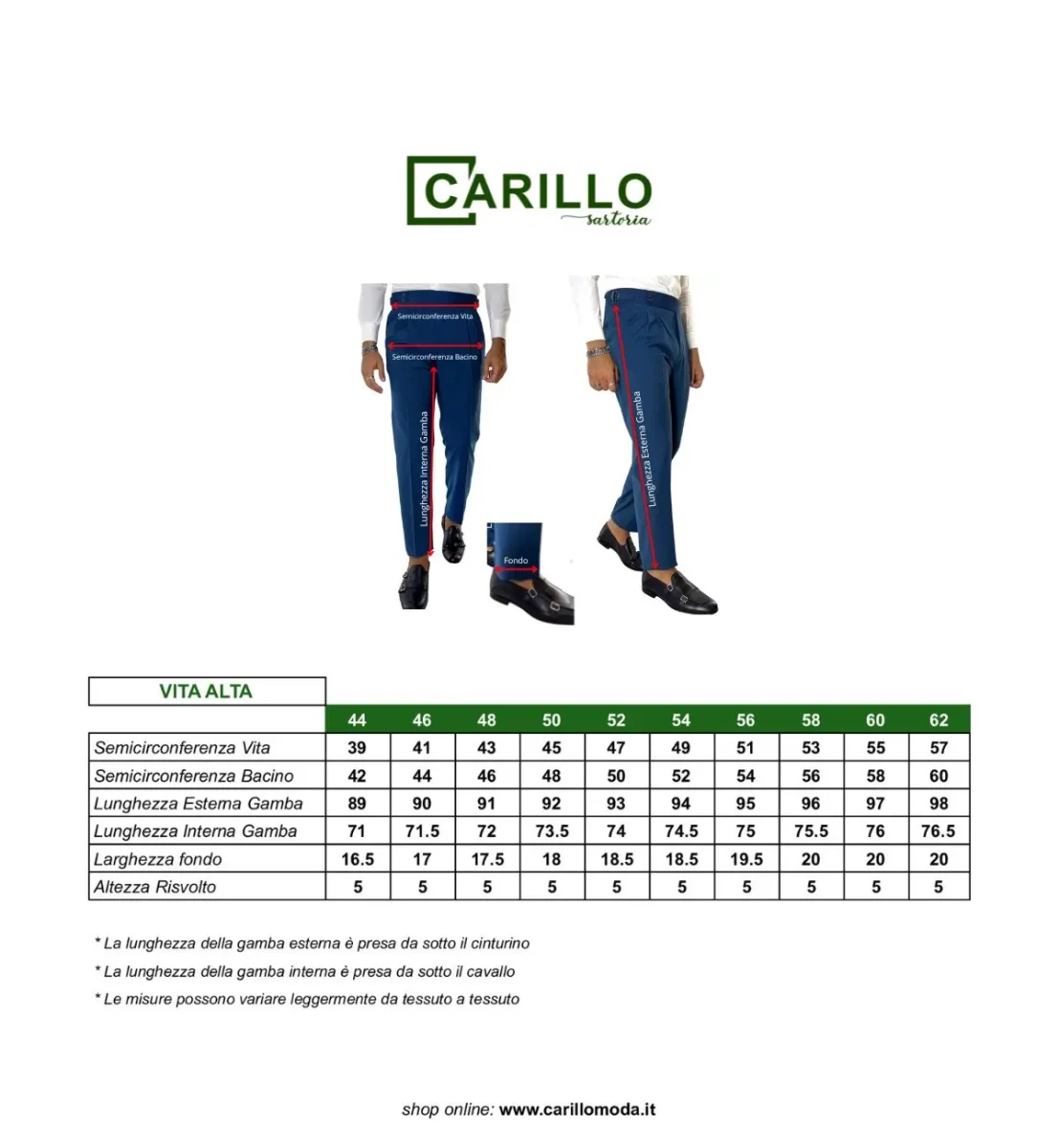 – La vestiblilità dei nostri Pantaloni Sartoriali è Regular, se invece cerchi una vestibilità più slim prendi tranquillamente una taglia in meno.