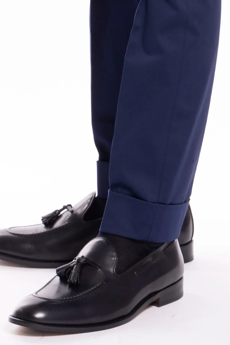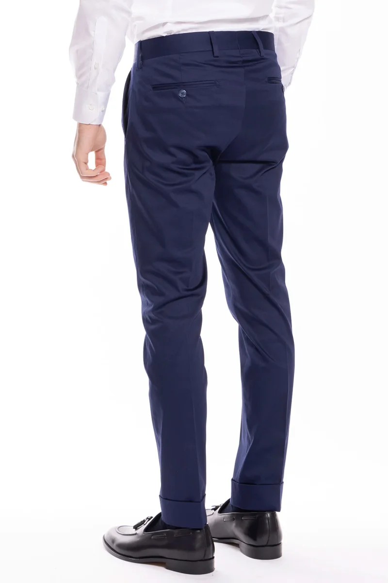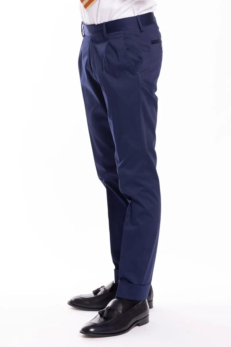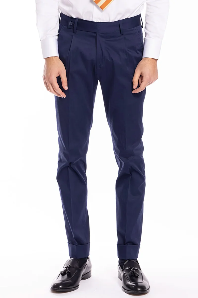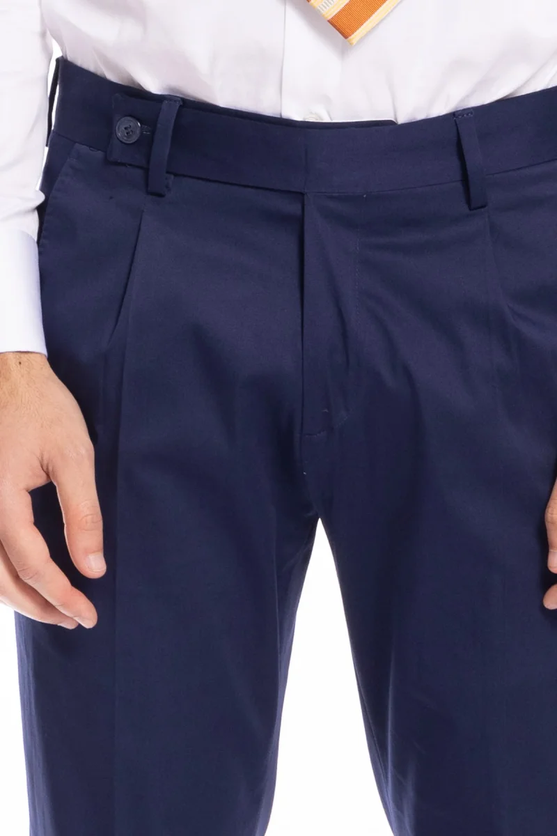 PANTALONE UOMO NAVY BLU DI COTONE LEGGERMENTE ELASTICO TASCA AMERICA CON UNA PINCES E RISVOLTO 4CM