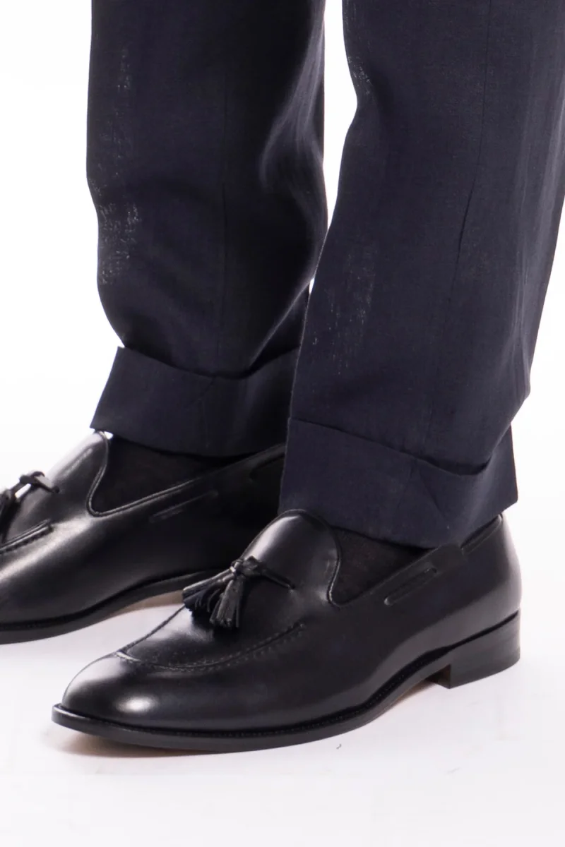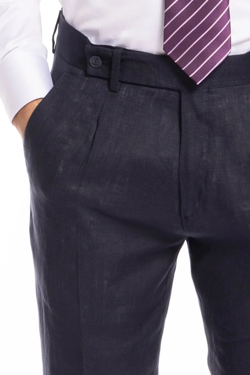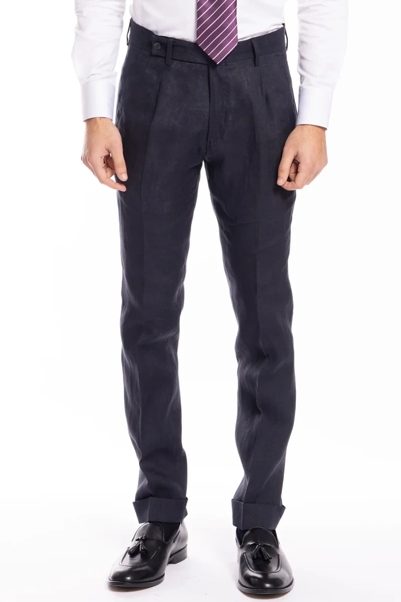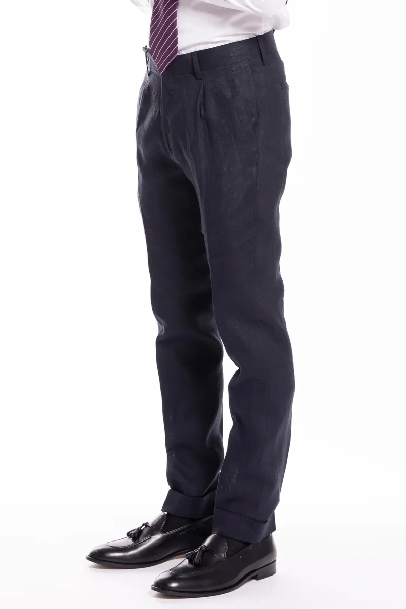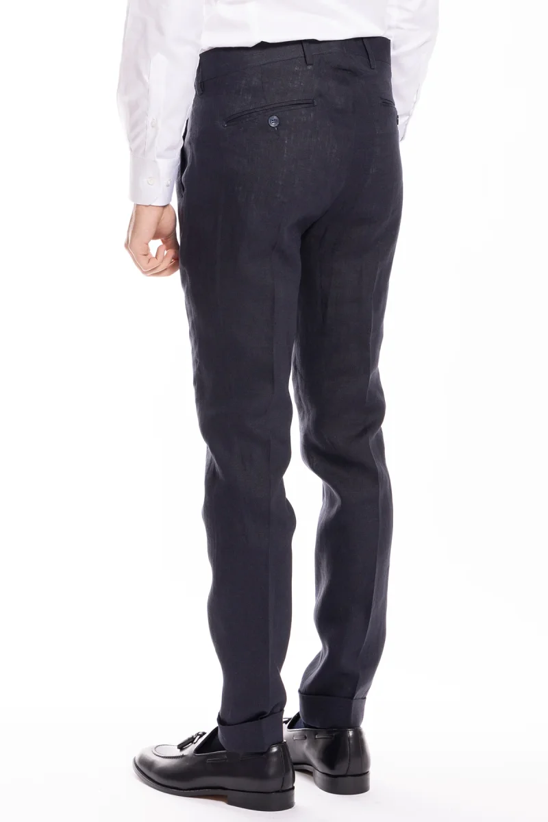 PANTALONE UOMO NAVY BLU DI LINO 100% TASCA AMERICA CON UNA PINCES E RISVOLTO 4CM