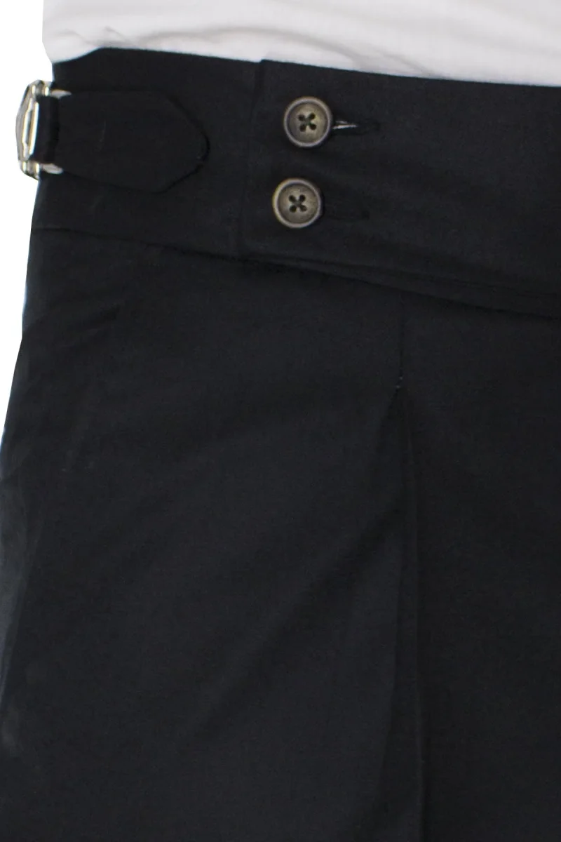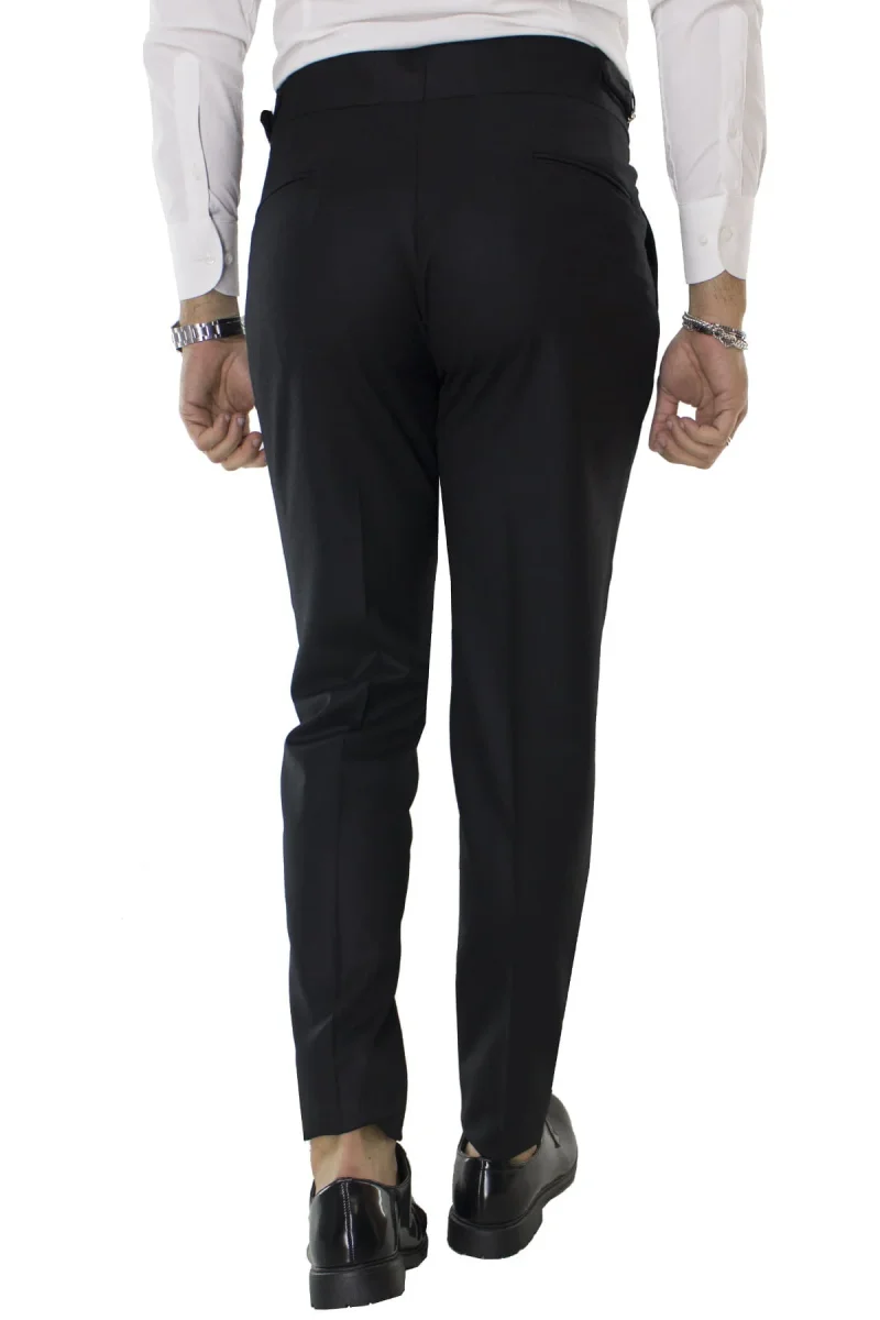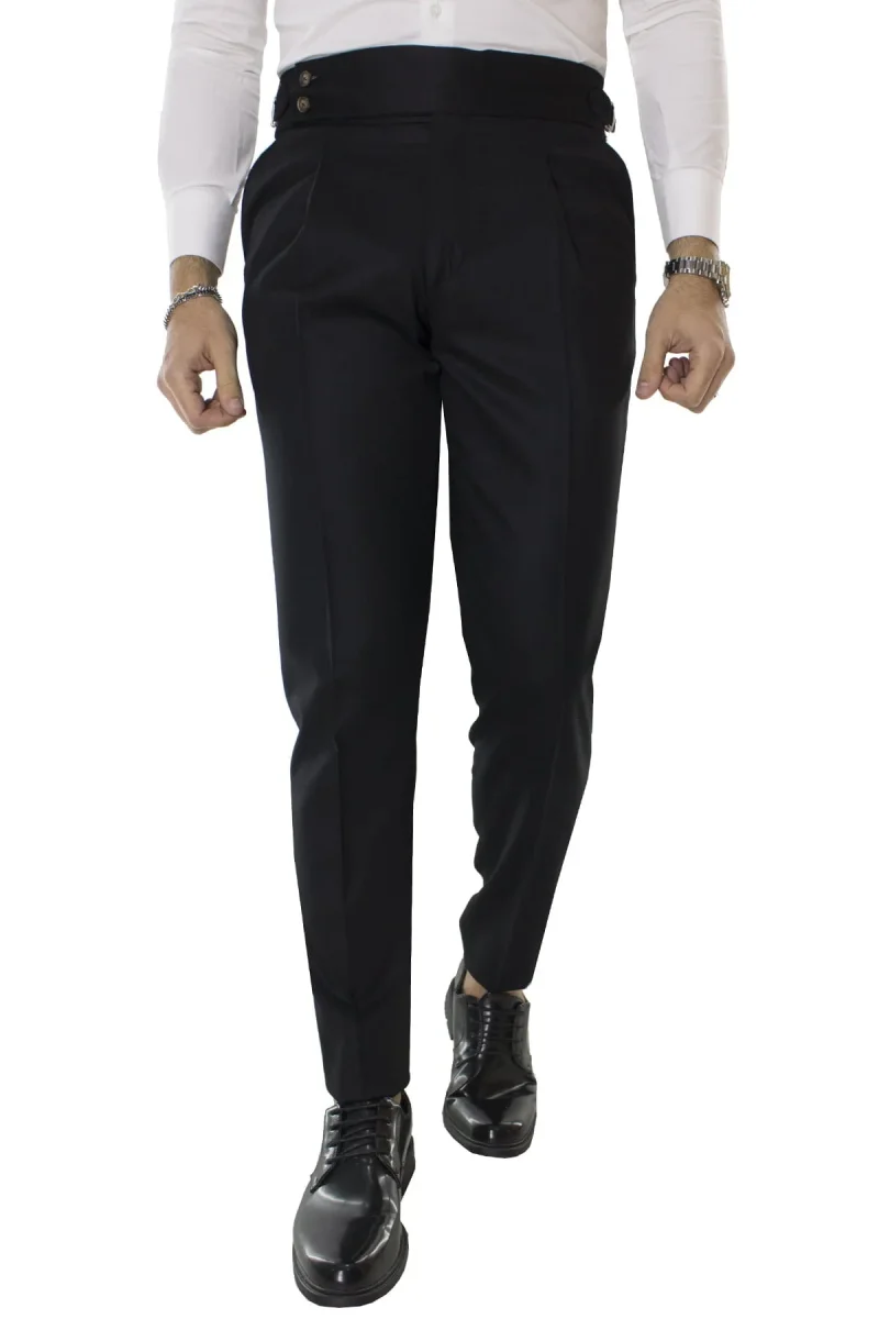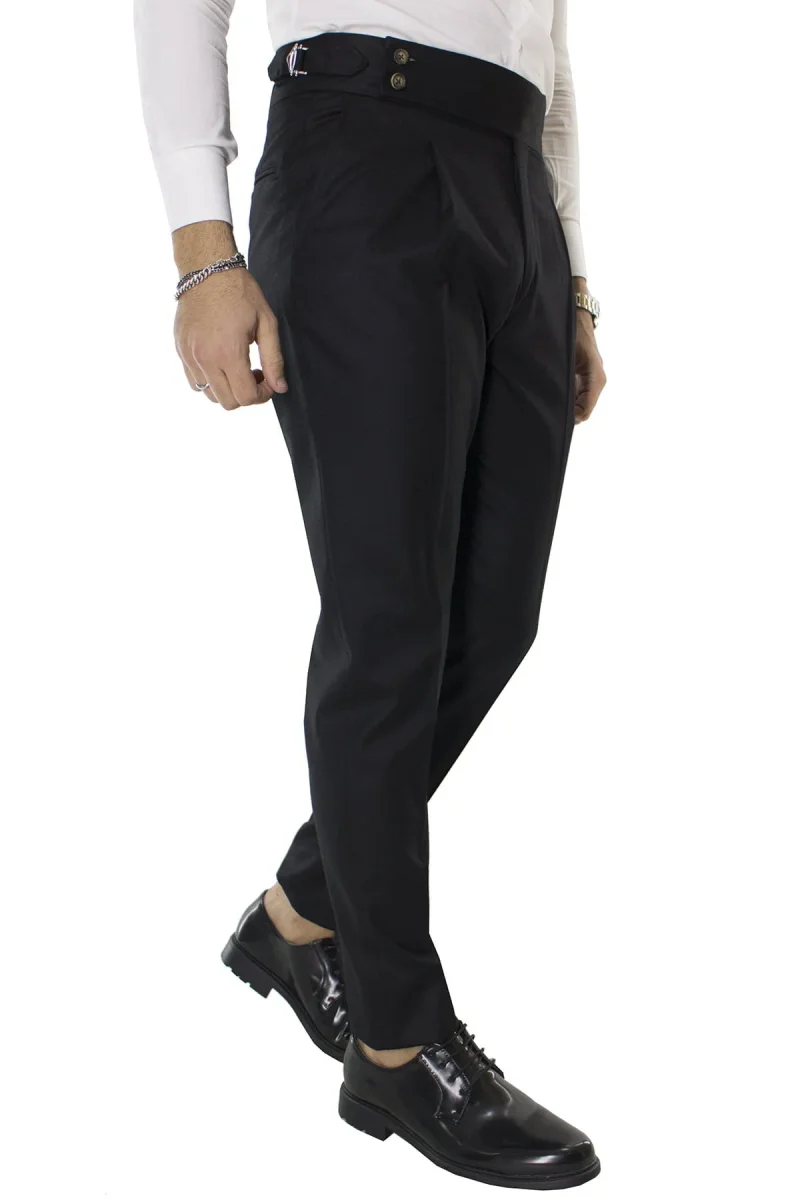 Il Pantalone uomo nero in lana vita alta con pinces e fibbie laterali vitale barberis canonico della linea SARTORIA CARILLO e ormai per i nostri clienti sinonimo di garanzia e qualita. Questo modello, viene scelto da una tipologia di persone che amano vestire bene e nello stesso tempo scelgono la comodita. Infatti grazie alle caratteristiche del tessuto e delle pences permette a chi lo indossa di scegliere la sua misura perfetta e non preoccuparsi delle limitazioni dei movimenti nonostante la sua vestibilita’ slim.