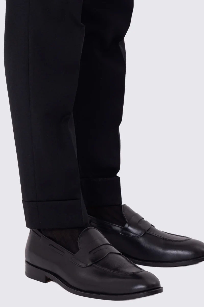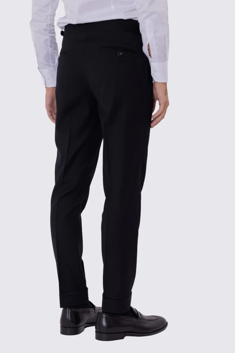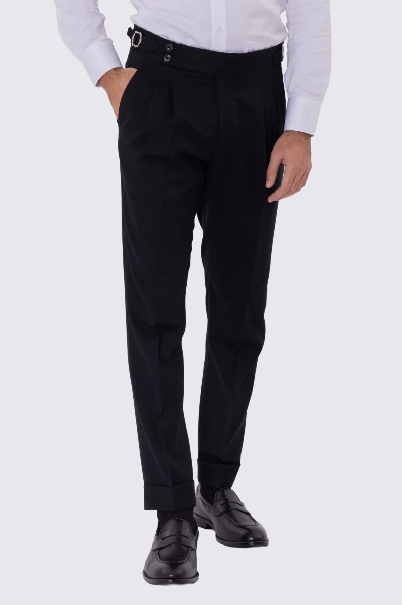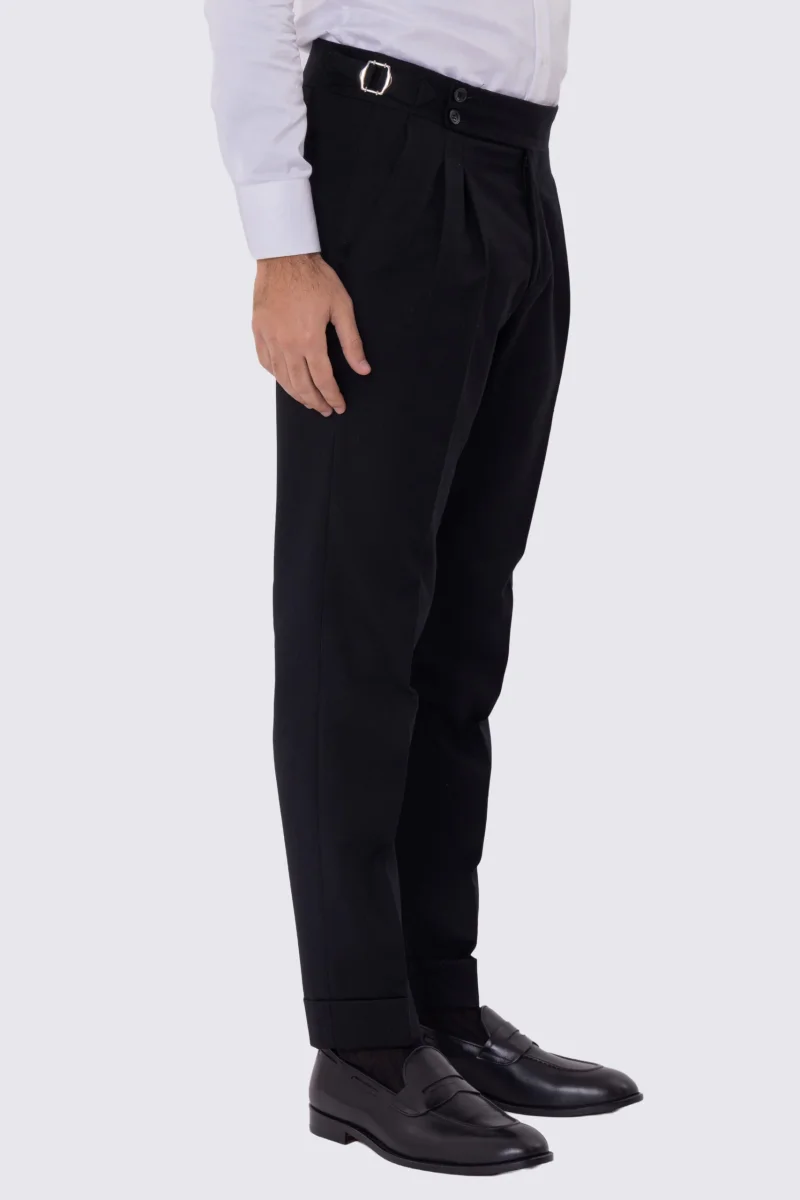 Pantalone uomo nero vita alta con fibbie laterali e doppia pinces tasca america in cotone 290gr invernale risvolto 5cm made in italy