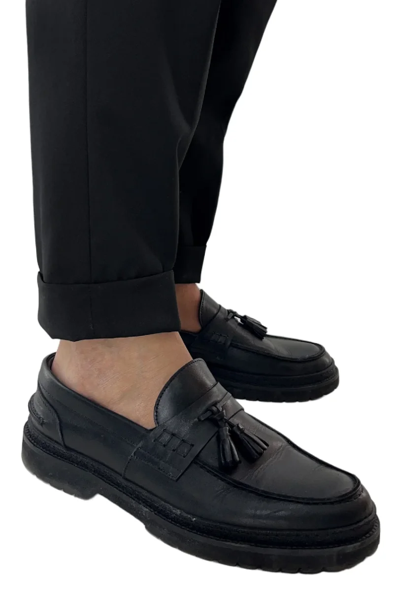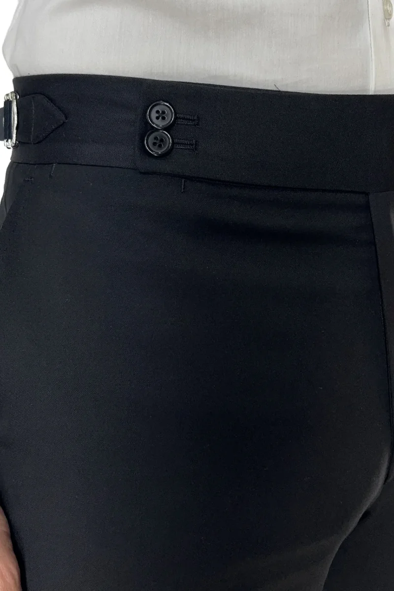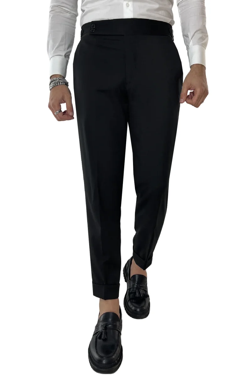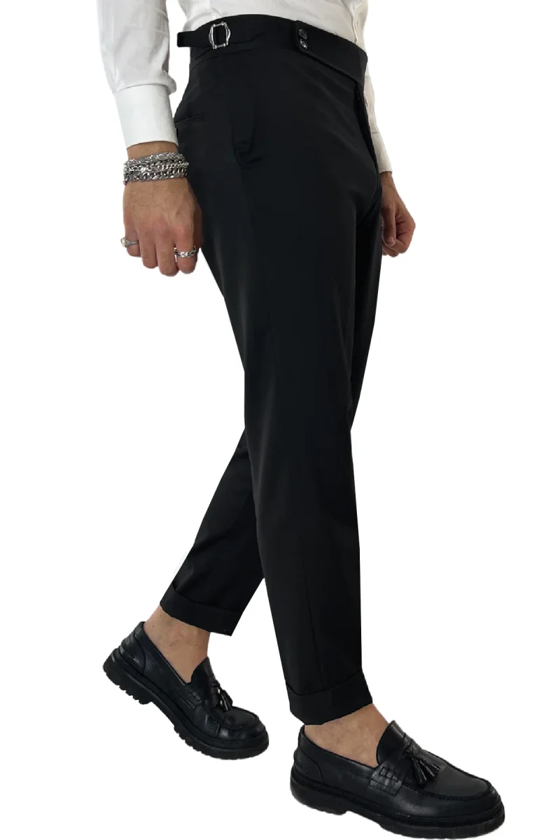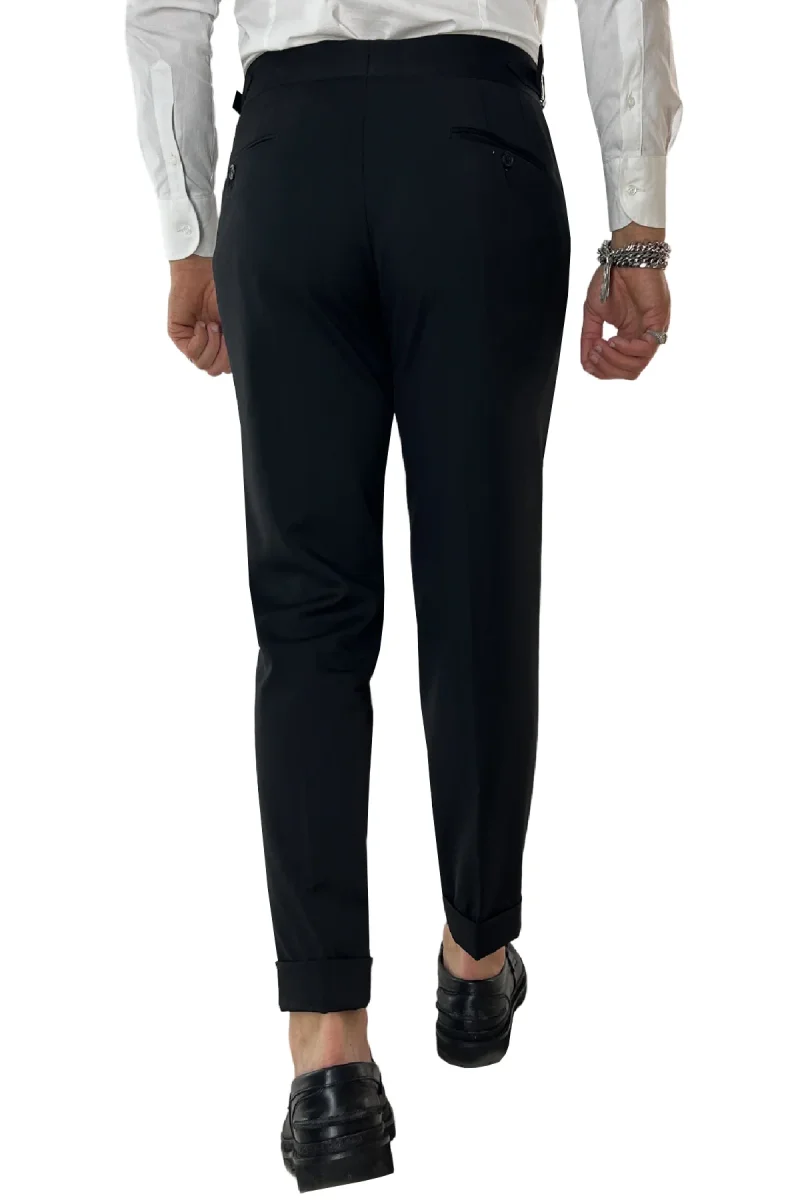 Il Pantalone uomo Nero vita alta tasca america in fresco lana 100% Vitale Barberis Canonico fibbie laterali e risvolto 4cm di CARILLO MODA e ormai per i nostri clienti sinonimo di garanzia e qualita. Questo modello, viene scelto da una tipologia di persone che amano vestire bene e nello stesso tempo scelgono la comodita. Infatti grazie alle caratteristiche del tessuto permette a chi lo indossa di scegliere la sua misura perfetta e non preoccuparsi delle limitazioni dei movimenti nonostante la sua vestibilita’ slim.