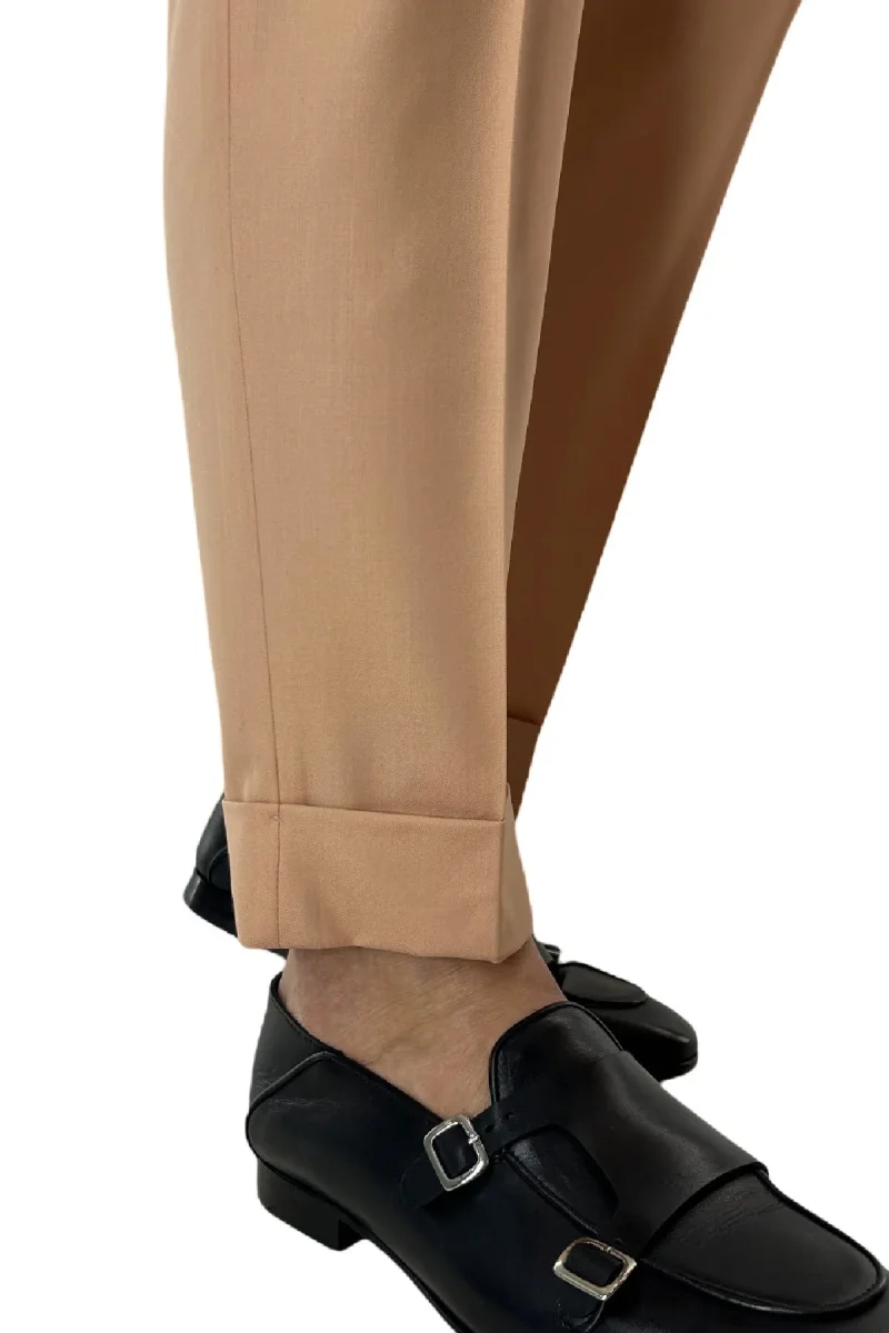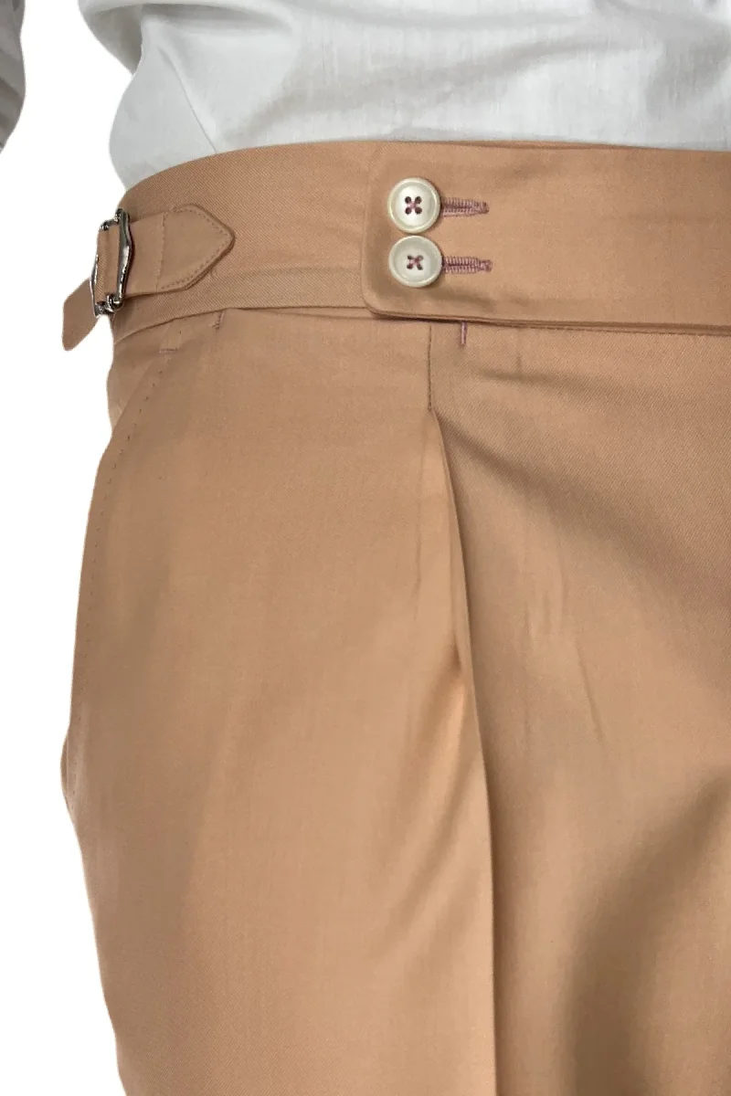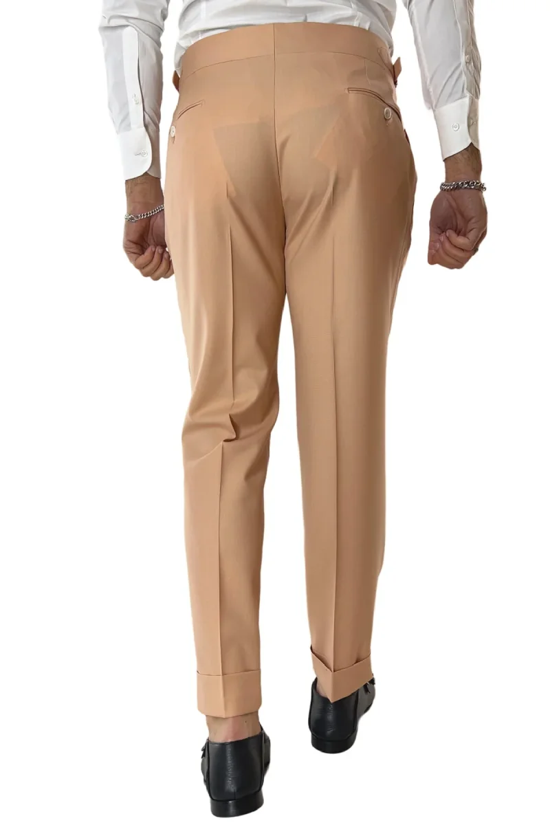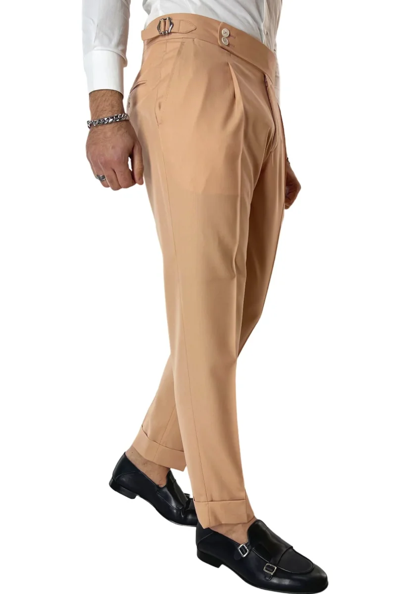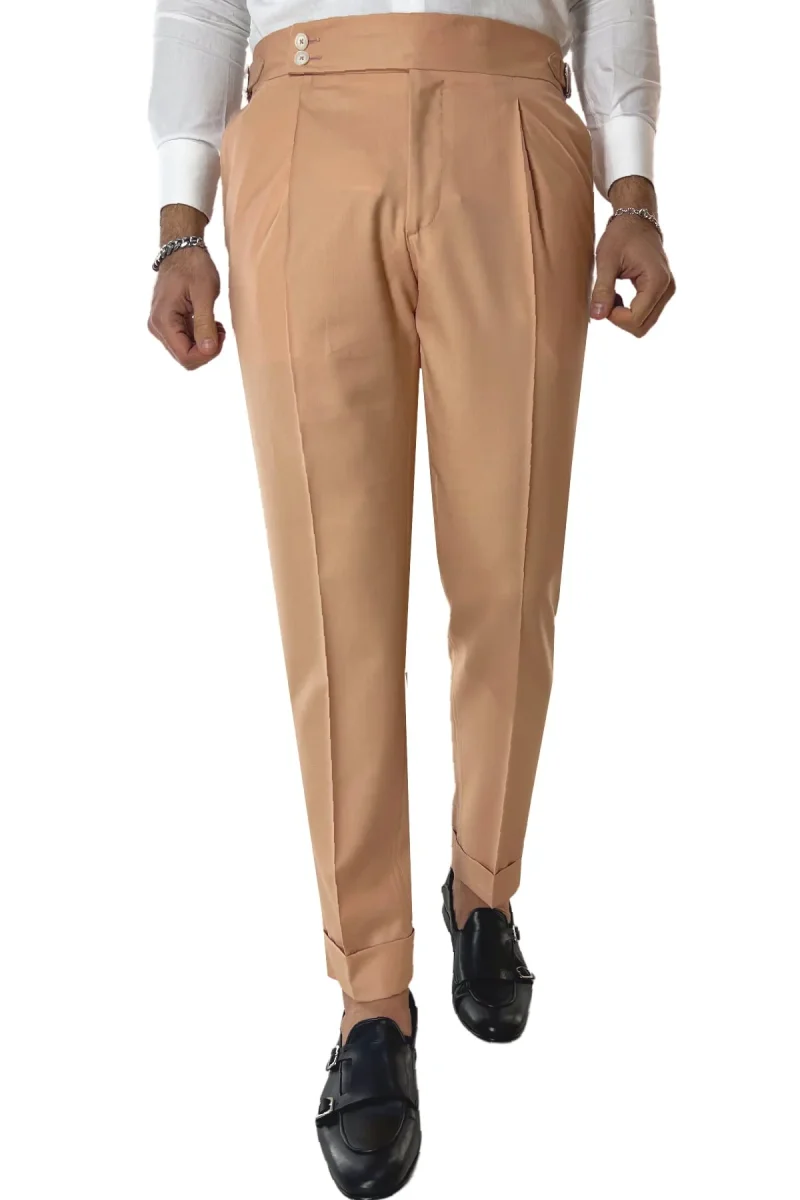 Il Pantalone uomo Pesca in fresco lana 140’s Holland & Sherry vita alta con pinces fibbie laterali e risvolto 4cm di CARILLO MODA e ormai per i nostri clienti sinonimo di garanzia e qualita. Questo modello, viene scelto da una tipologia di persone che amano vestire bene e nello stesso tempo scelgono la comodita. Infatti grazie alle caratteristiche del tessuto e delle pences permette a chi lo indossa di scegliere la sua misura perfetta e non preoccuparsi delle limitazioni dei movimenti nonostante la sua vestibilita’ slim.