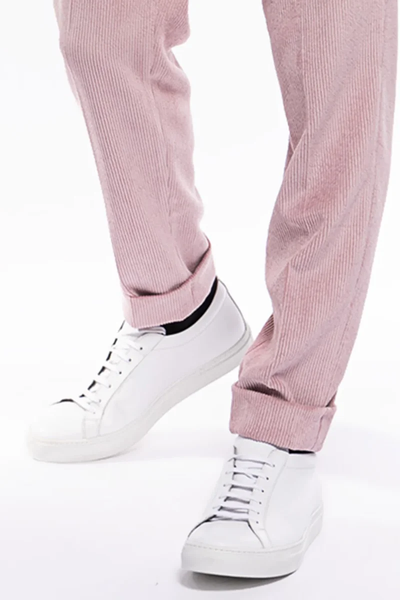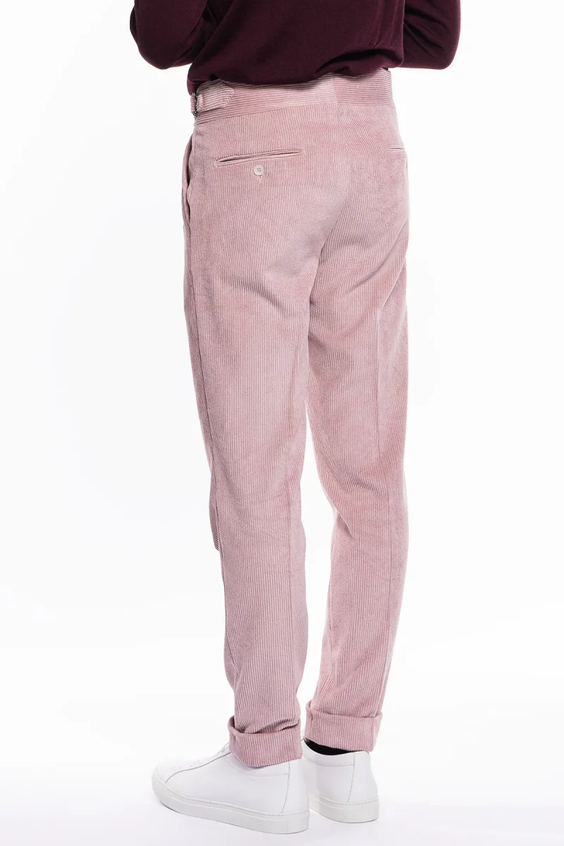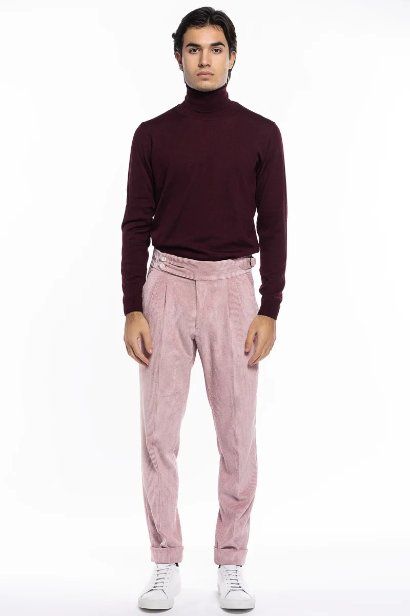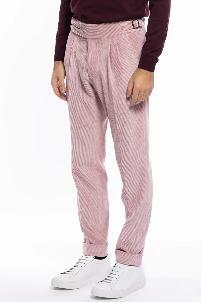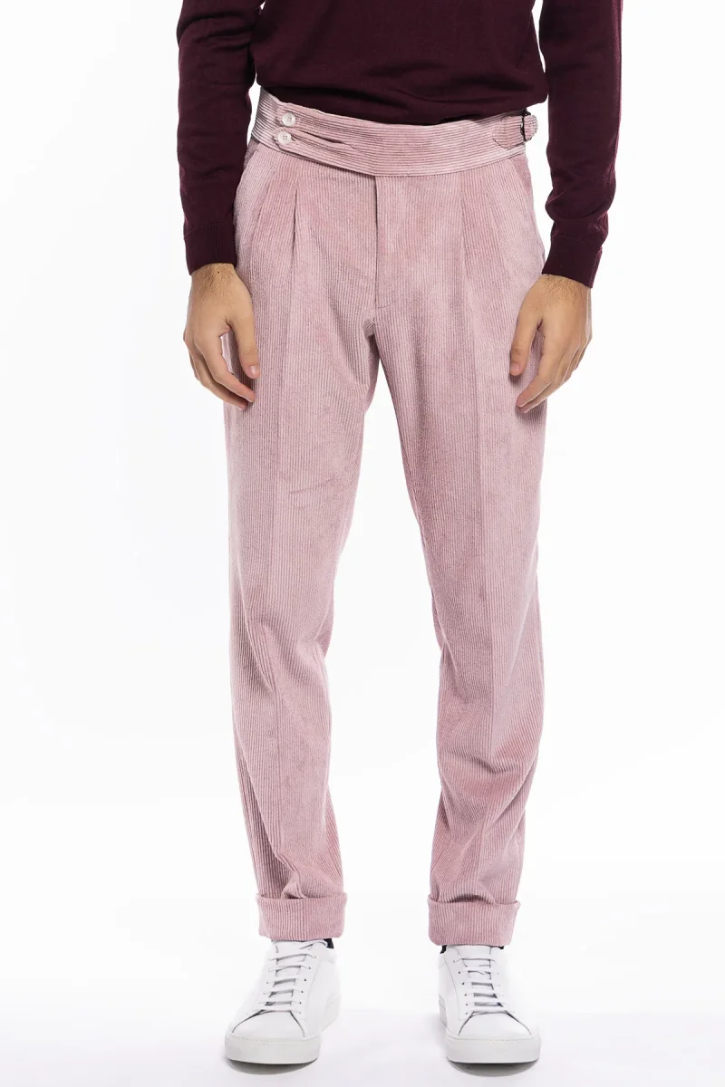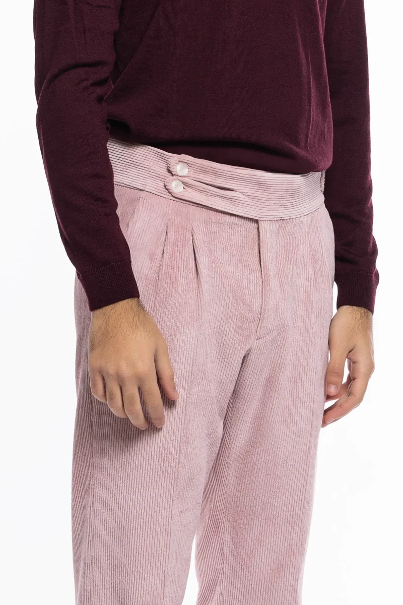 PANTALONE UOMO ROSA VITA ALTA BIFORCATO DOPPIA PINCES IN VELLUTO A COSTINE STRETTE