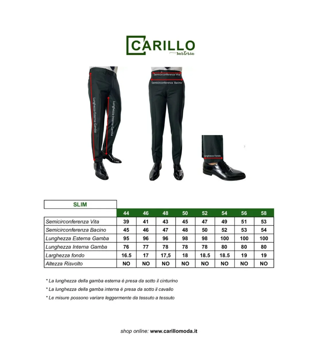 – La vestiblilità dei nostri pantaloni è leggermente slim quindi se cerchi una vestibilità asciutta prendi tranquillamente la tua taglia solita, se cerchi una vestibilità piu comoda ti consigliamo una taglia in più.