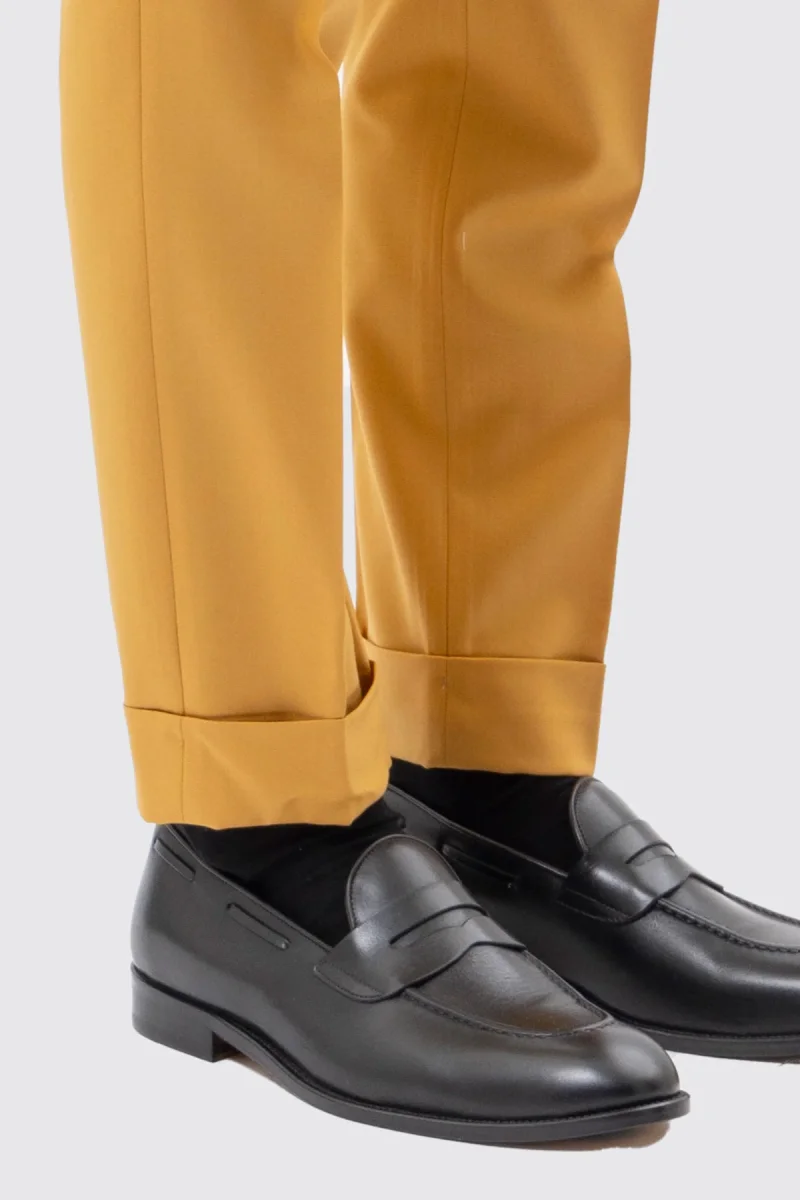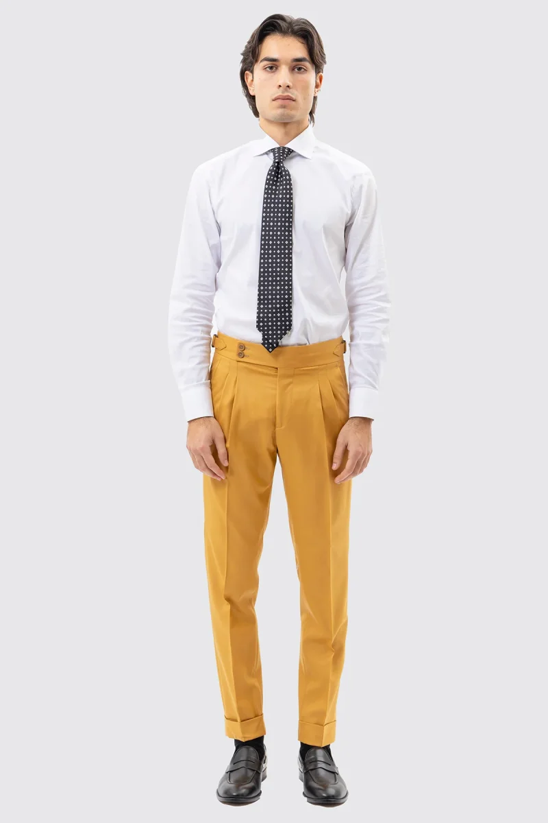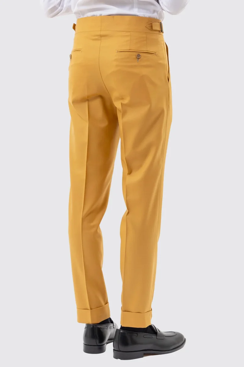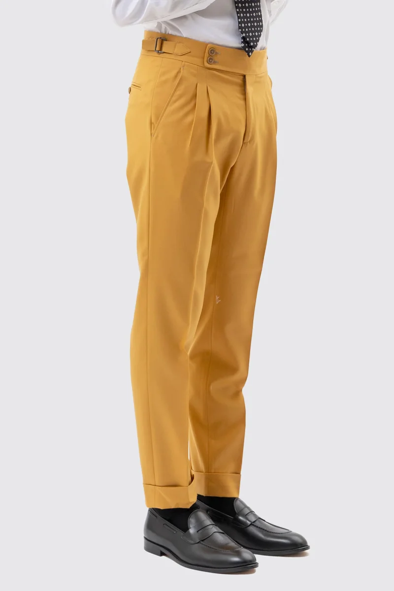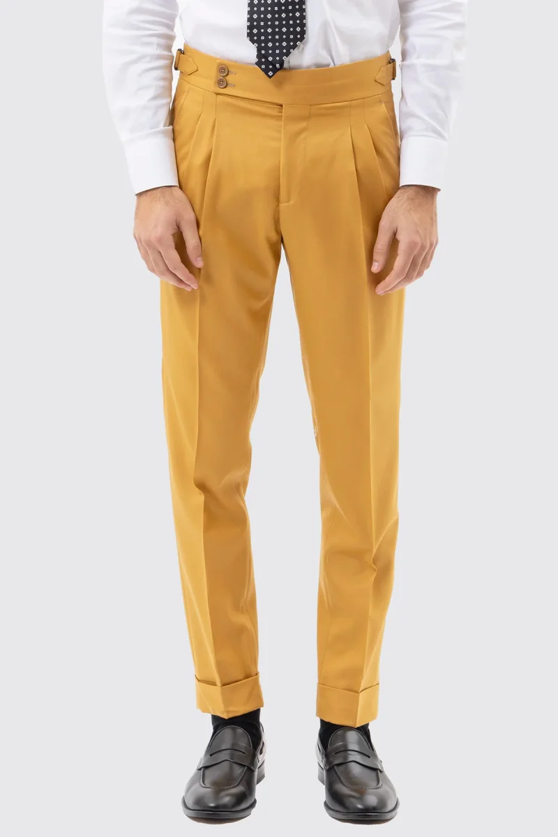 Pantalone Uomo Senape Vita Alta In Fresco Lana Super 140 S Holland & Sherry Fibbie Laterali E Risvolto 5cm