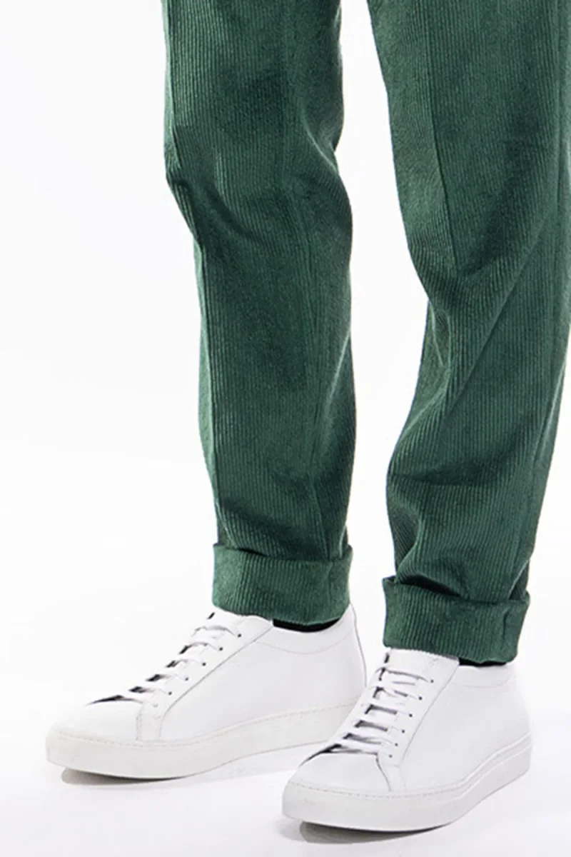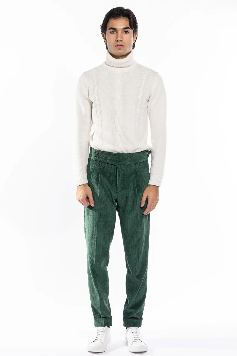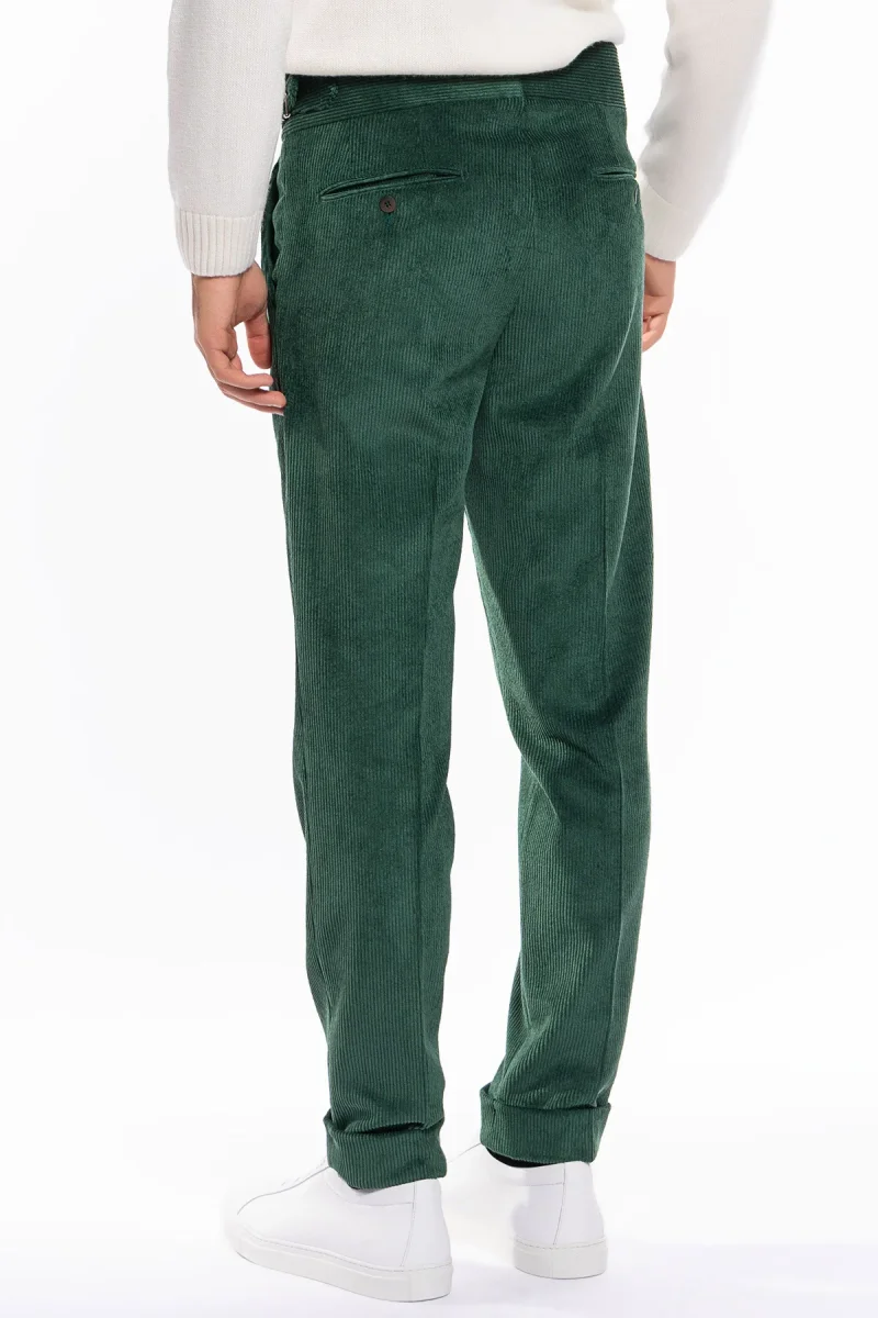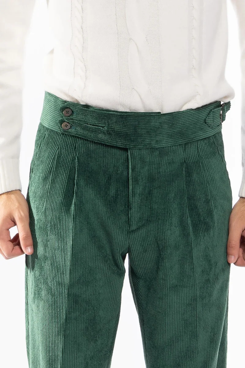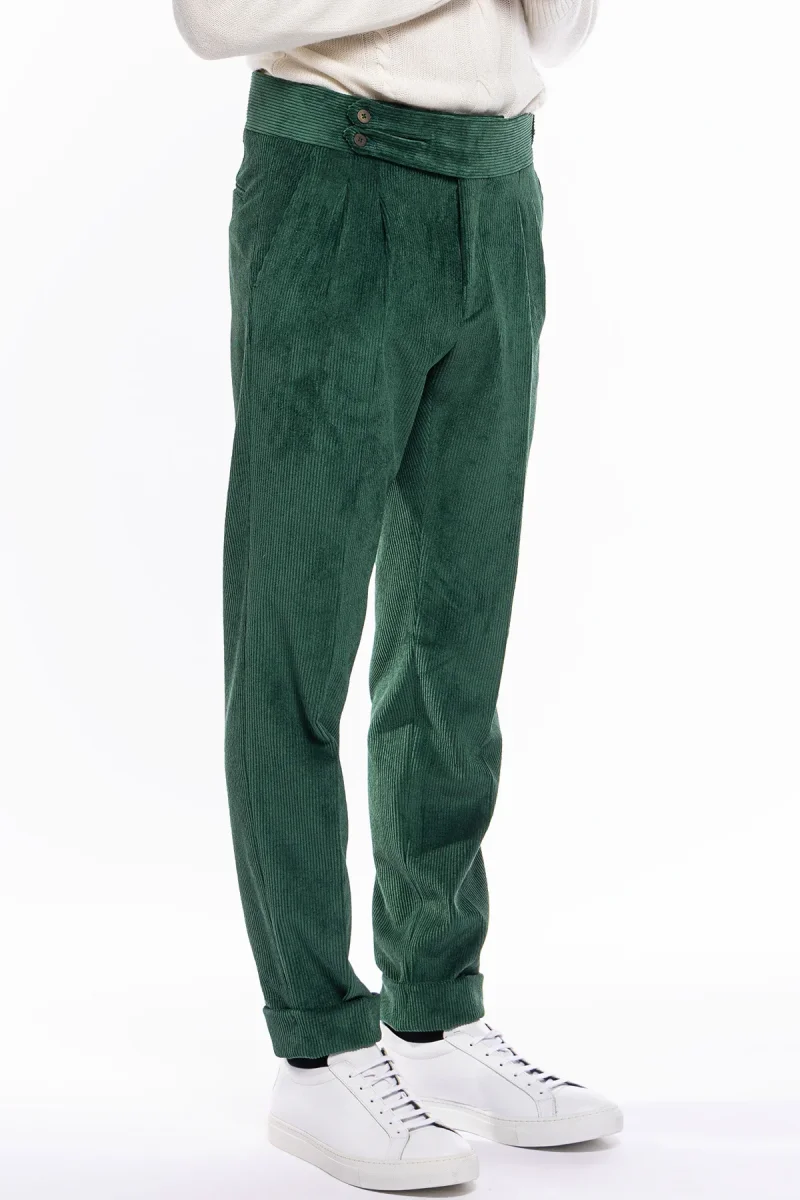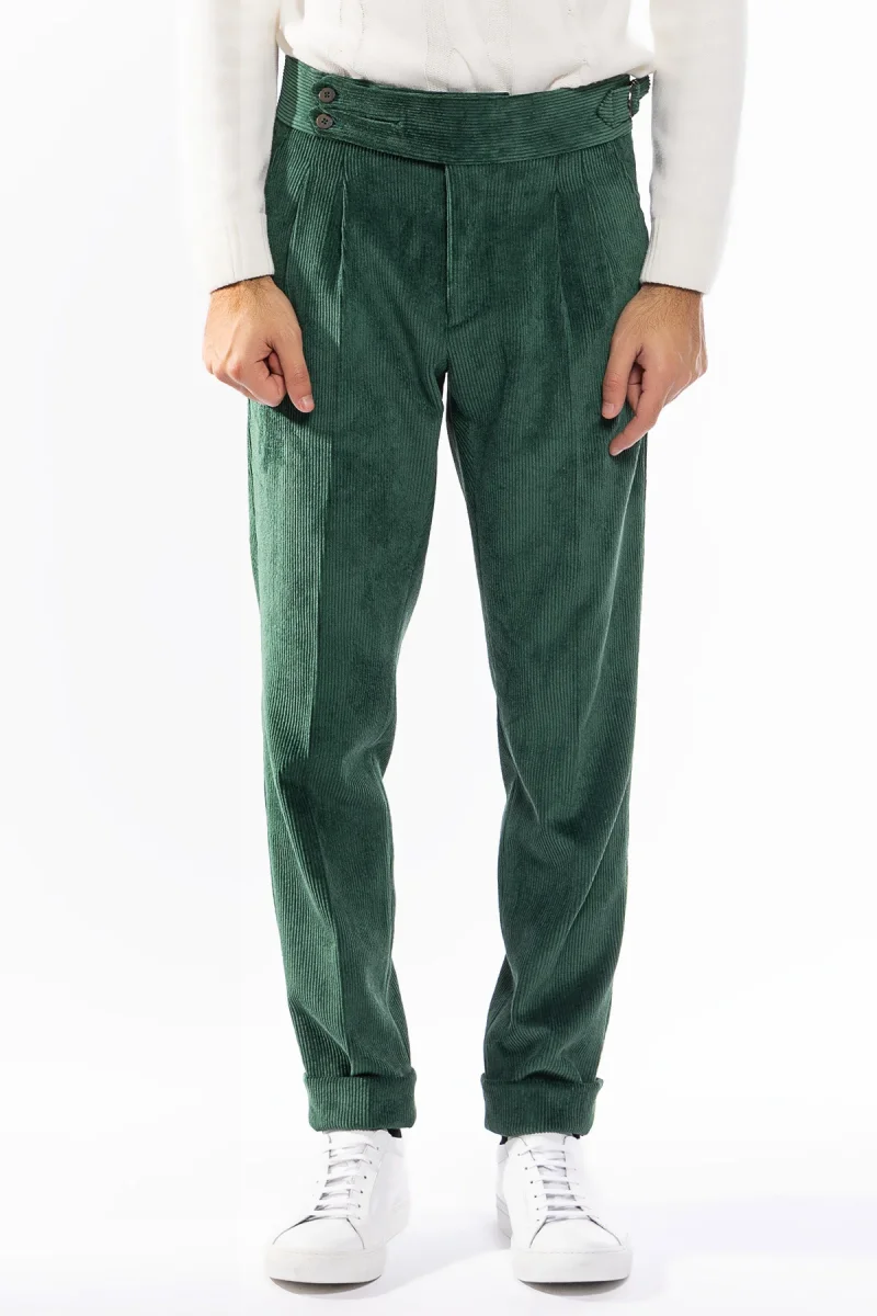 PANTALONE UOMO VERDE BOTTIGLIA VITA ALTA BIFORCATO DOPPIA PINCES IN VELLUTO A COSTINE STRETTE