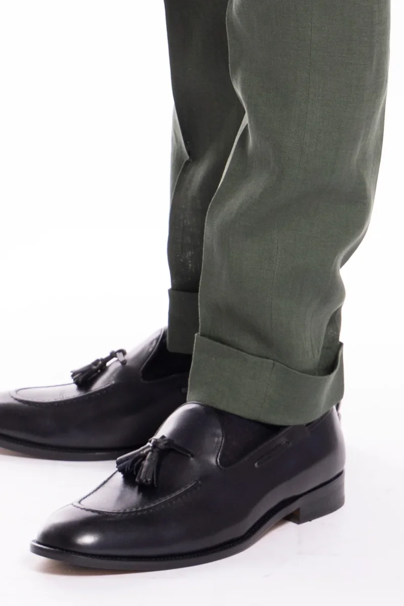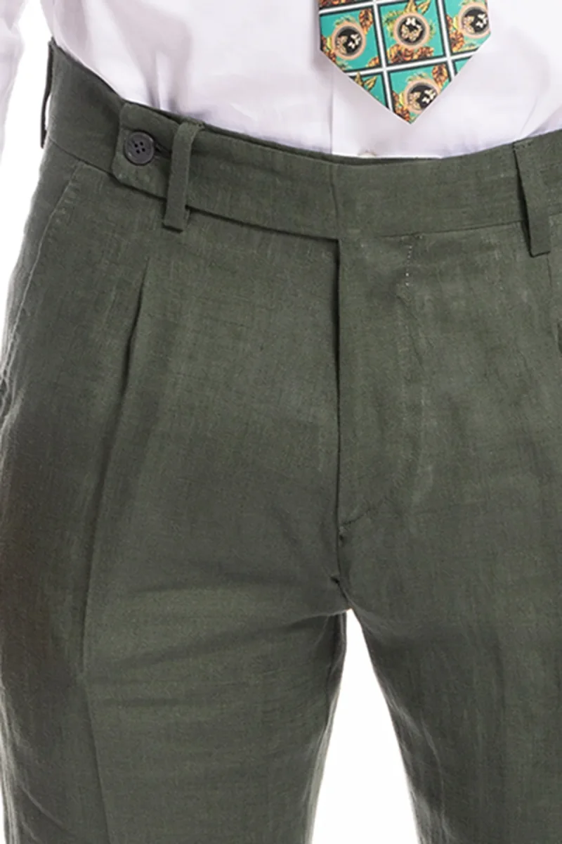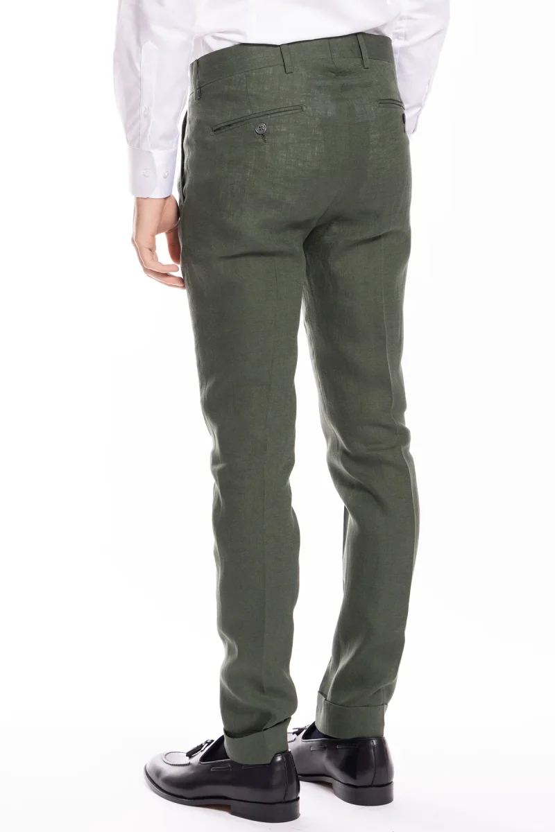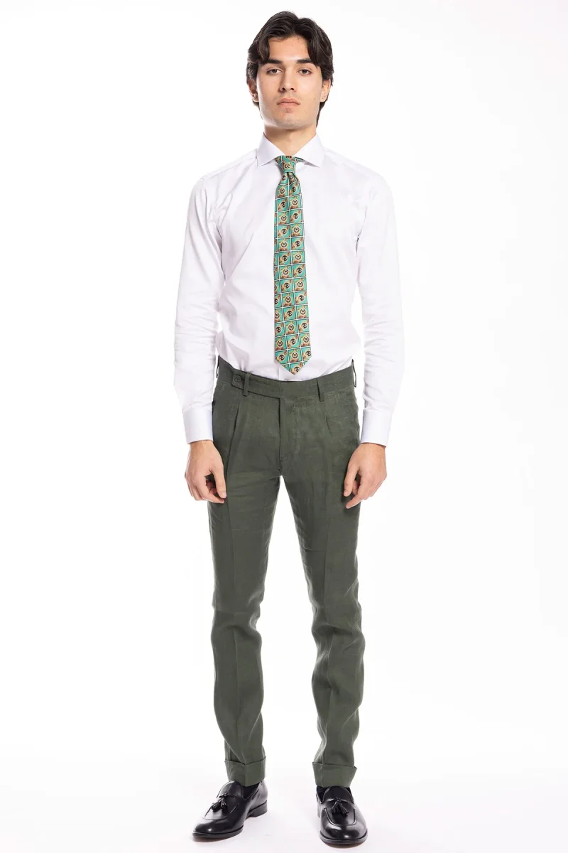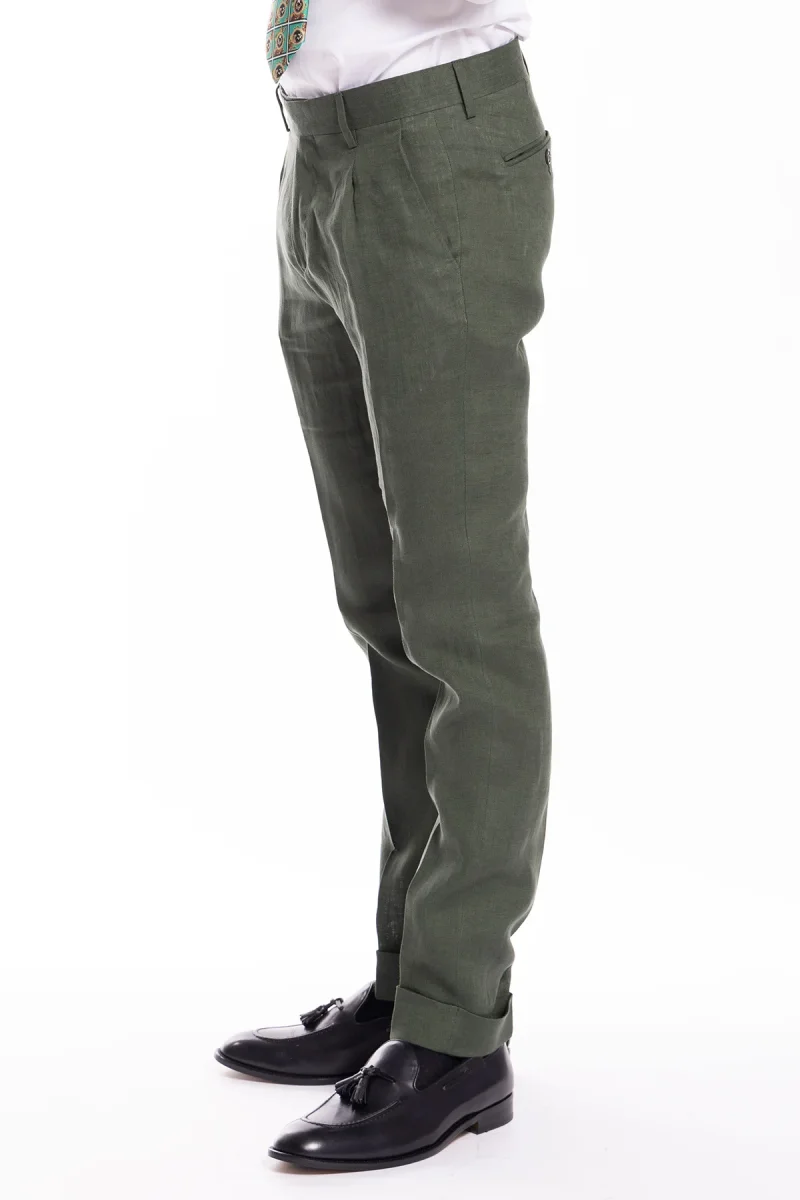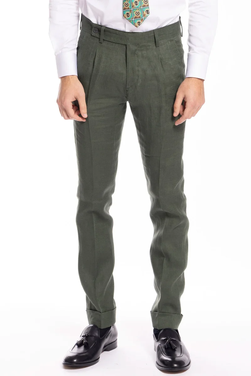 PANTALONE UOMO VERDE DI LINO 100% TASCA AMERICA CON UNA PINCES E RISVOLTO 4CM