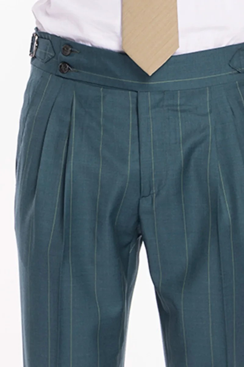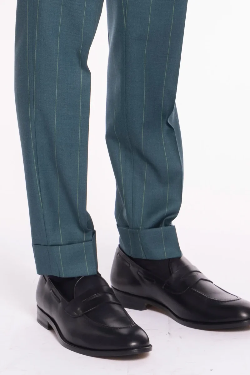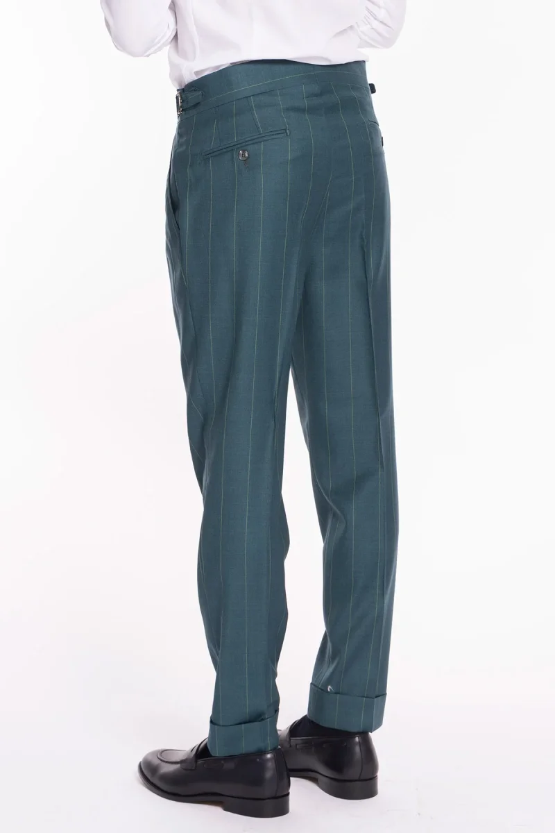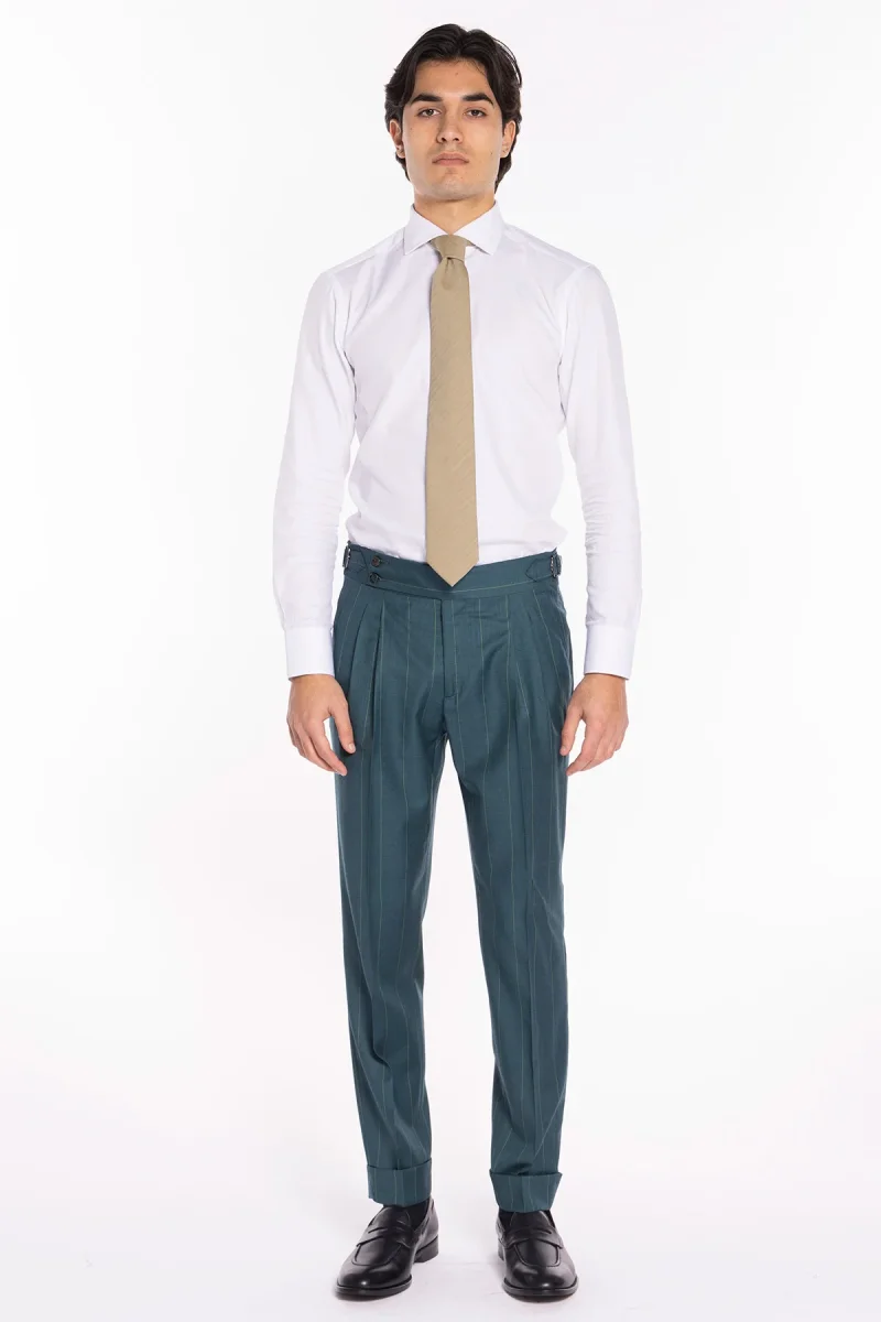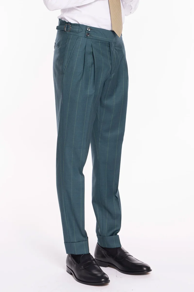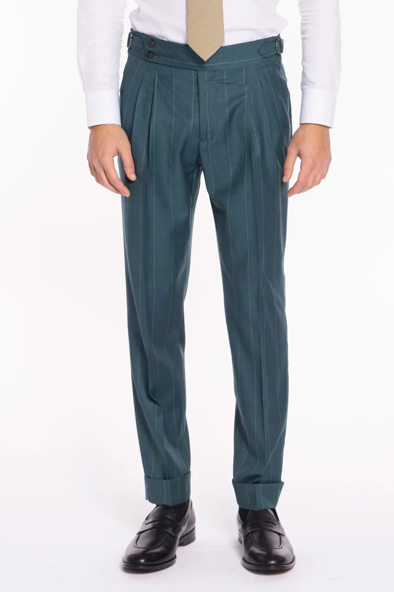 PANTALONE UOMO VERDE GESSATO IN FRESCO LANA SUPER 150’S BRISTOL TESSUTI NAPOLI VITA ALTA CON FIBBIE LATERALI