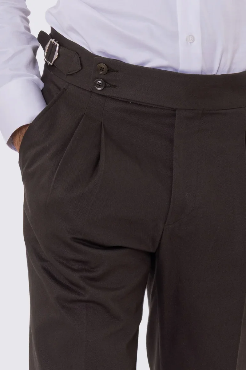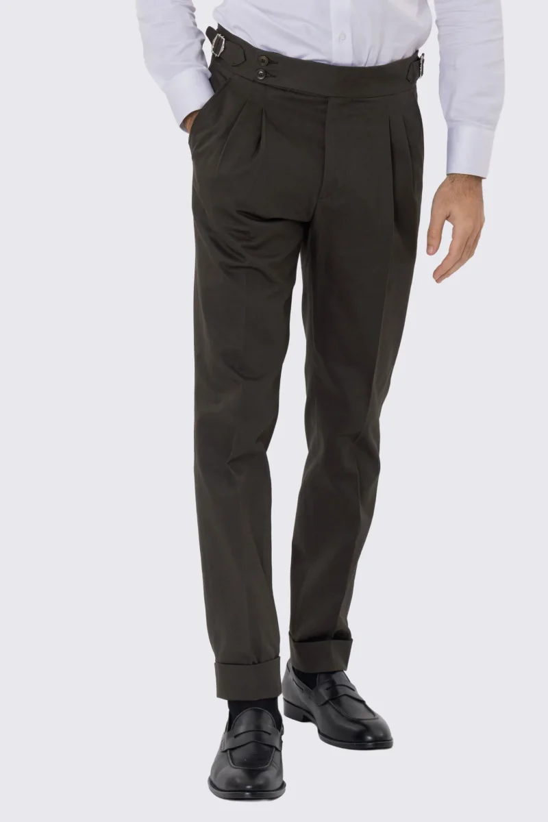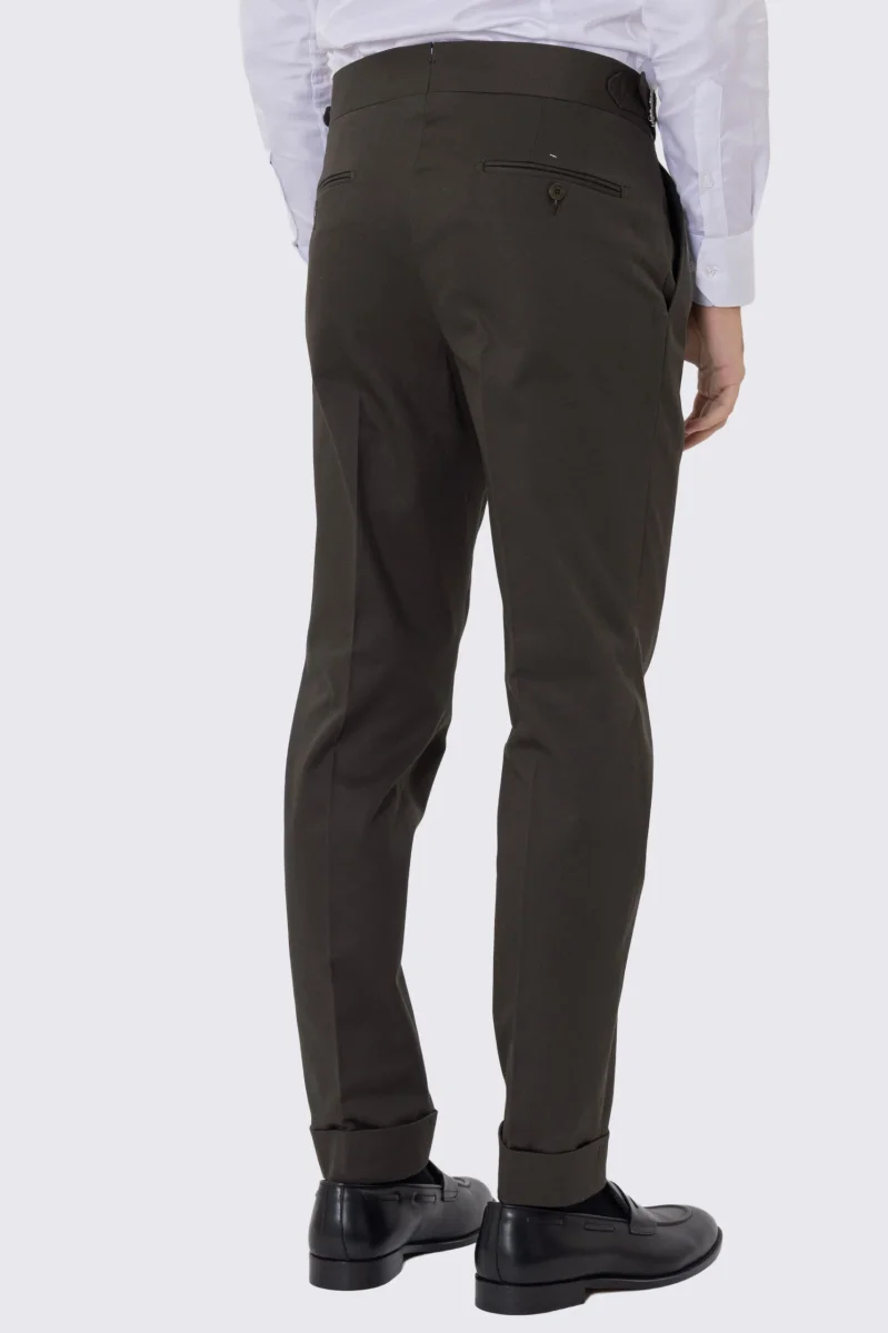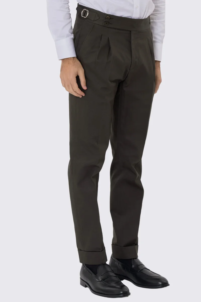 Pantalone uomo Verde militare vita alta con fibbie laterali e doppia pinces tasca america in cotone 290gr invernale risvolto 5cm made in italy