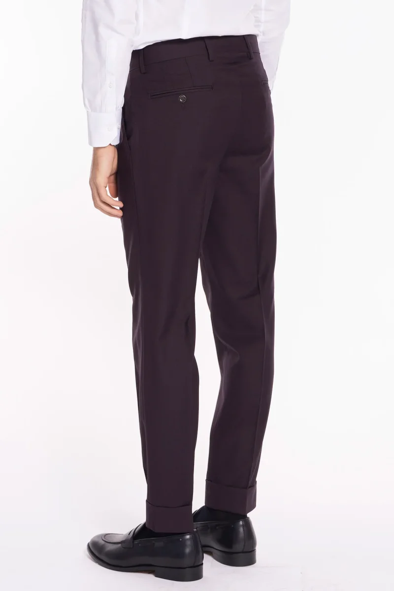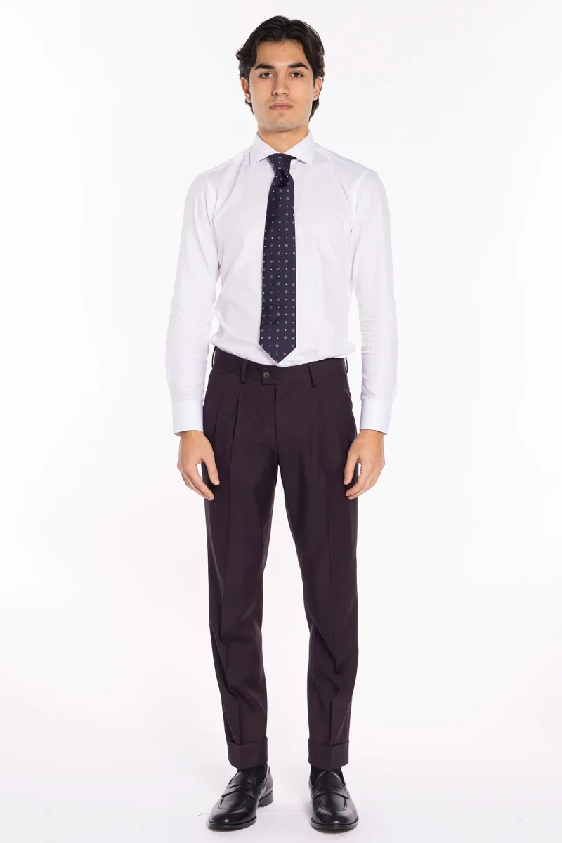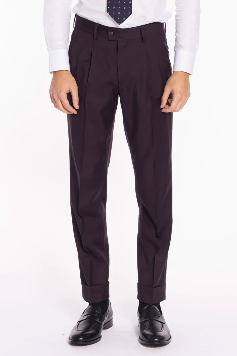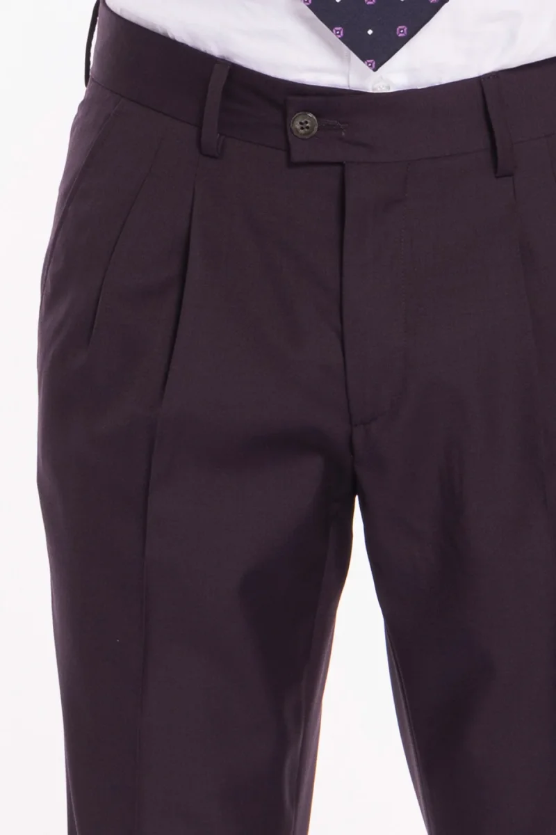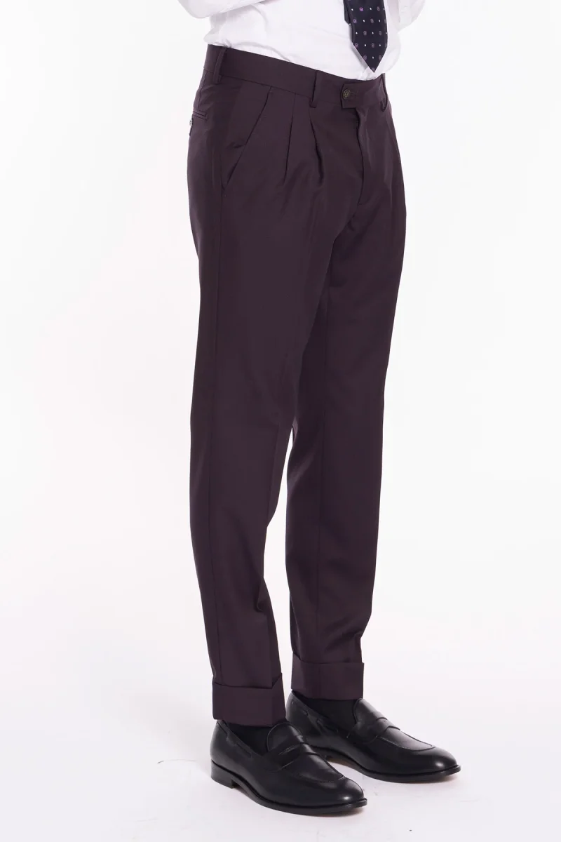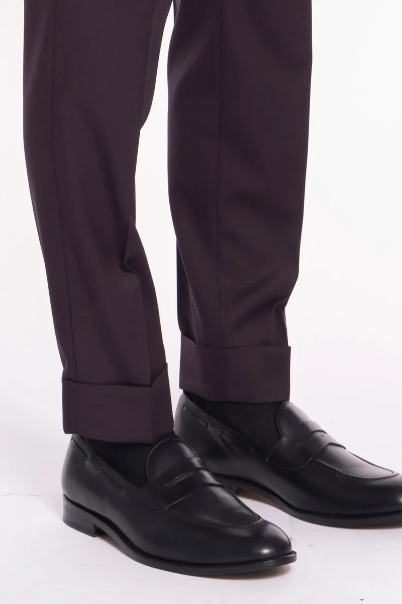 Pantalone uomo viola in fresco lana 120’s Holland & Sherry vita alta doppia pinces e risvolto 5cm
