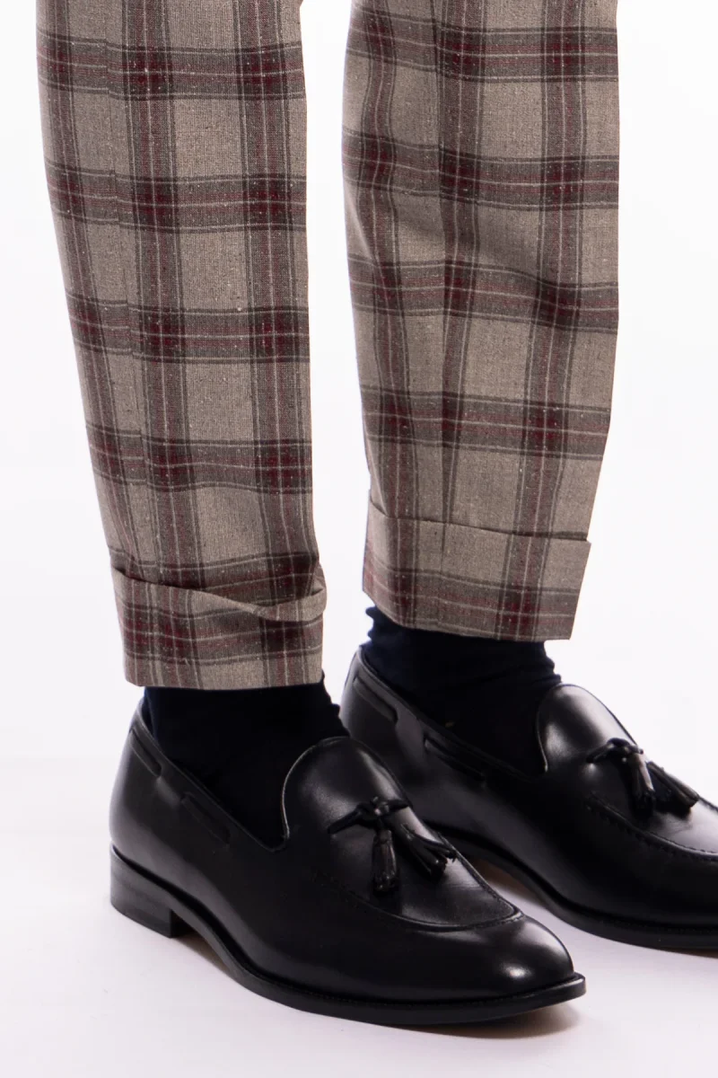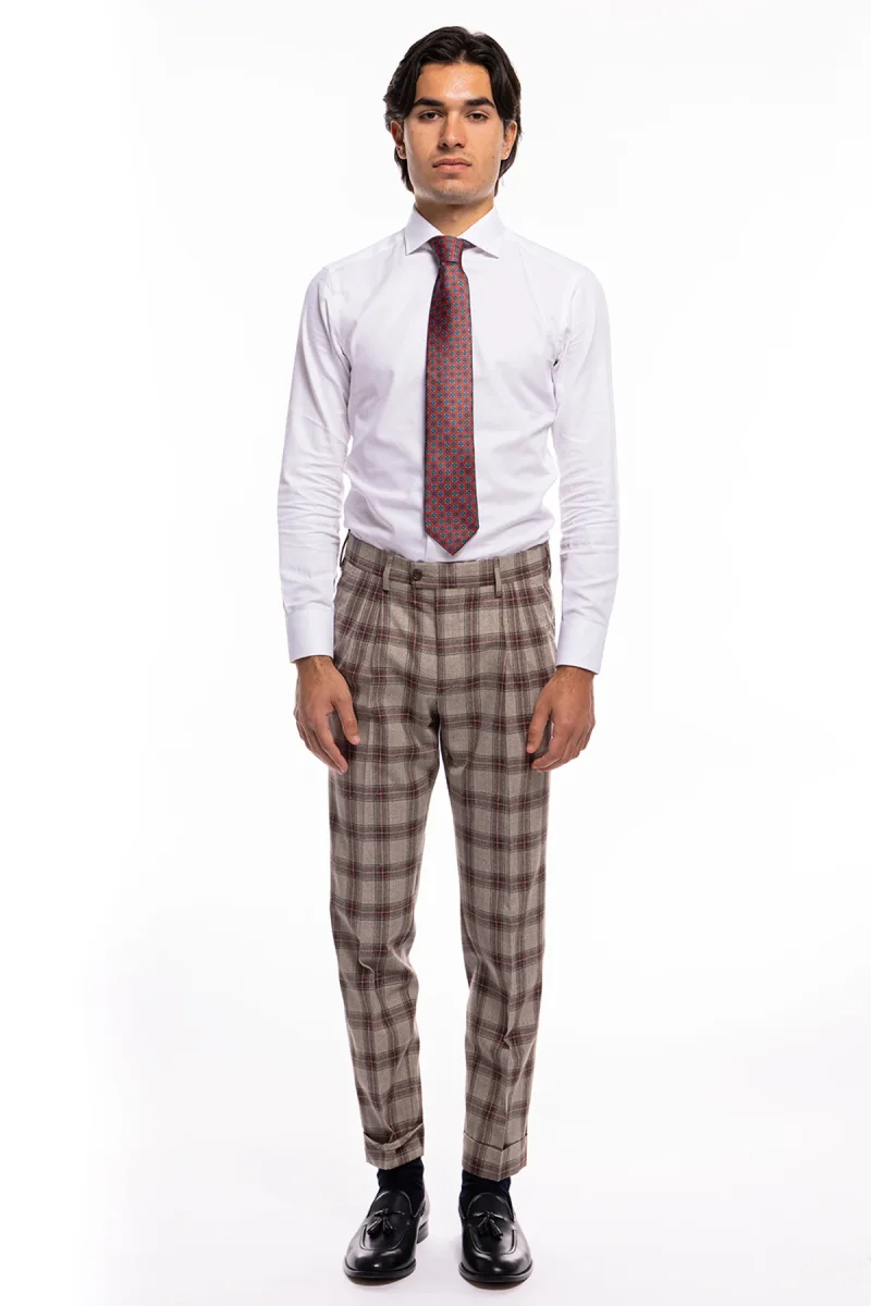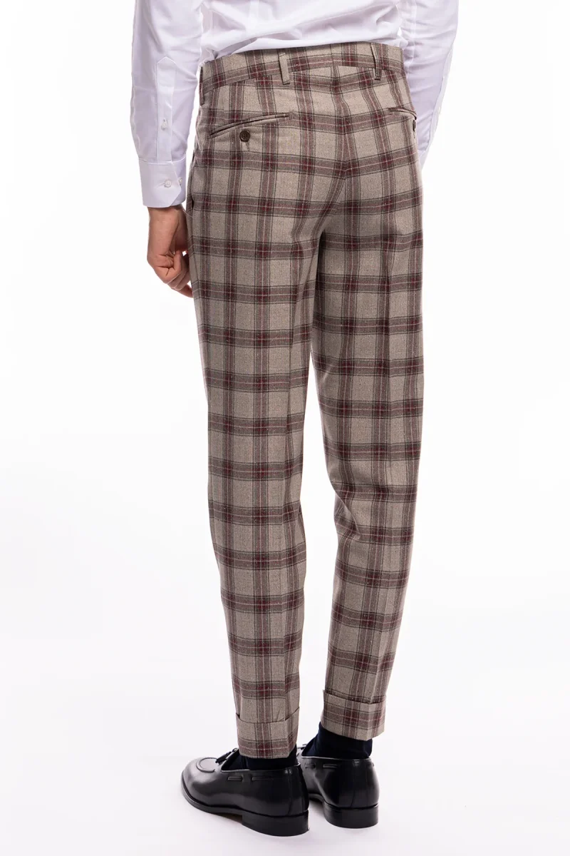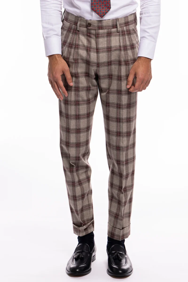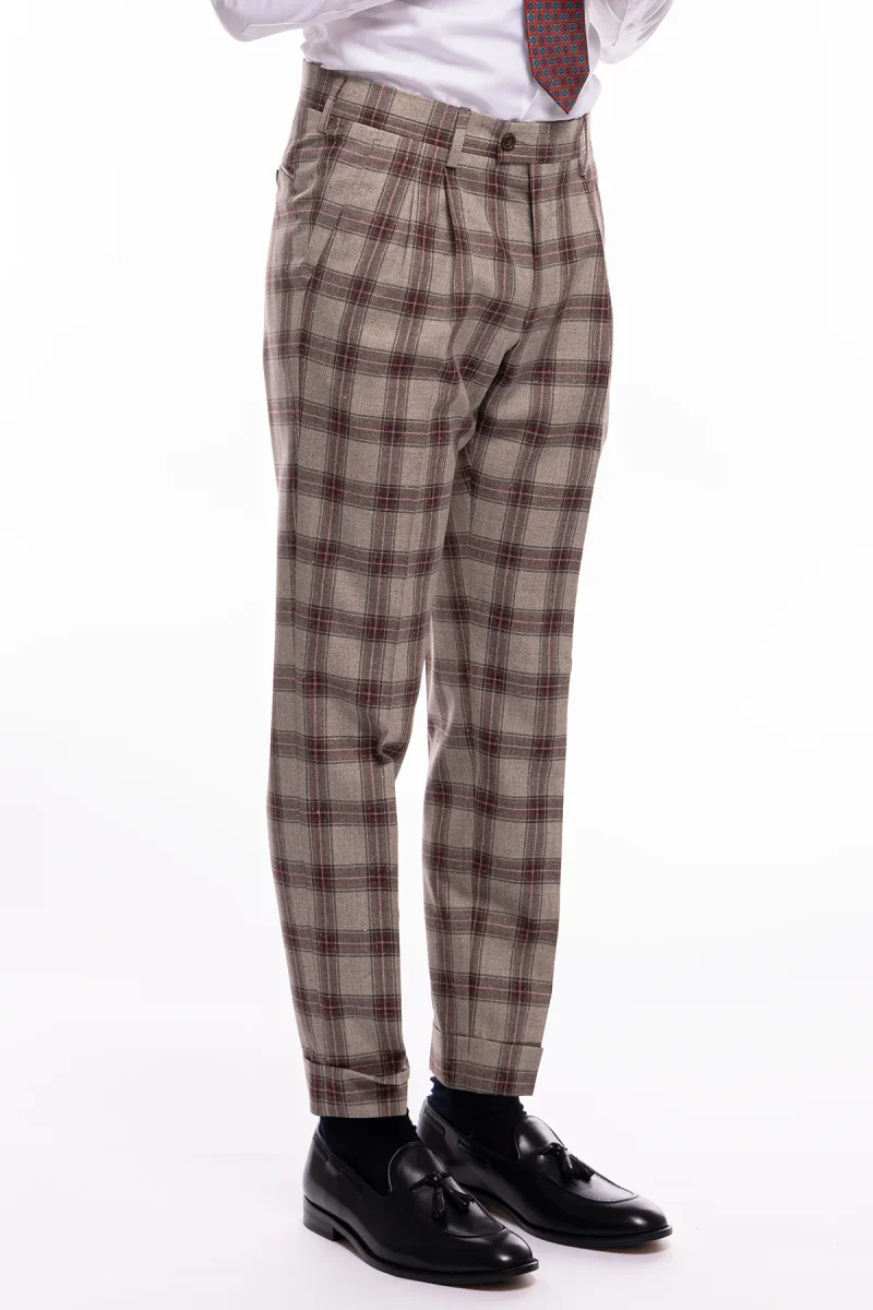Pantalone uomo vita alta beige a quadri bordeaux lana e seta Vitale Barberis Canonico