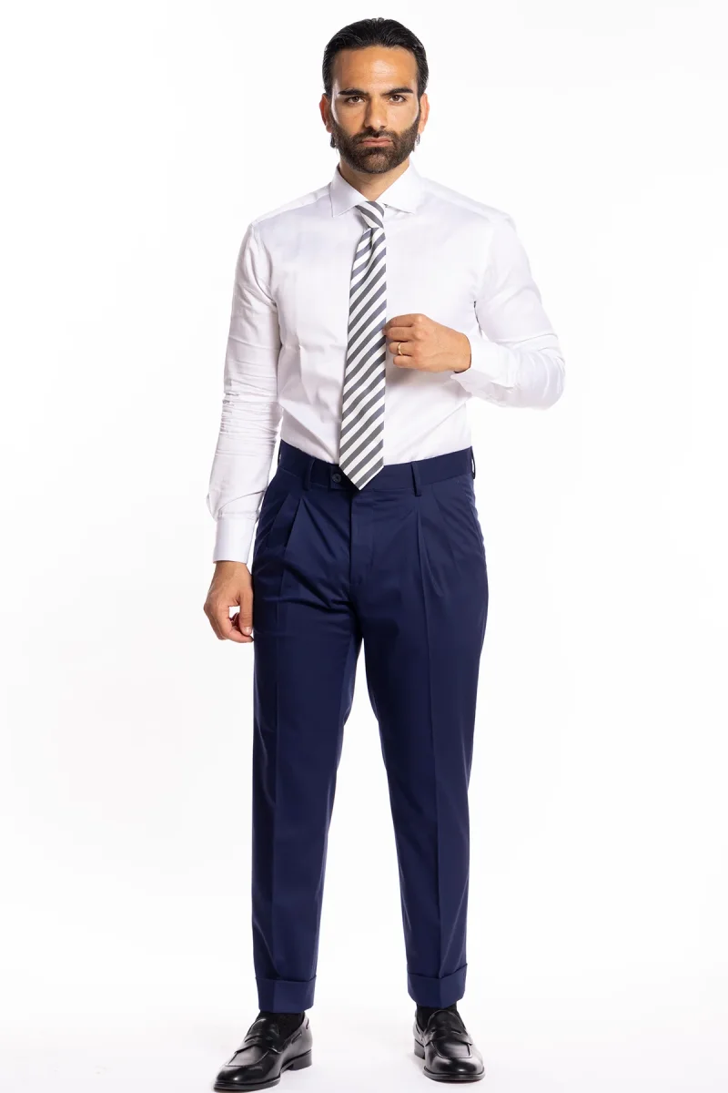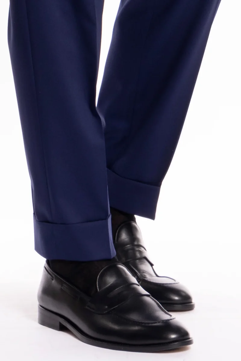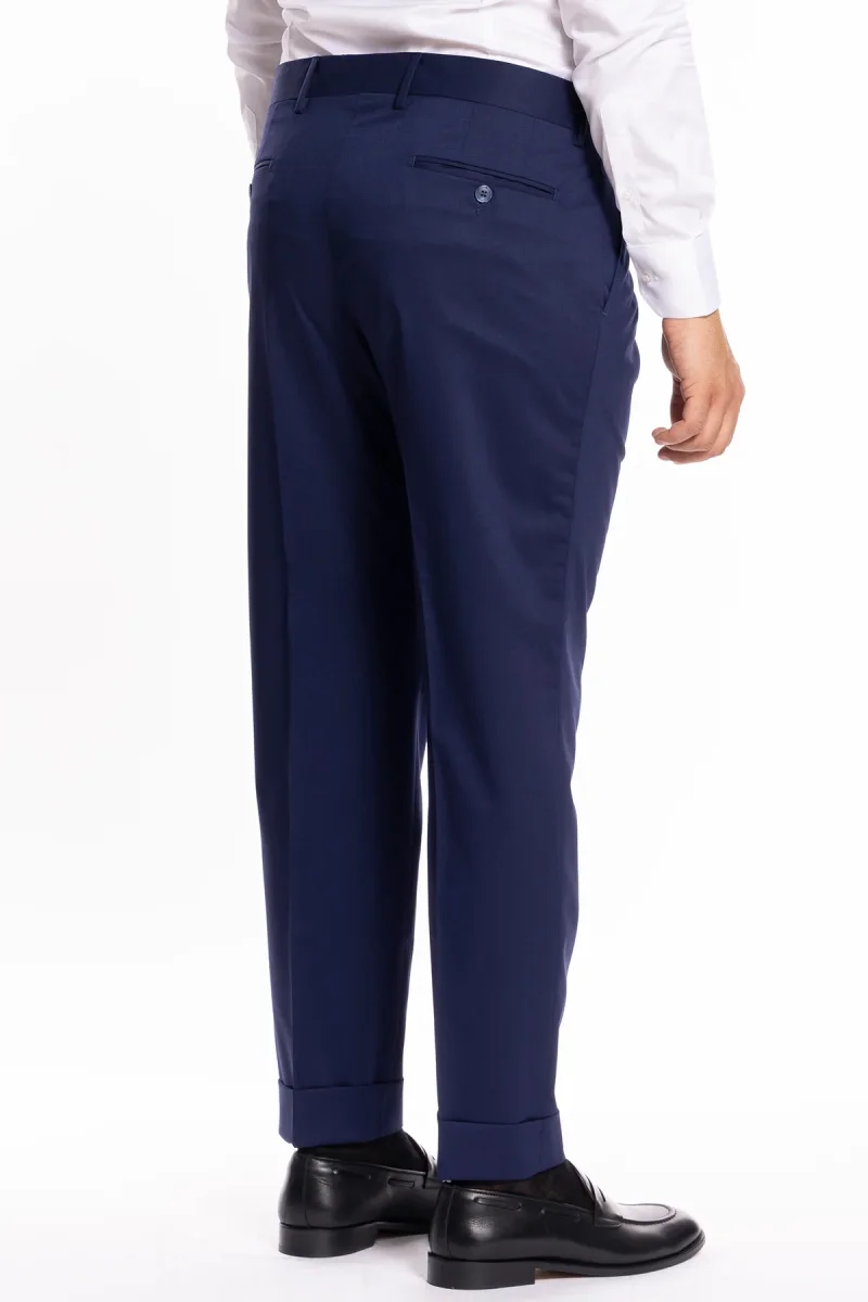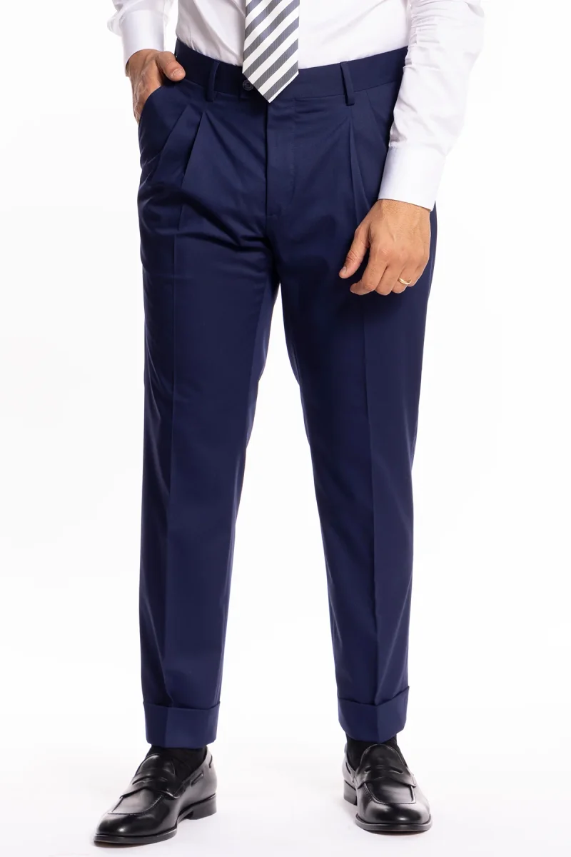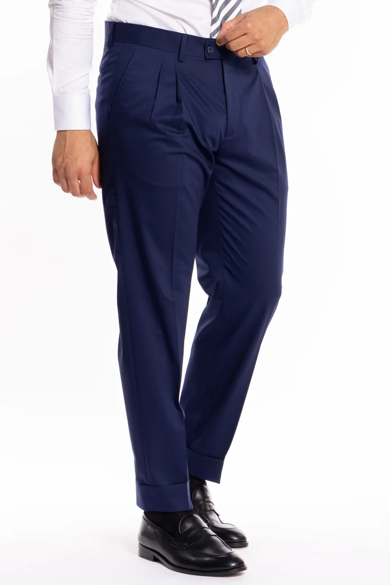 Pantalone uomo vita alta blu tinta unita con doppia pinces e risvolto 5 cm
