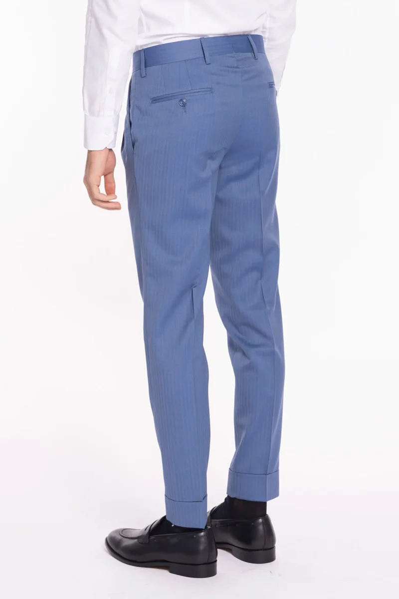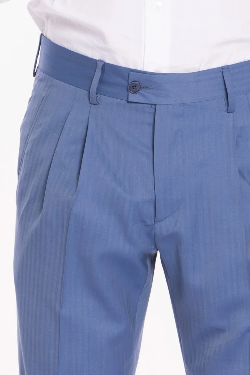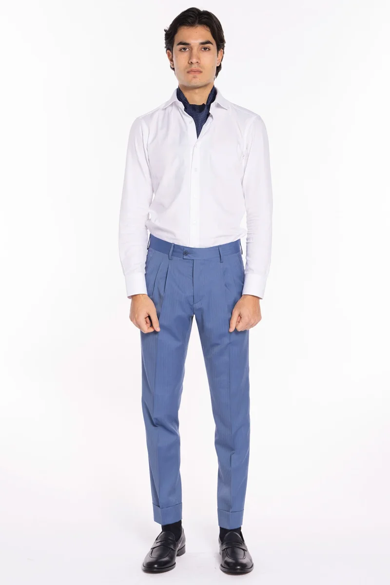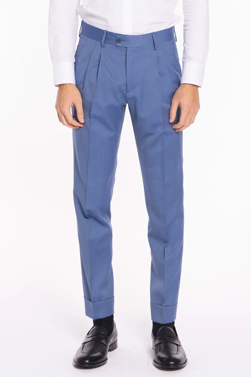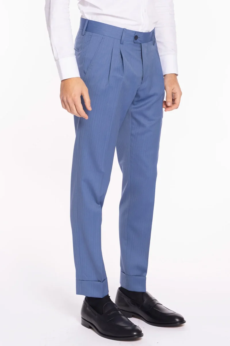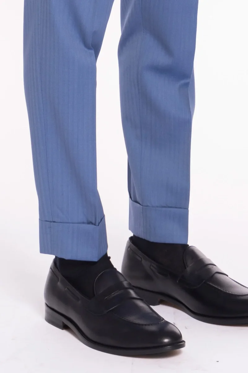 Pantalone uomo vita alta celeste Solaro fresco lana super 120’S e seta Holland & Sherry tasca con 2 pinces e risvolto 5cm