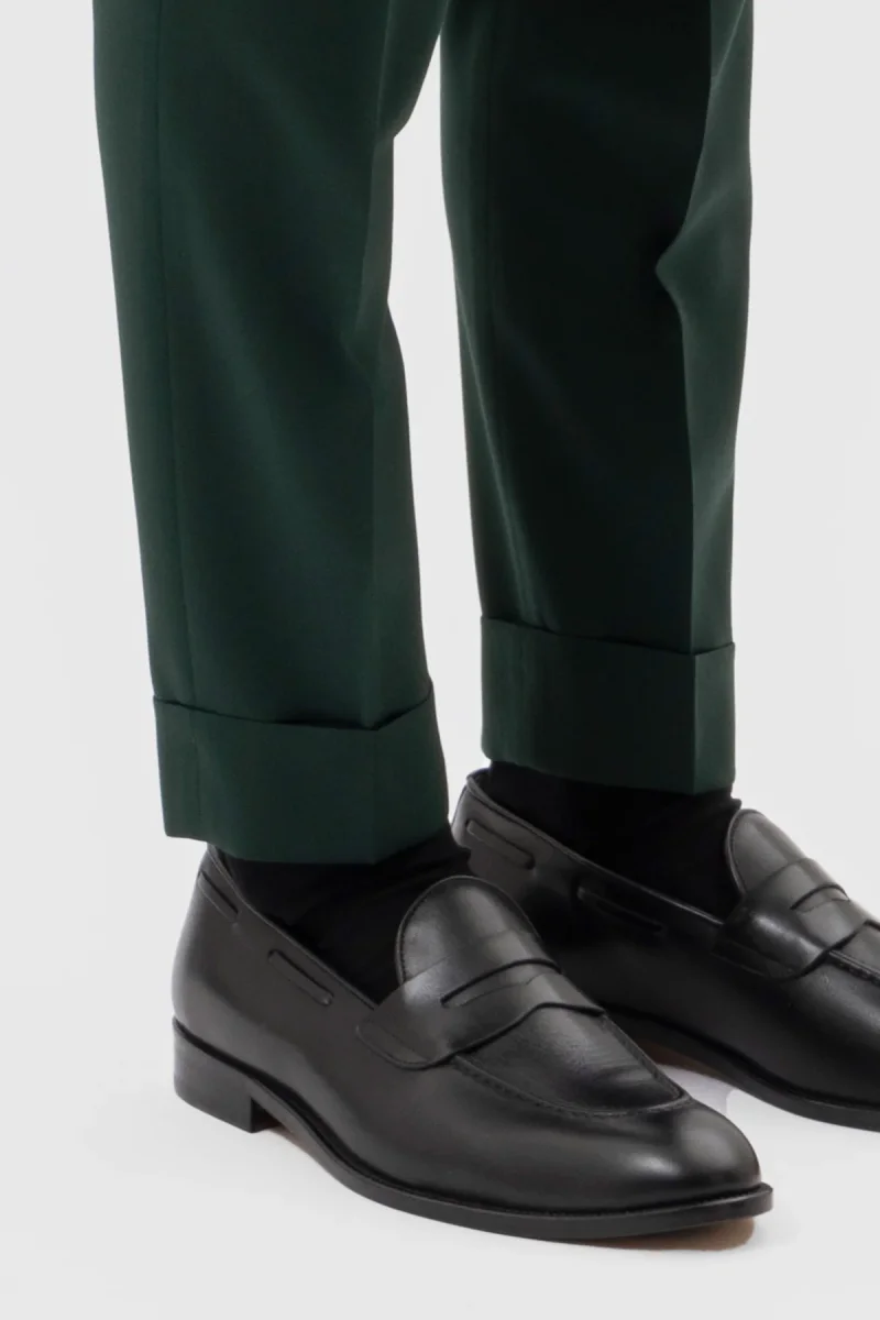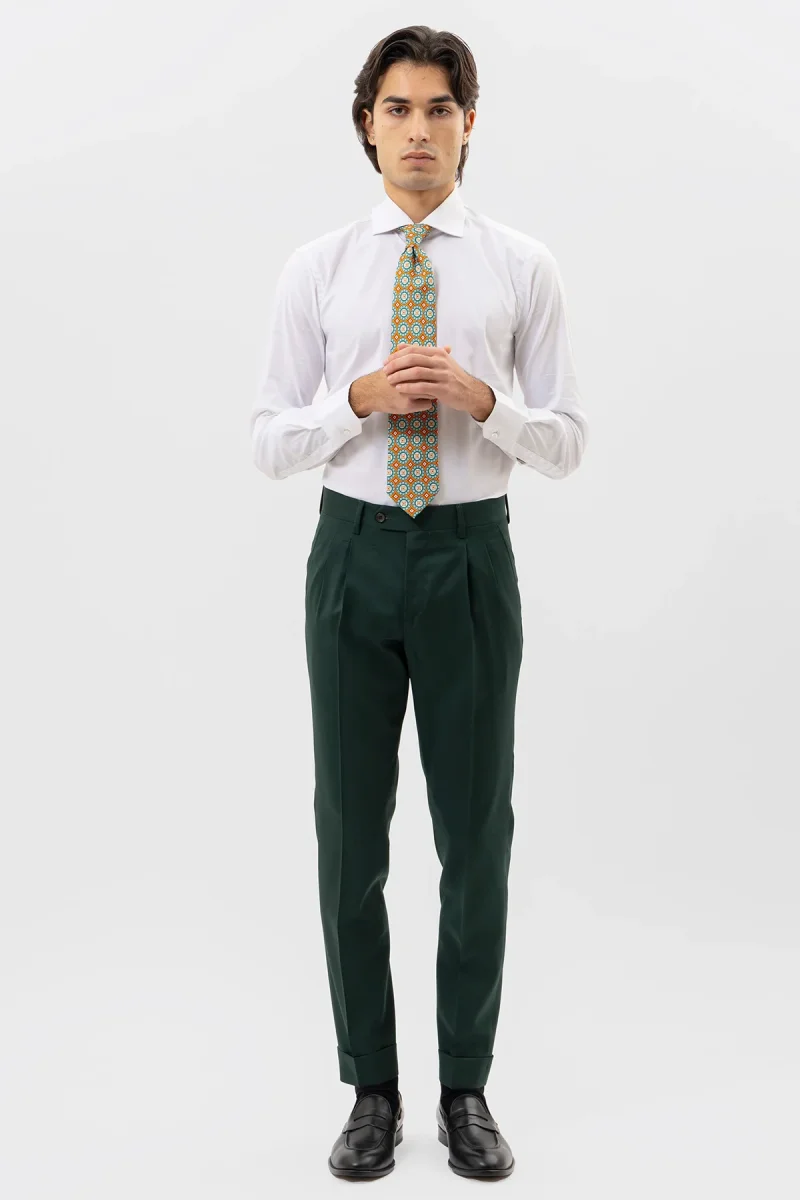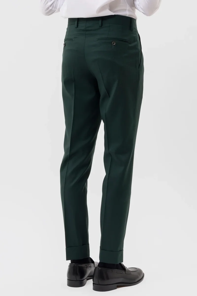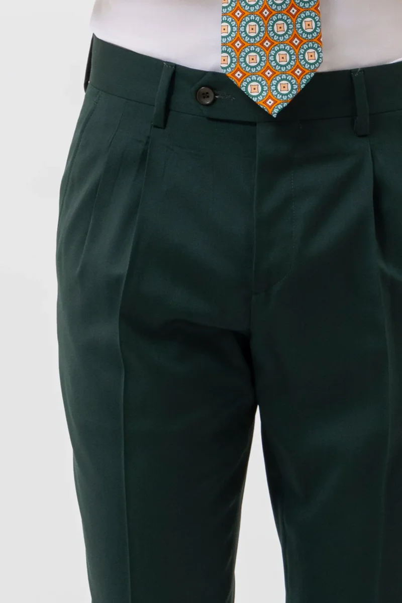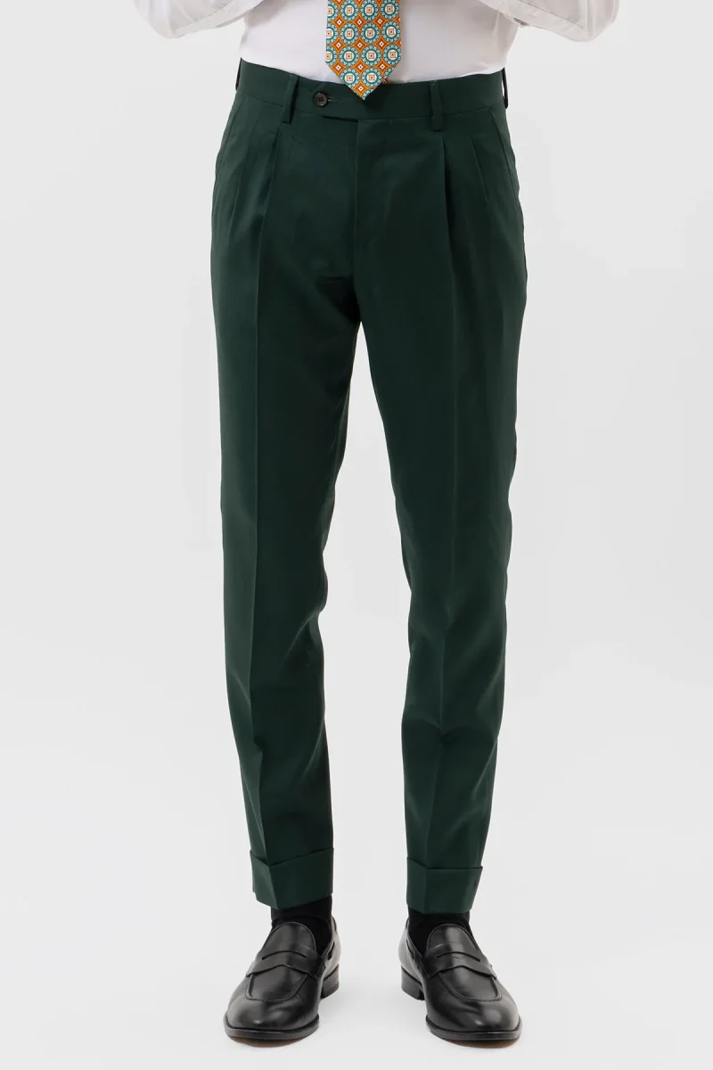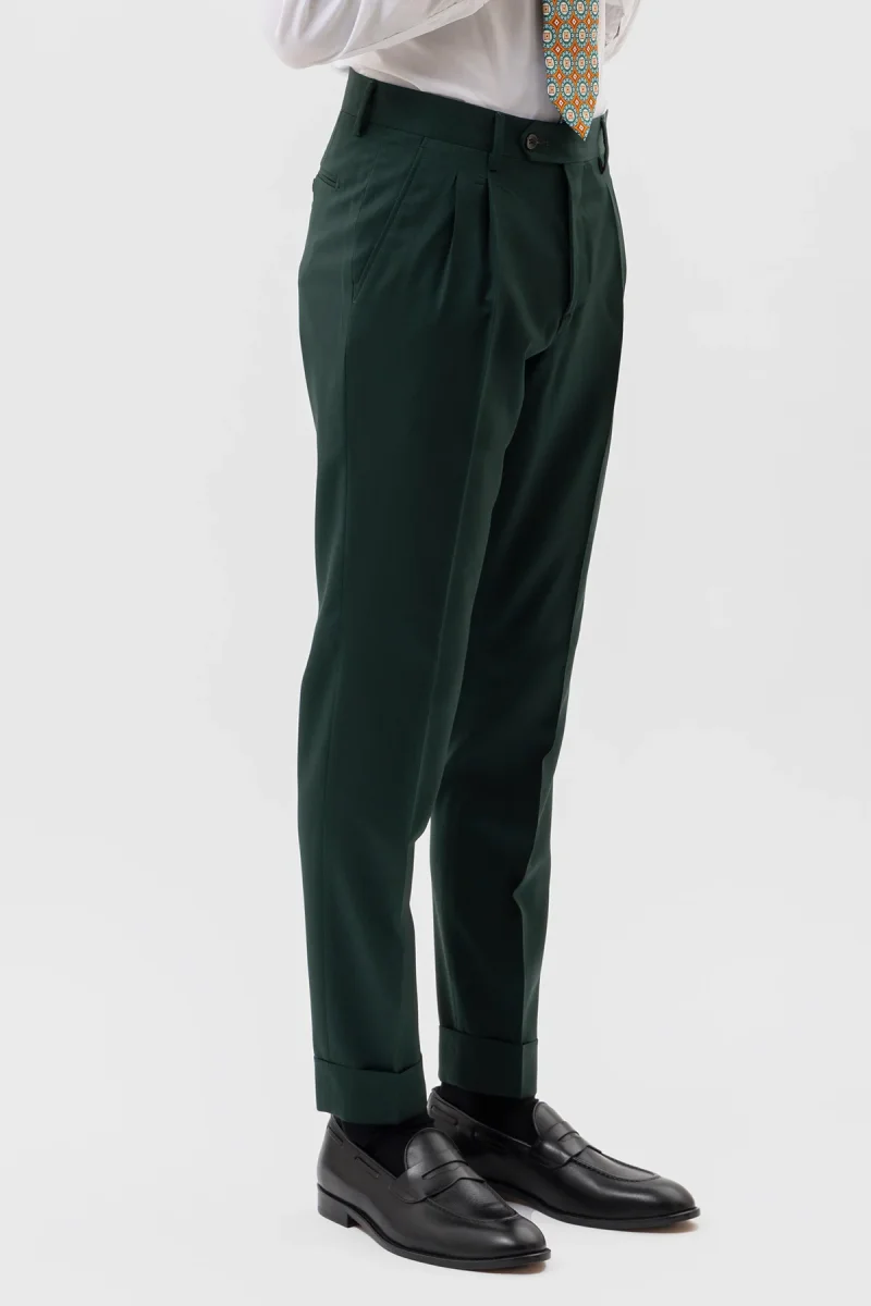 Pantalone Verde Bottiglia Vita Alta Uomo Fresco Lana Super 130’s Bristol Tessuti Con Doppia Pinces E Risvolto 5cm