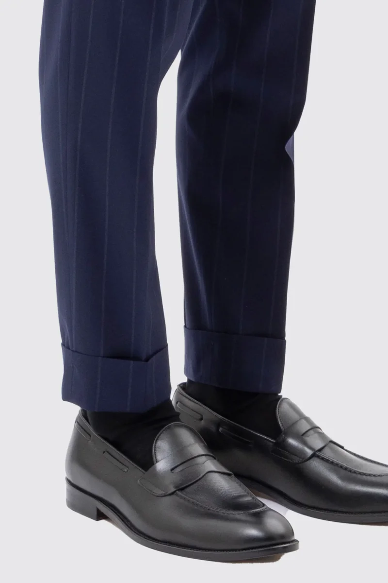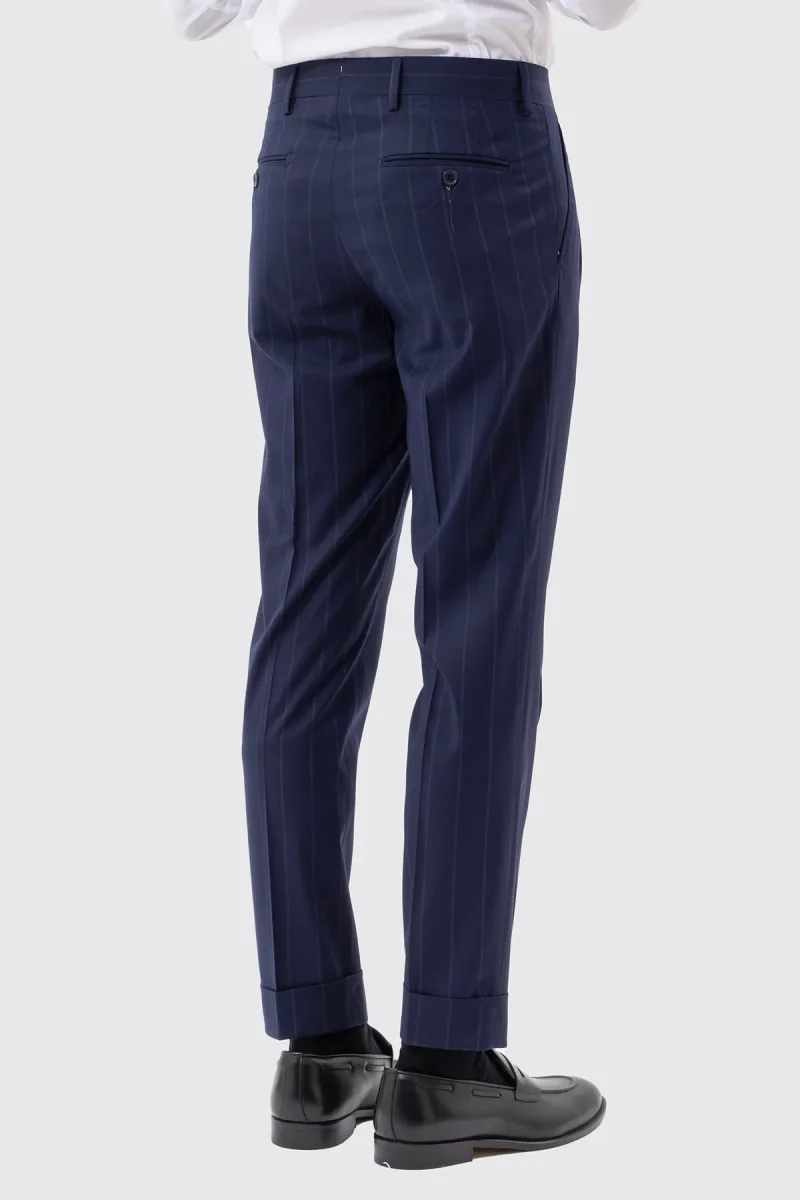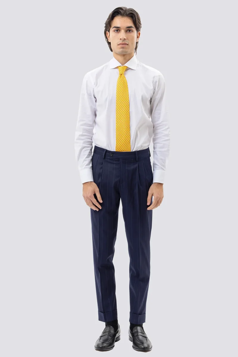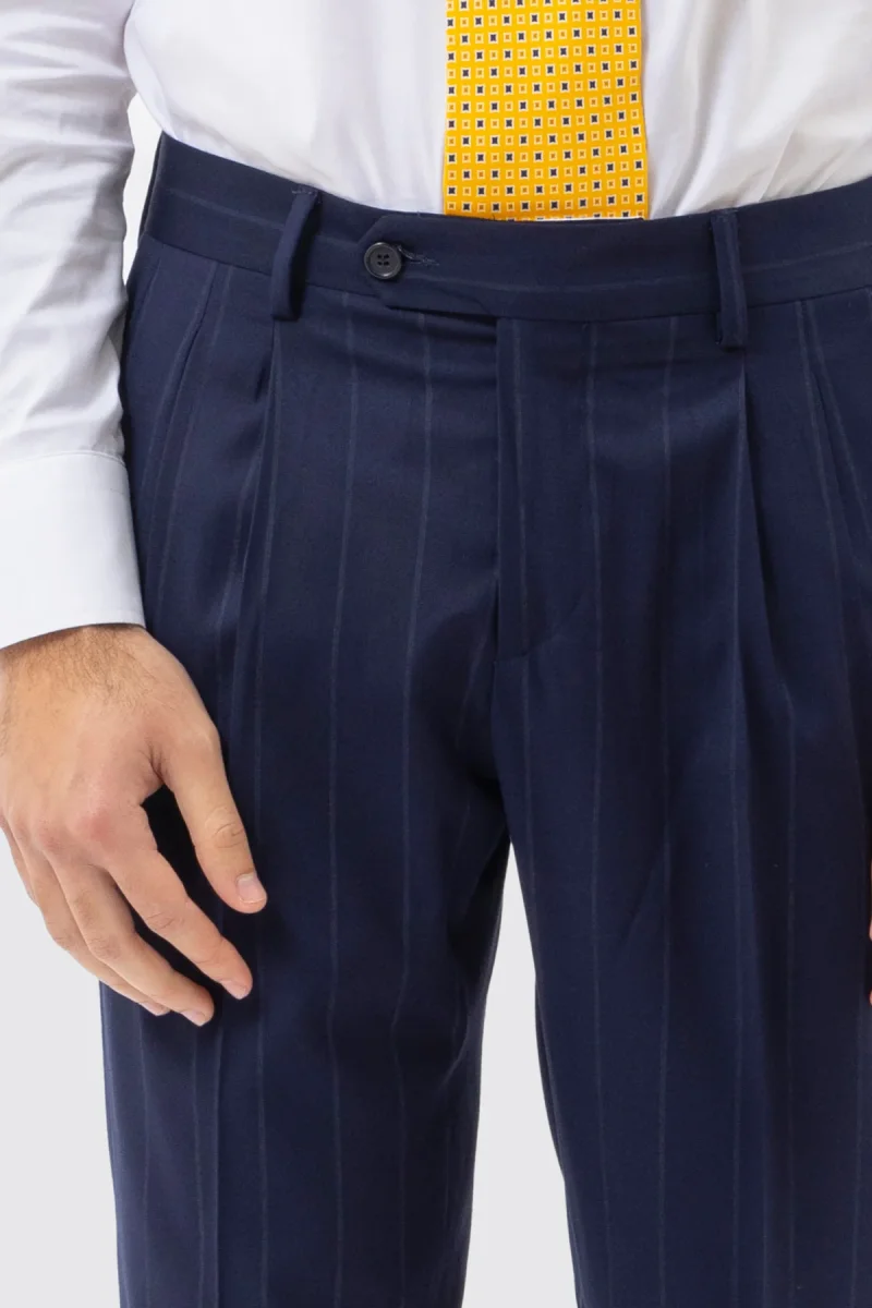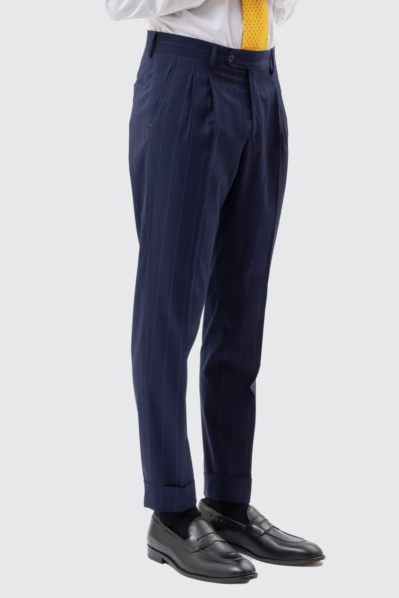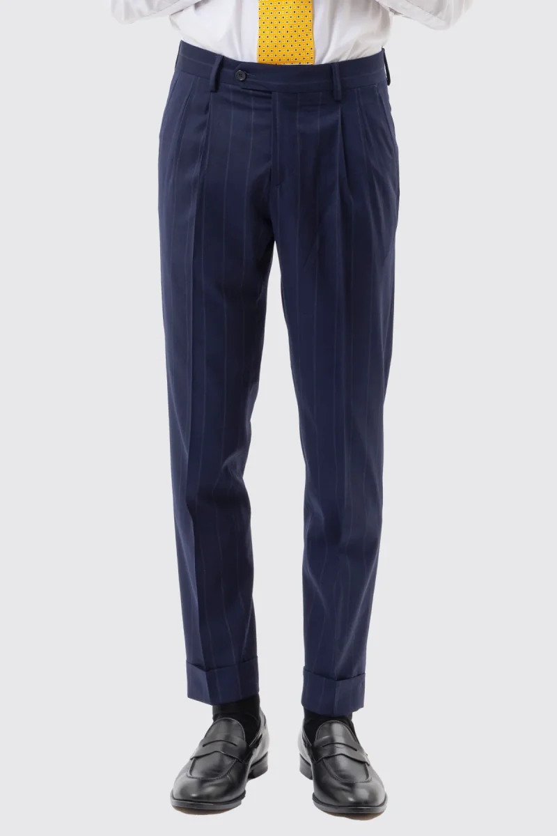 Pantalone uomo vita alta blu tinta unita con doppia pinces e risvolto 5 cm