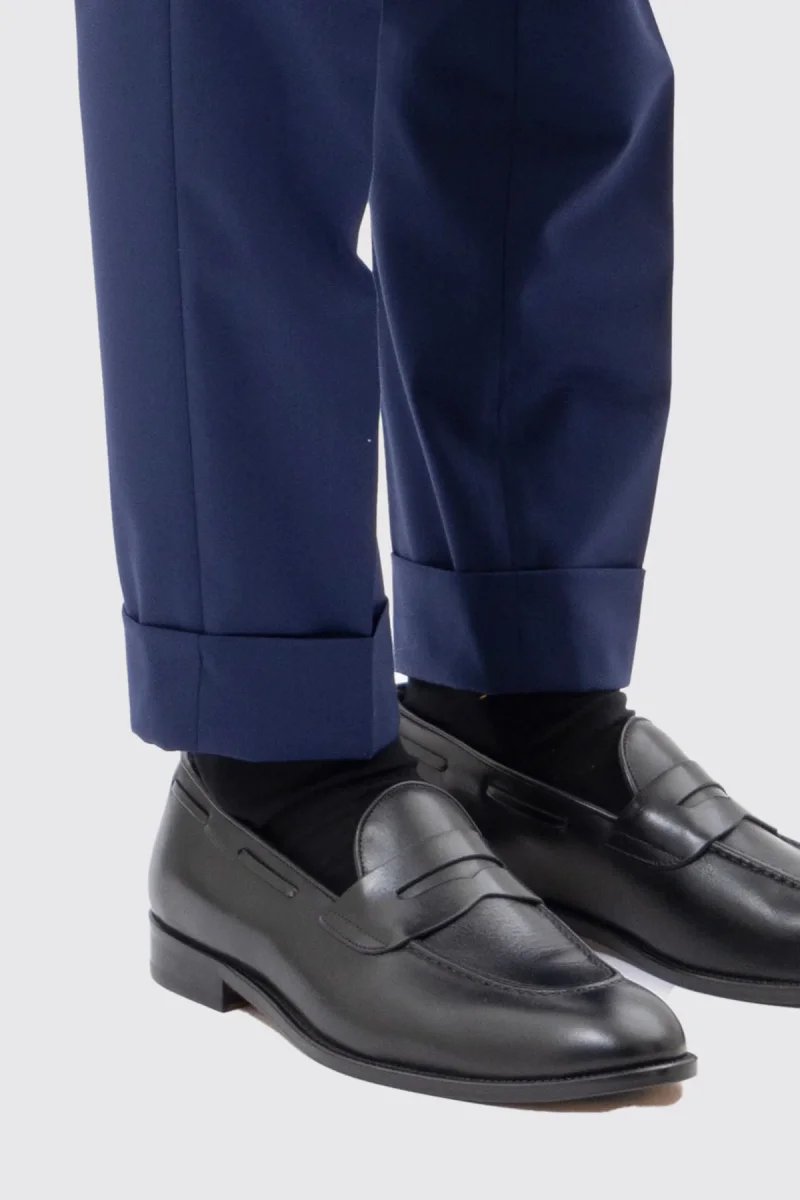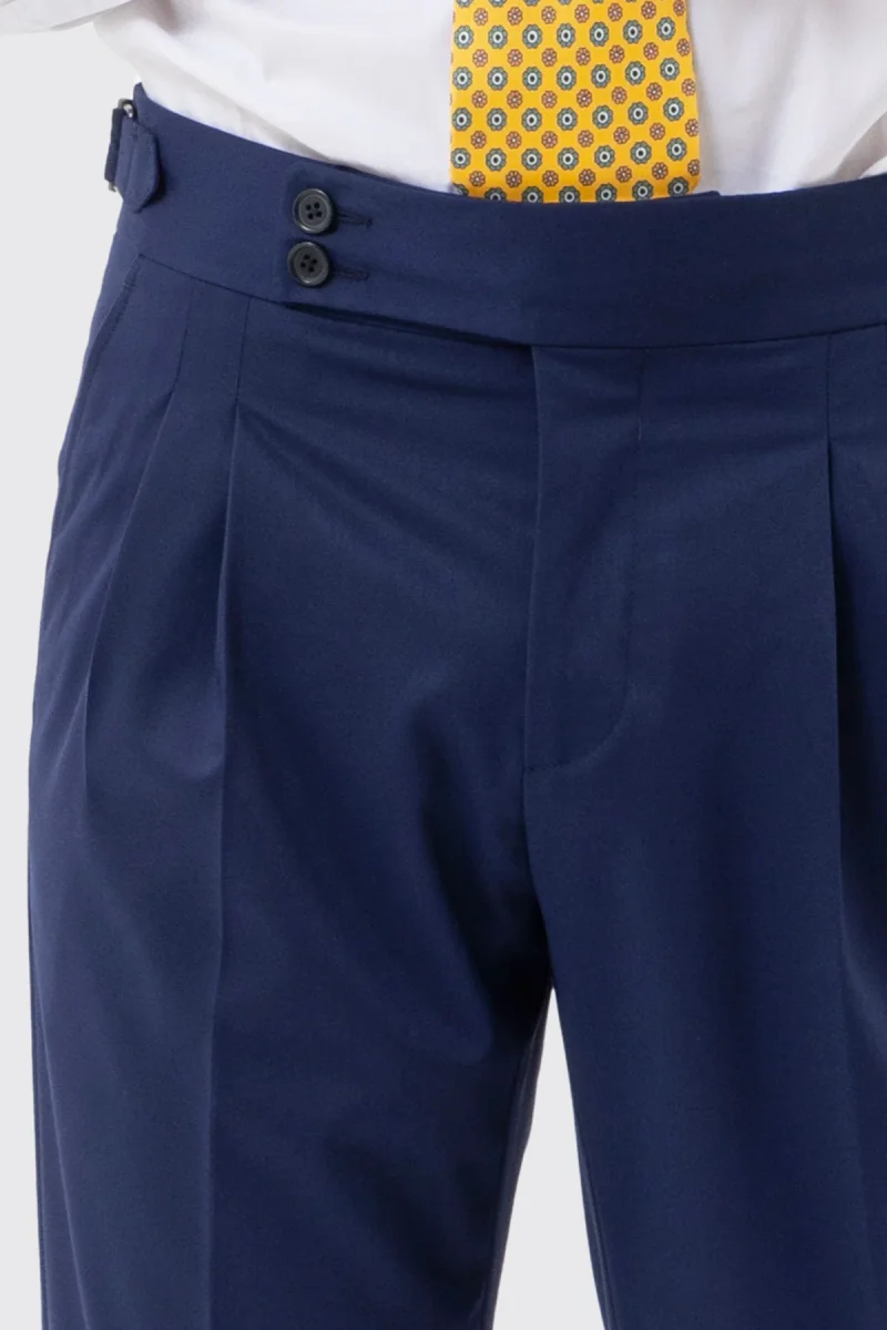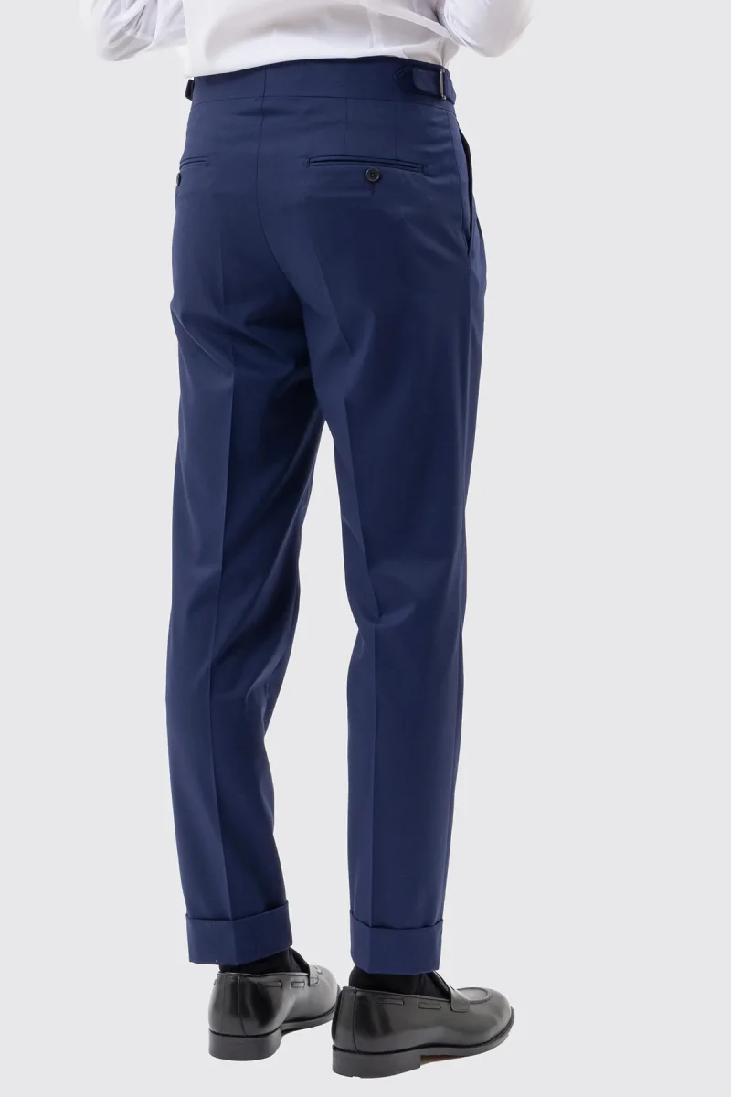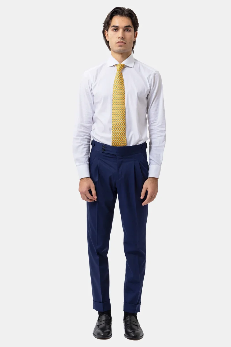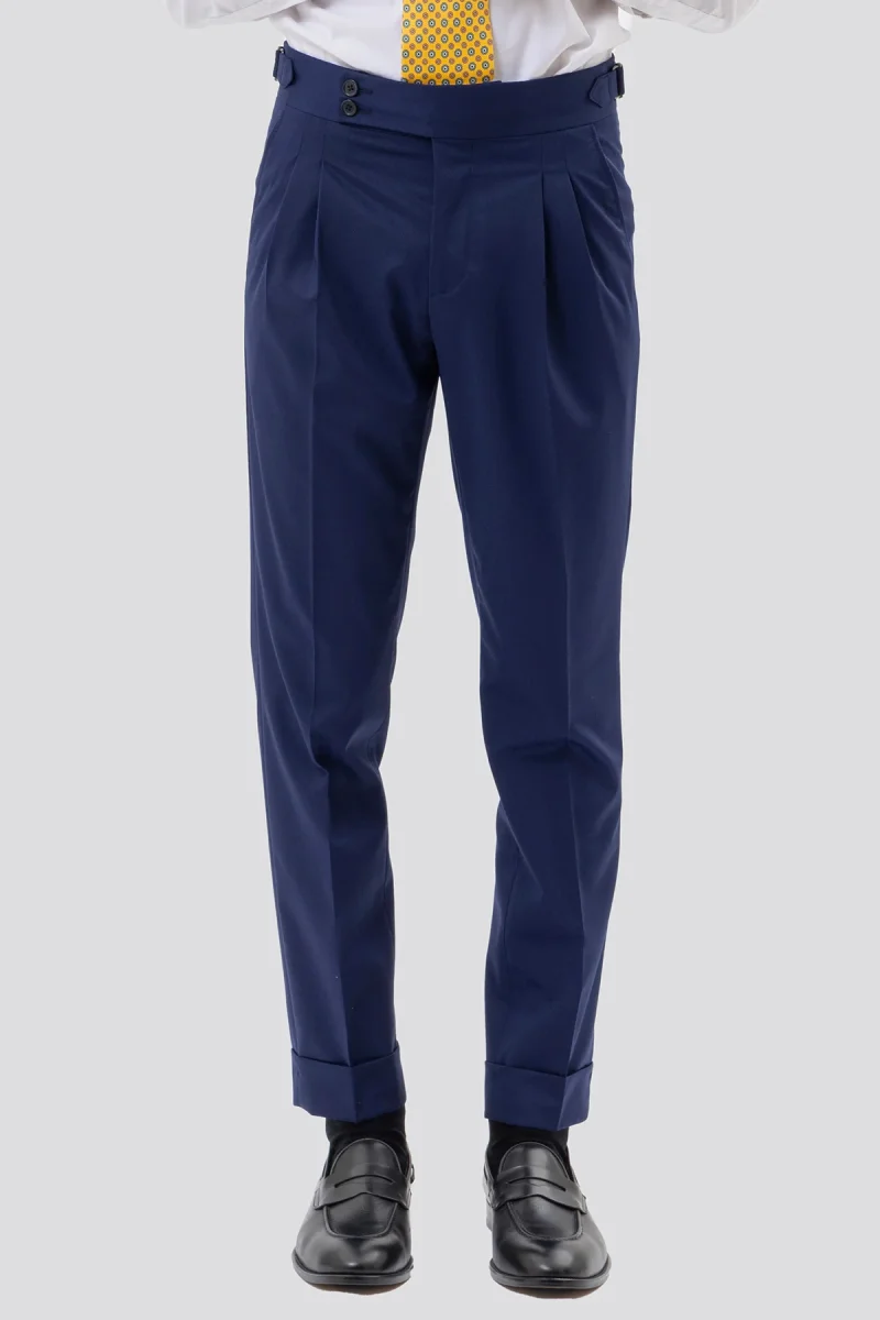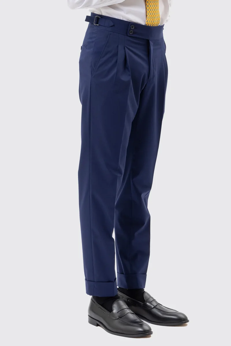 Pantalone Vita Alta Blu Tinta Unita Uomo Con Doppia Pinces Fibbie Laterali E Risvolto 5 Cm