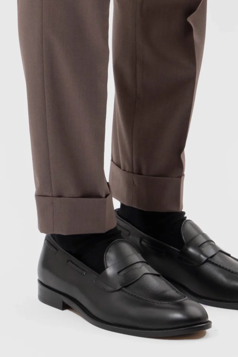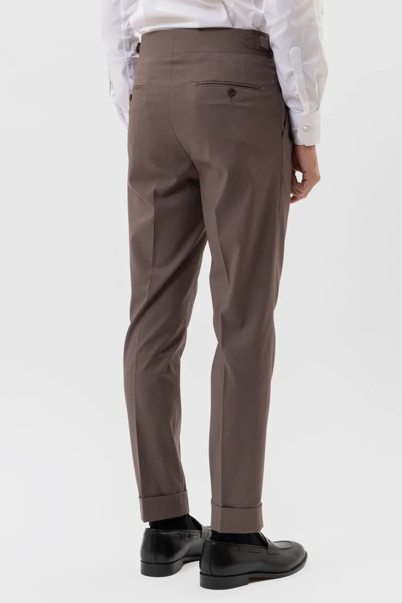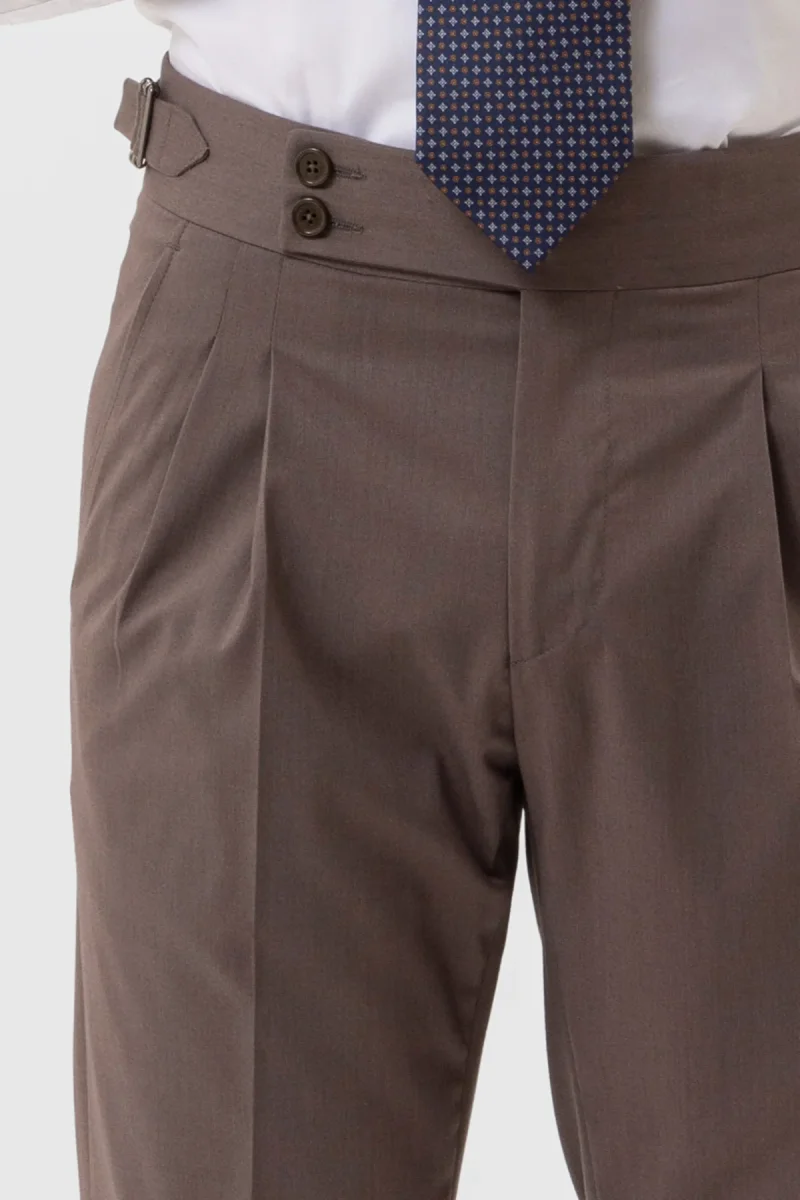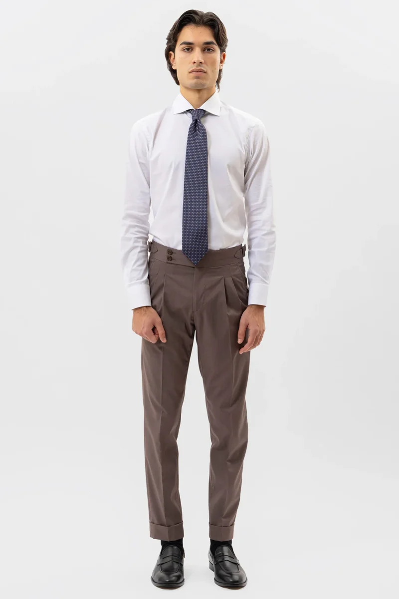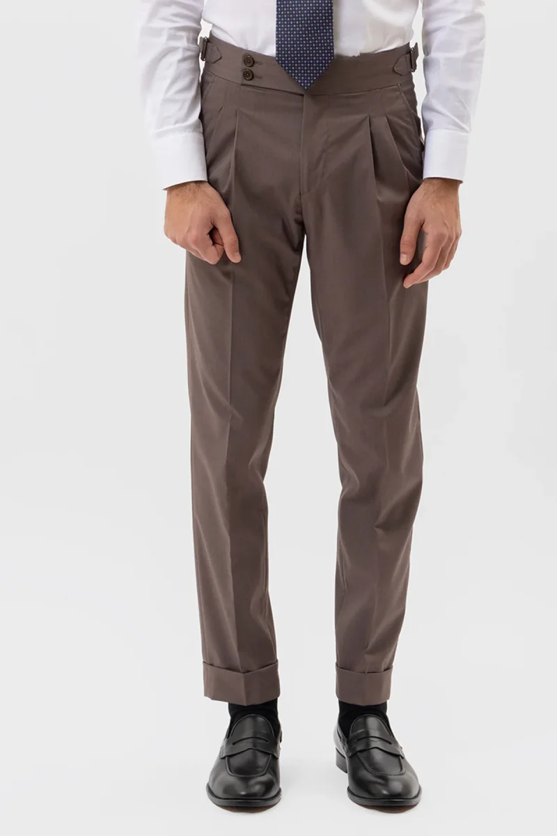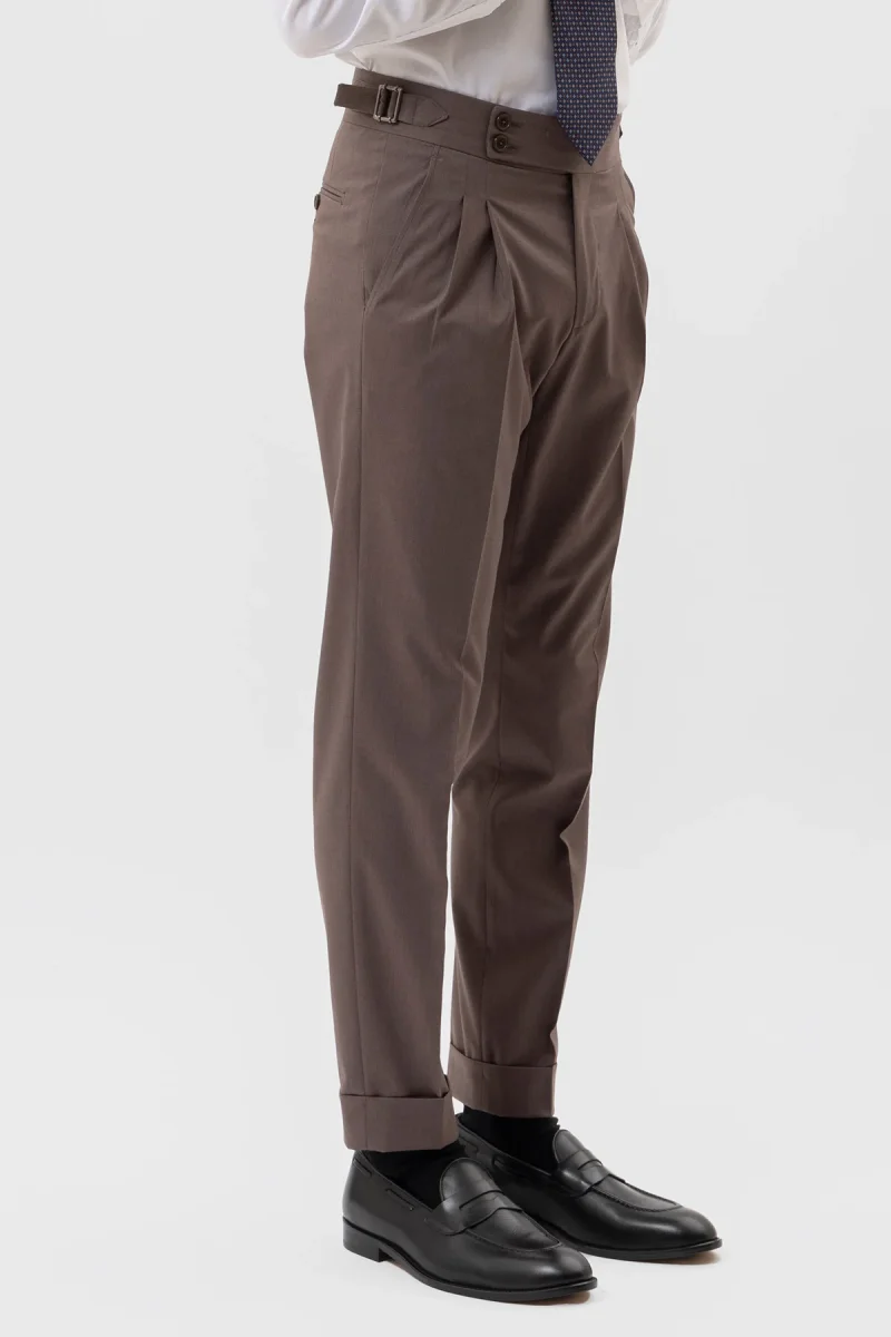 PANTALONE VITA ALTA FANGO TINTA UNITA UOMO CON DOPPIA PINCES FIBBIE LATERALI E RISVOLTO 5 CM
