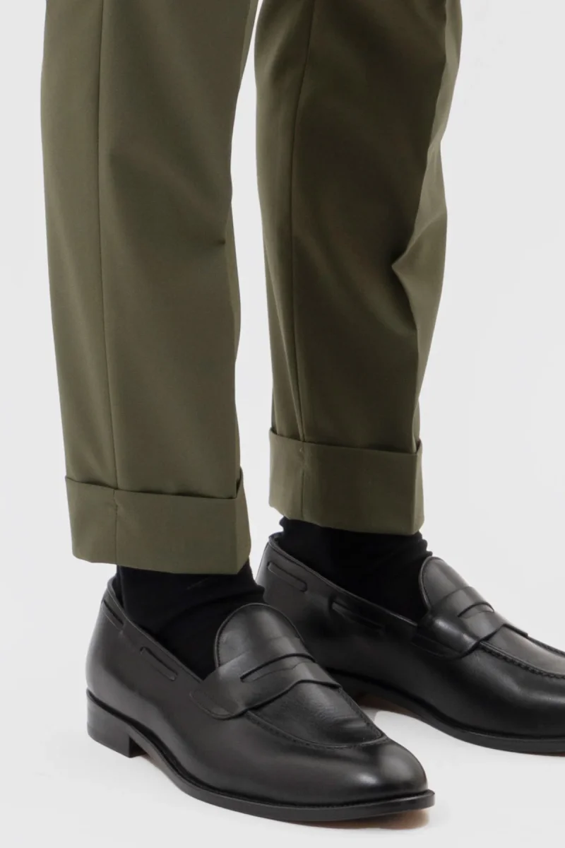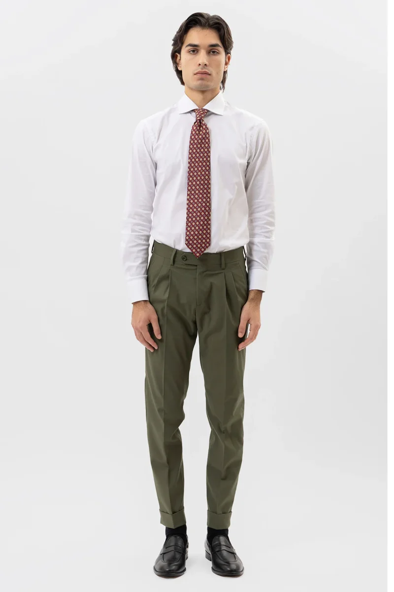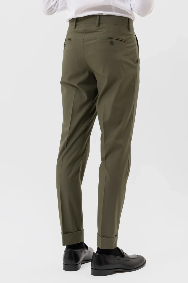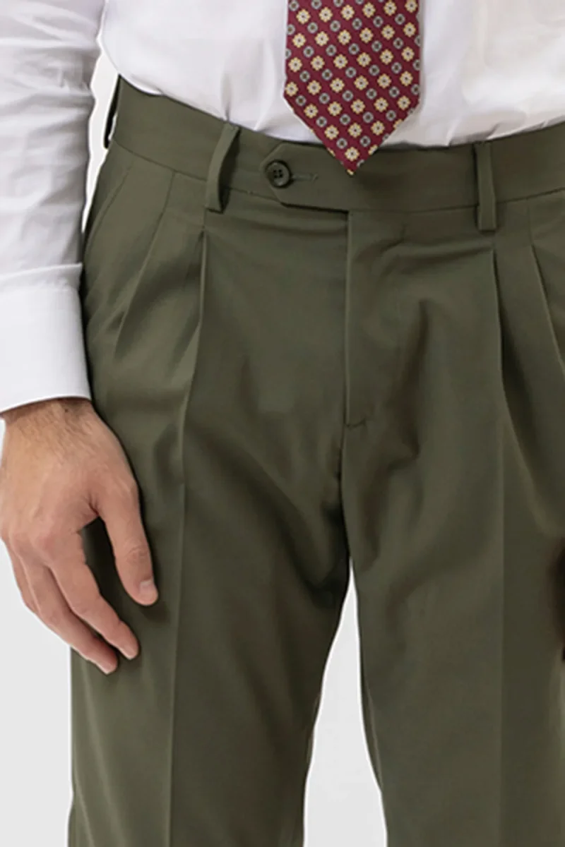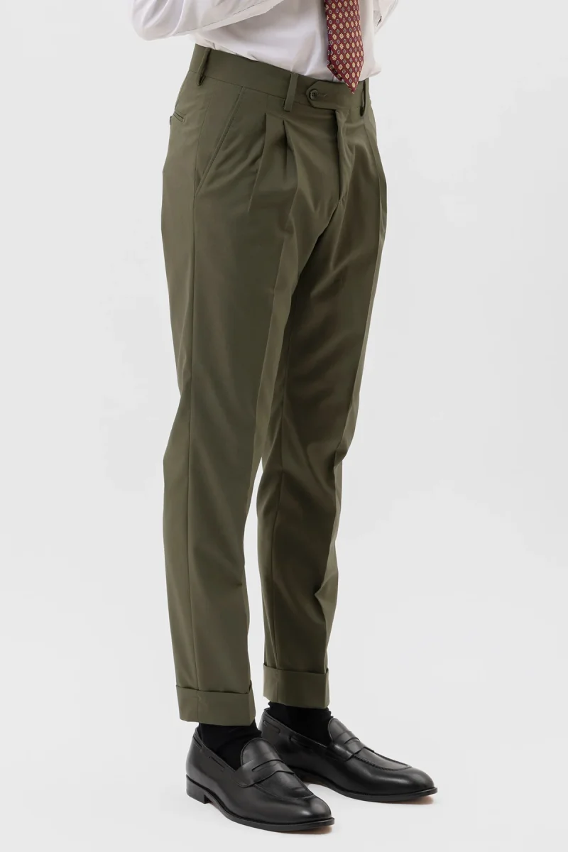 PANTALONE VITA ALTA VERDE MILITARE UOMO EFFETTO FRESCO LANA CON DOPPIA PINCES E RISVOLTO 5 CM
