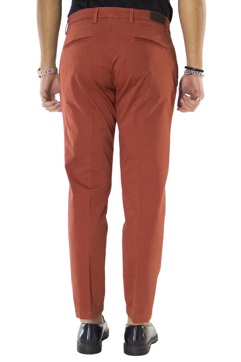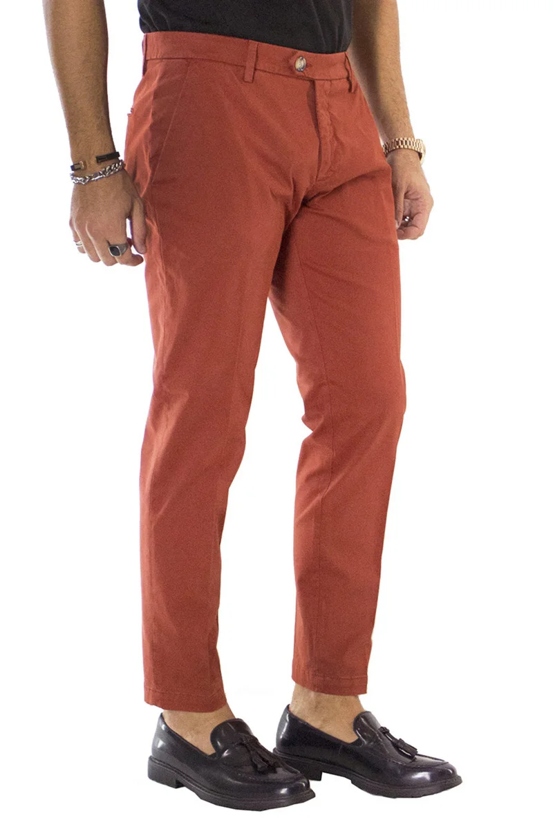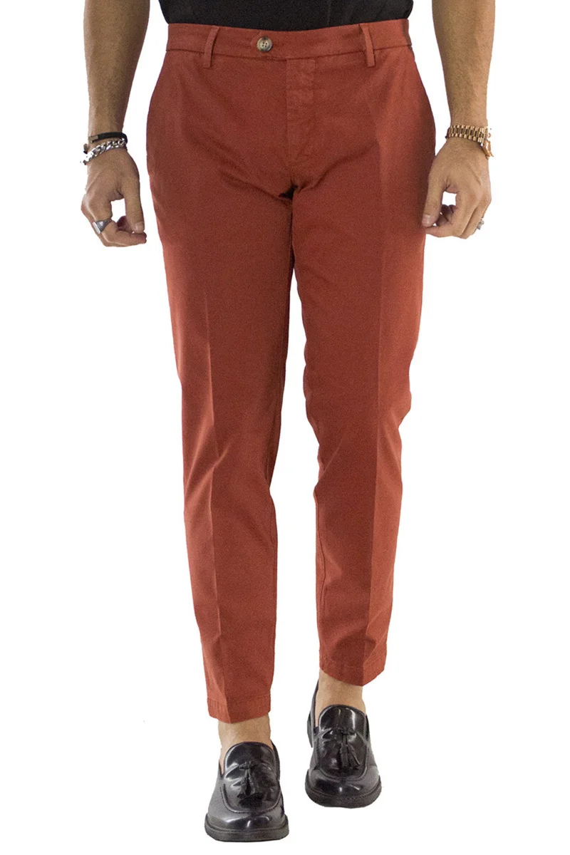 Il pantalone uomo in cotone coccio di CARILLO MODA e ormai per i nostri clienti sinonimo di garanzia e qualita. Questo modello, viene scelto da una tipologia di persone che amano vestire bene e nello stesso tempo scelgono la comodita. Infatti grazie alle caratteristiche del tessuto elasticizzato permette a chi lo indossa di scegliere la sua misura perfetta e non preoccuparsi delle limitazioni dei movimenti nonostante la sua vestibilita’ slim.