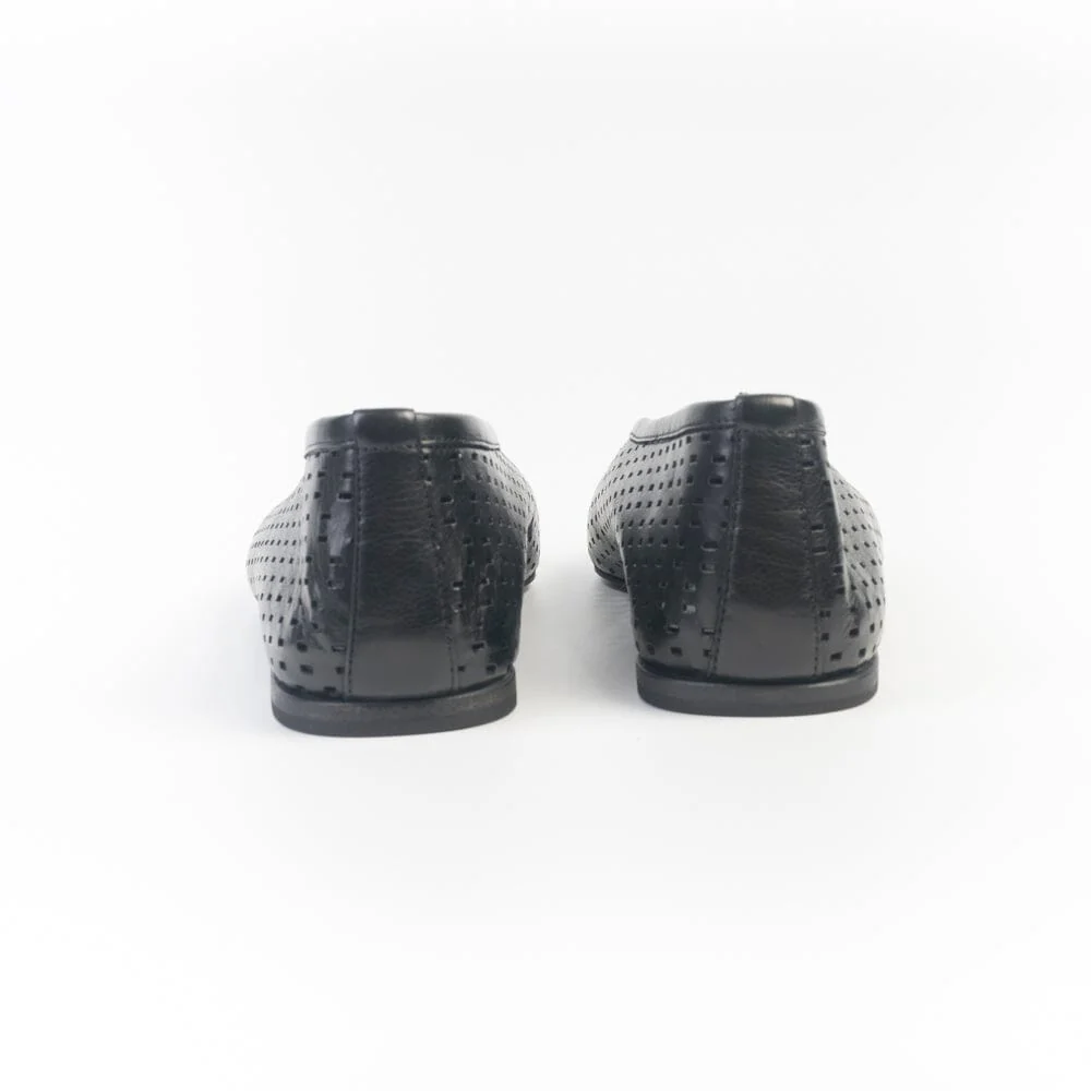 Originale ballerina di Pantanetti realizzata in morbida pelle di colore nero con originale lavorazione taglio laser. Forma a punta. Soletta interna in morbida pelle, costruzione a sacchetto. Suola in cuoio.
