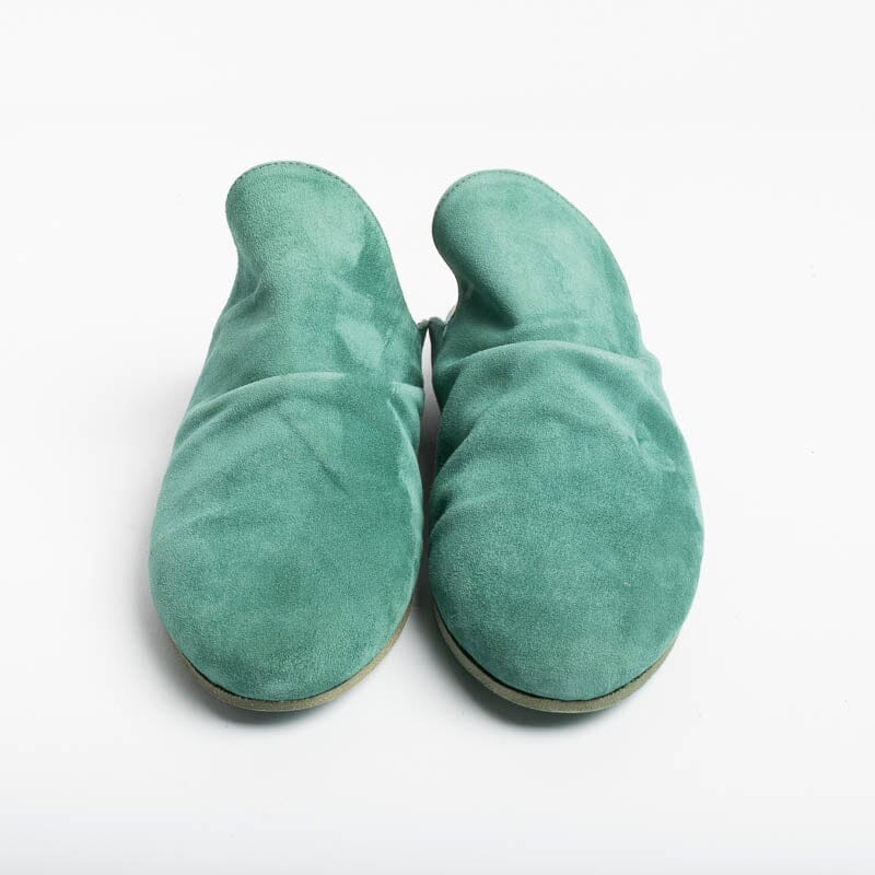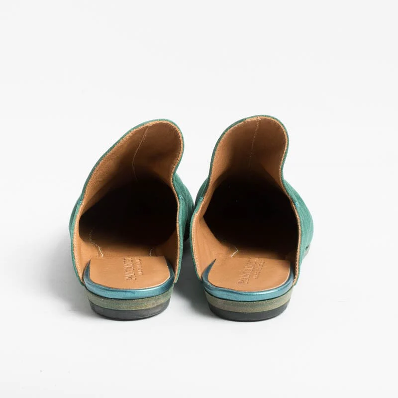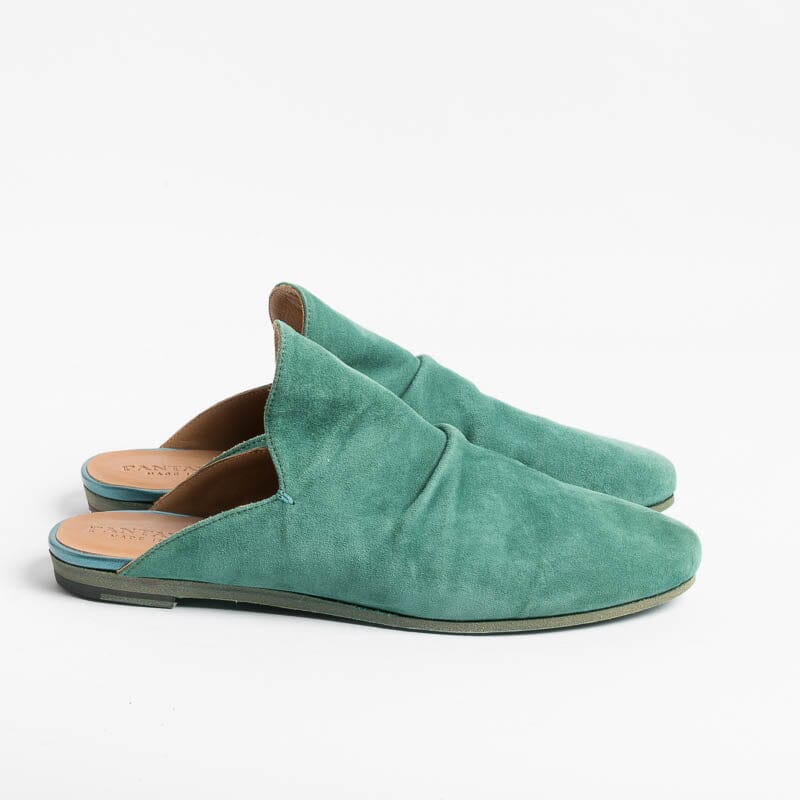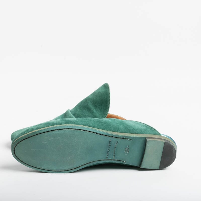 Sabot di Pantanetti realizzato in morbida pelle scamosciata di colore verde dalla forma avvolgente sul collo del piede con morbida arricciatura. Suola in cuoio. Lavorazione artigianale.
