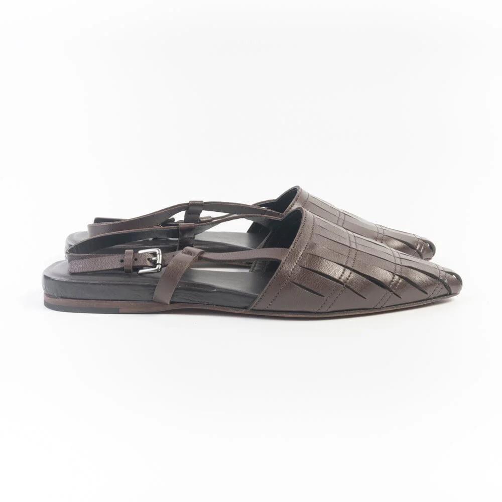 Sling Back di Pantanetti realizzata in morbida pelle di colore cacao con lavorazione a fasce taglio laser. Forma affusolata. Chiusura con cinturino in pelle regolabile a lato caviglia. Sottopiede in morbida pelle di colore marrone. Suola in cuoio e tacco di 2 cm.