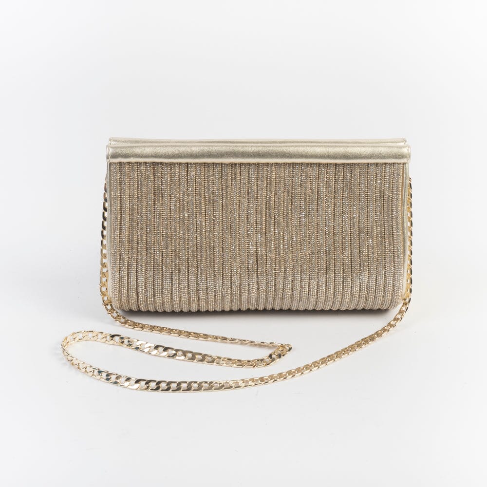 Pochette di Paola Fiorenza, realizzata in pelle laminata di colore platino con applicazione di filo in micro cristalli in nuance. Interno foderato in tessuto. Chiusura con due bottoni metallici. In dotazione tracolla a catena di colore oro.